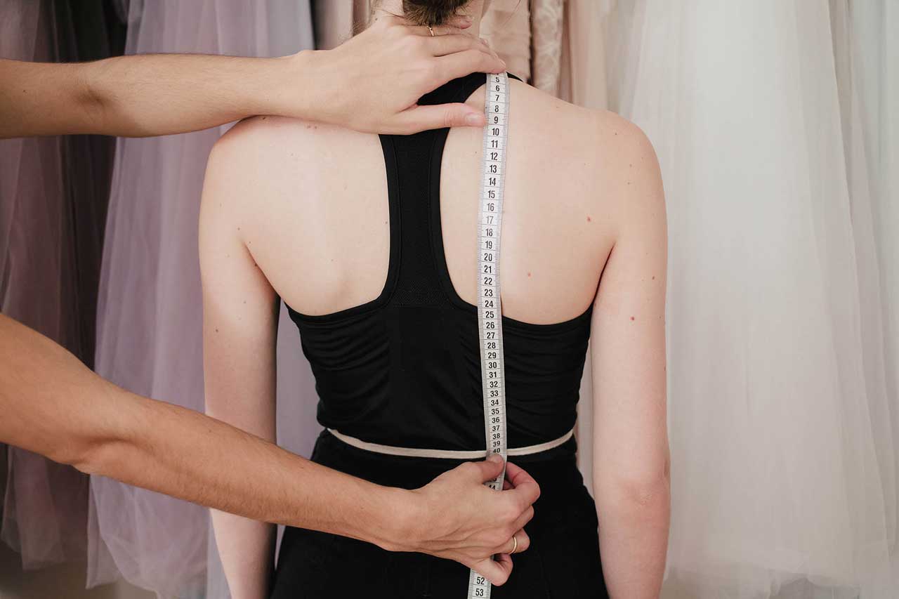 Снимать мерки нужно в том белье, с которым Вы будете одевать свадебное или вечернее платье. Речь идет не только о бюстгальтере, но и об утягивающем белье, колготках.