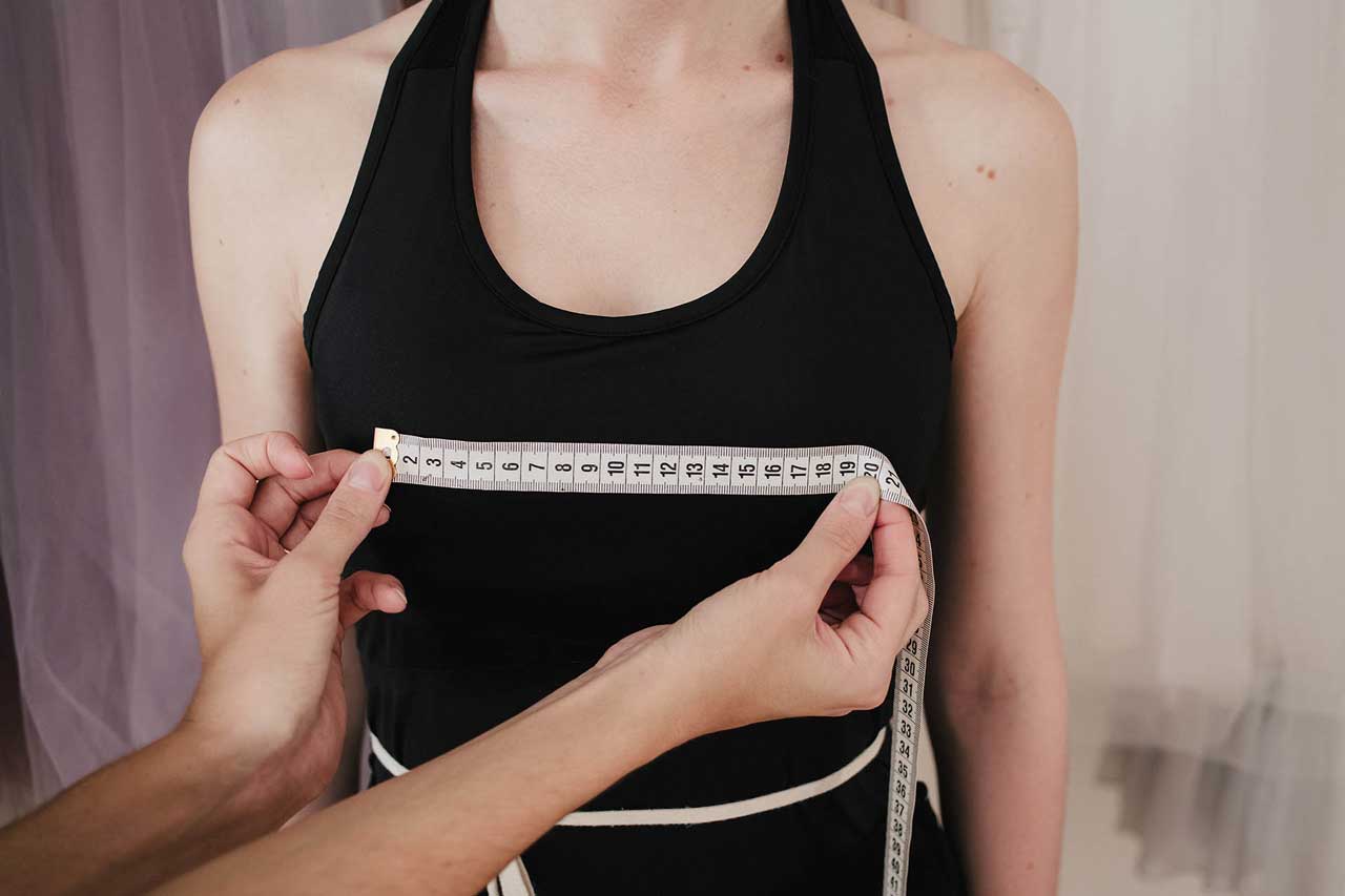 Сантиметровая лента должна проходить горизонтально по линии лопаток, касаясь верхним краем задних углов подмышечных впадин, затем по подмышечным впадинам, спереди – над грудными железами.