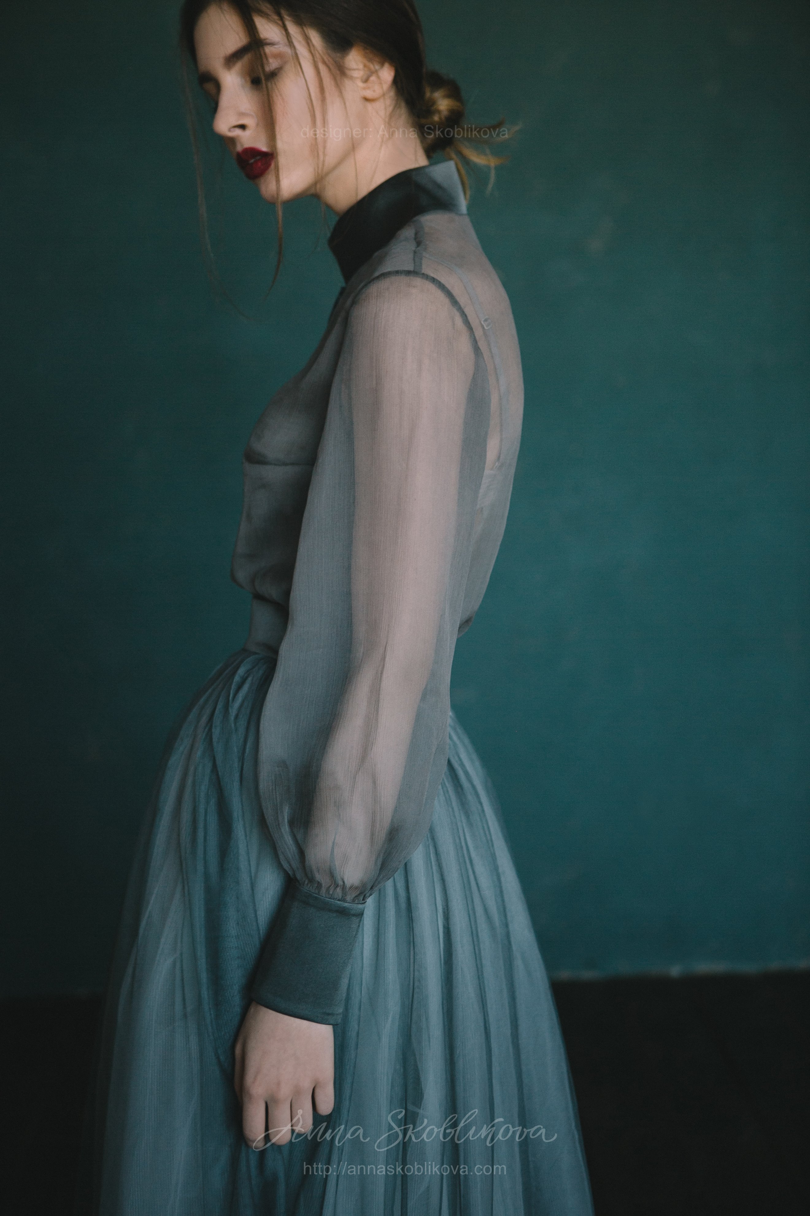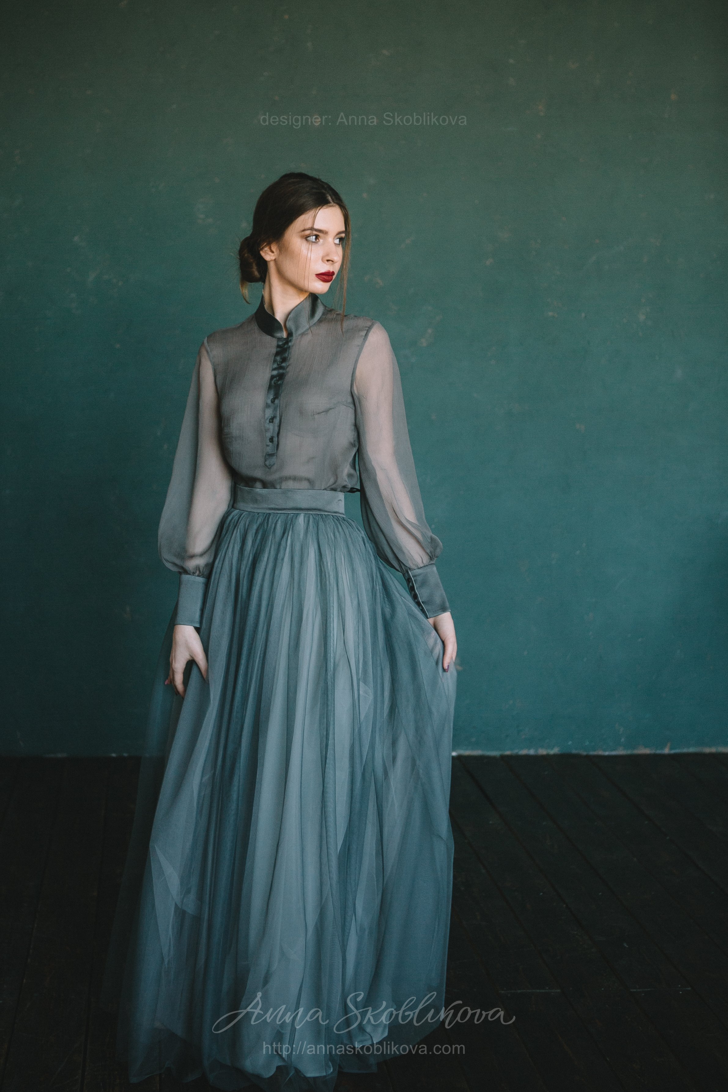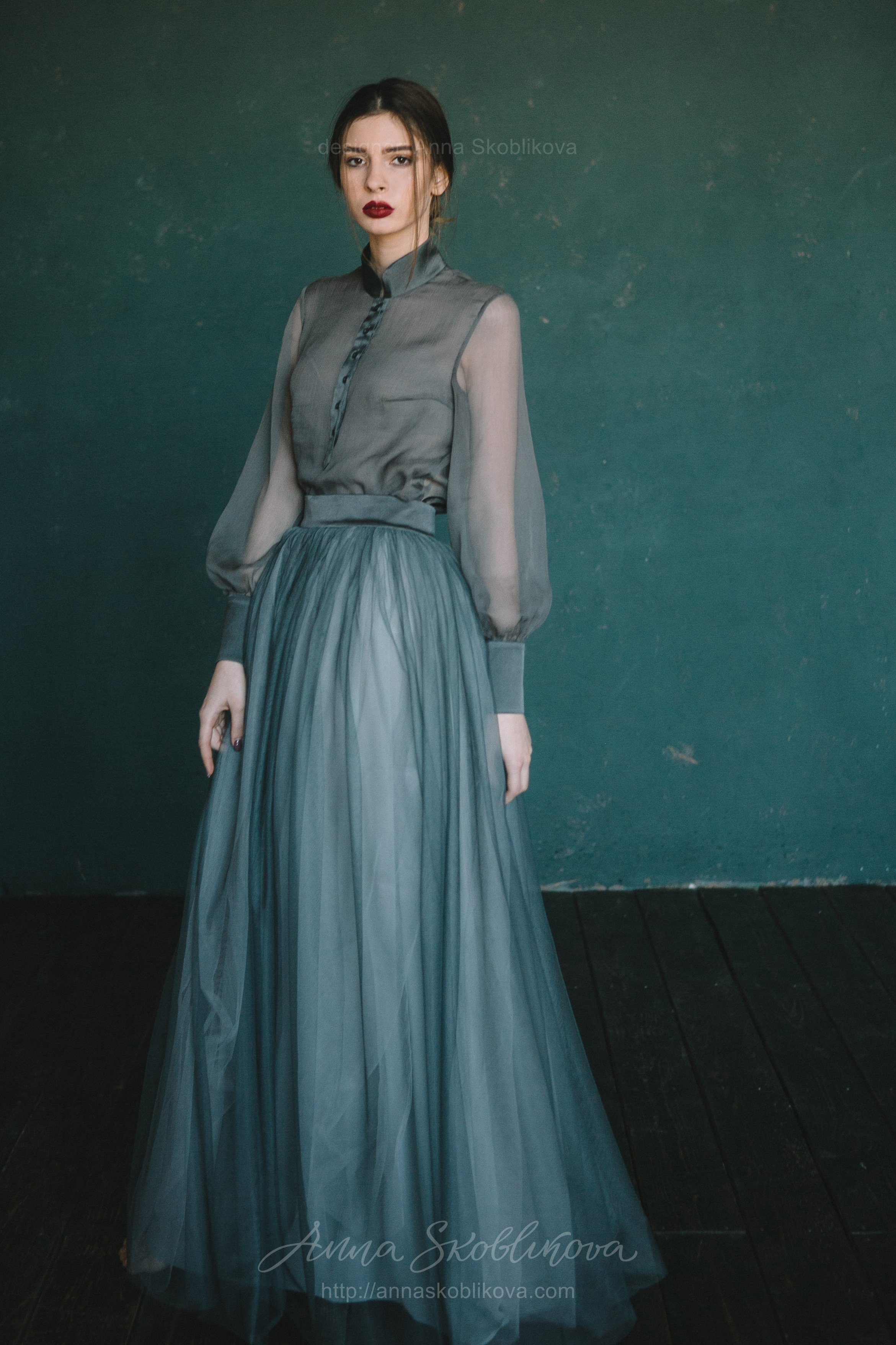 Бирюзовое свадебное платье из блузки и юбки вечерний комплект – блуза из креш-шелка и юбка из сетки.