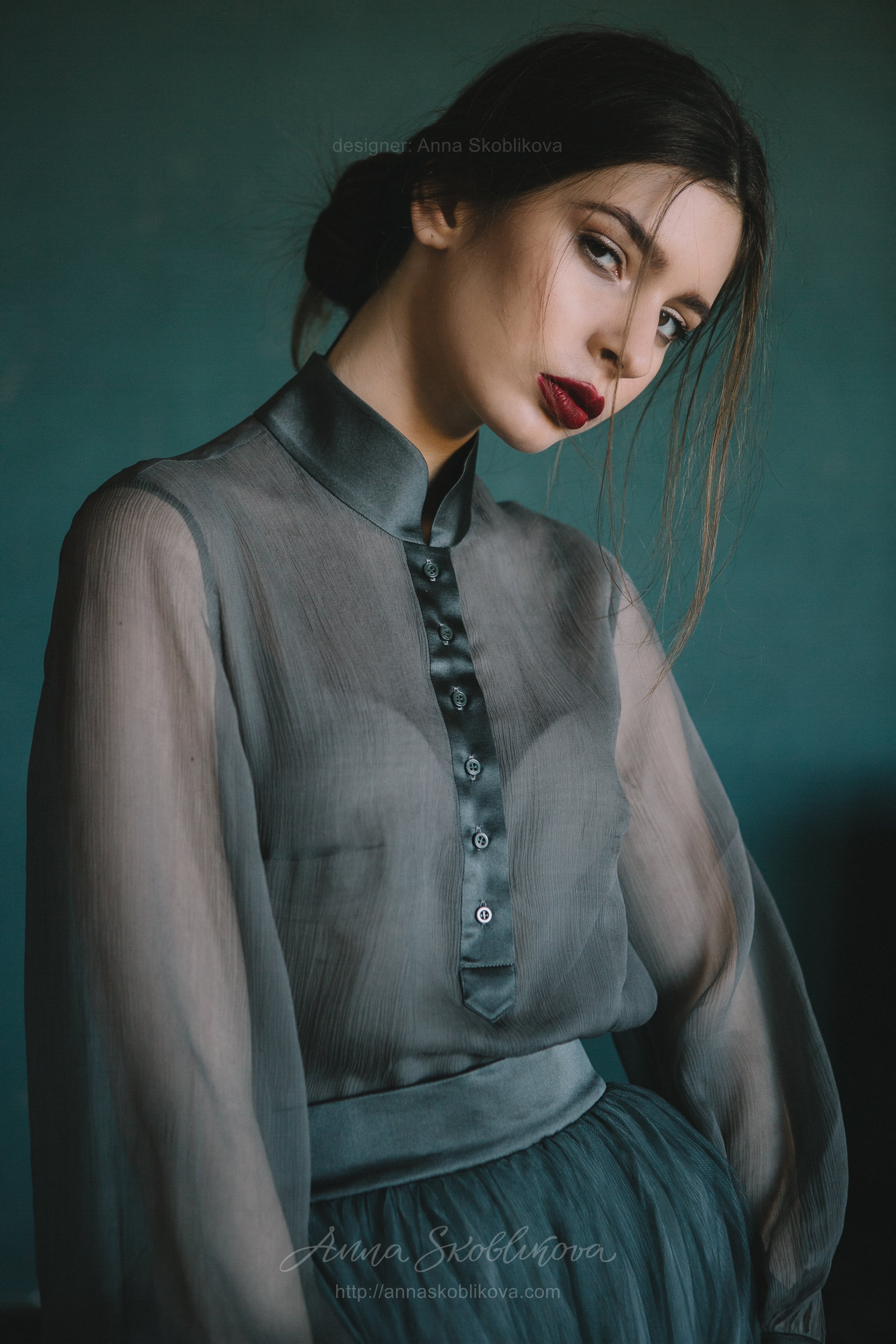 Женственная блуза свадебного платья выполнена из нескольких видов шелка: прозрачного креш-шелка и атласного шелка на манжетах и застежке-поло.