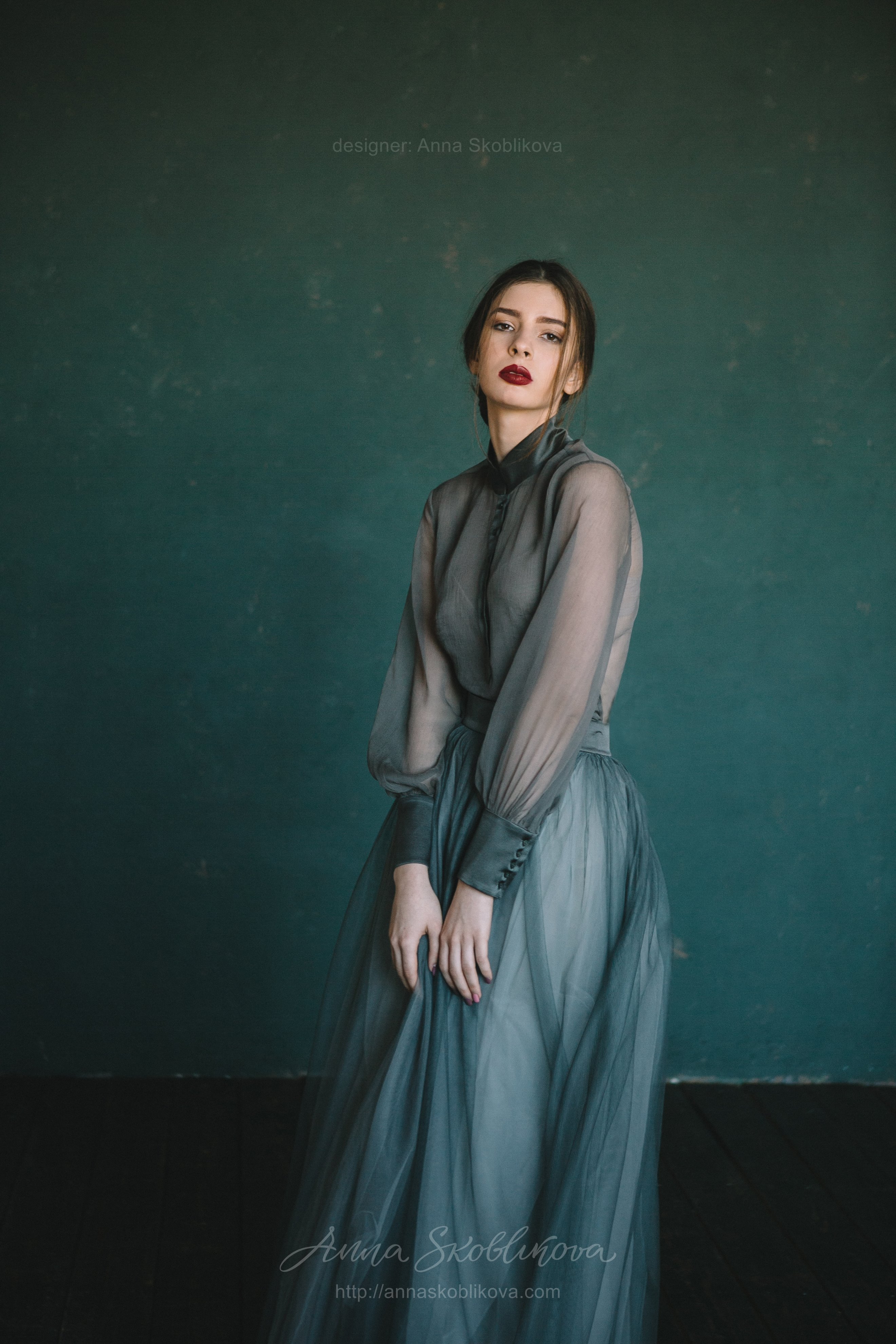 Юбка в вечернем платье с шелковым поясом выполнена из трех оттенков сетки в тон блузы.