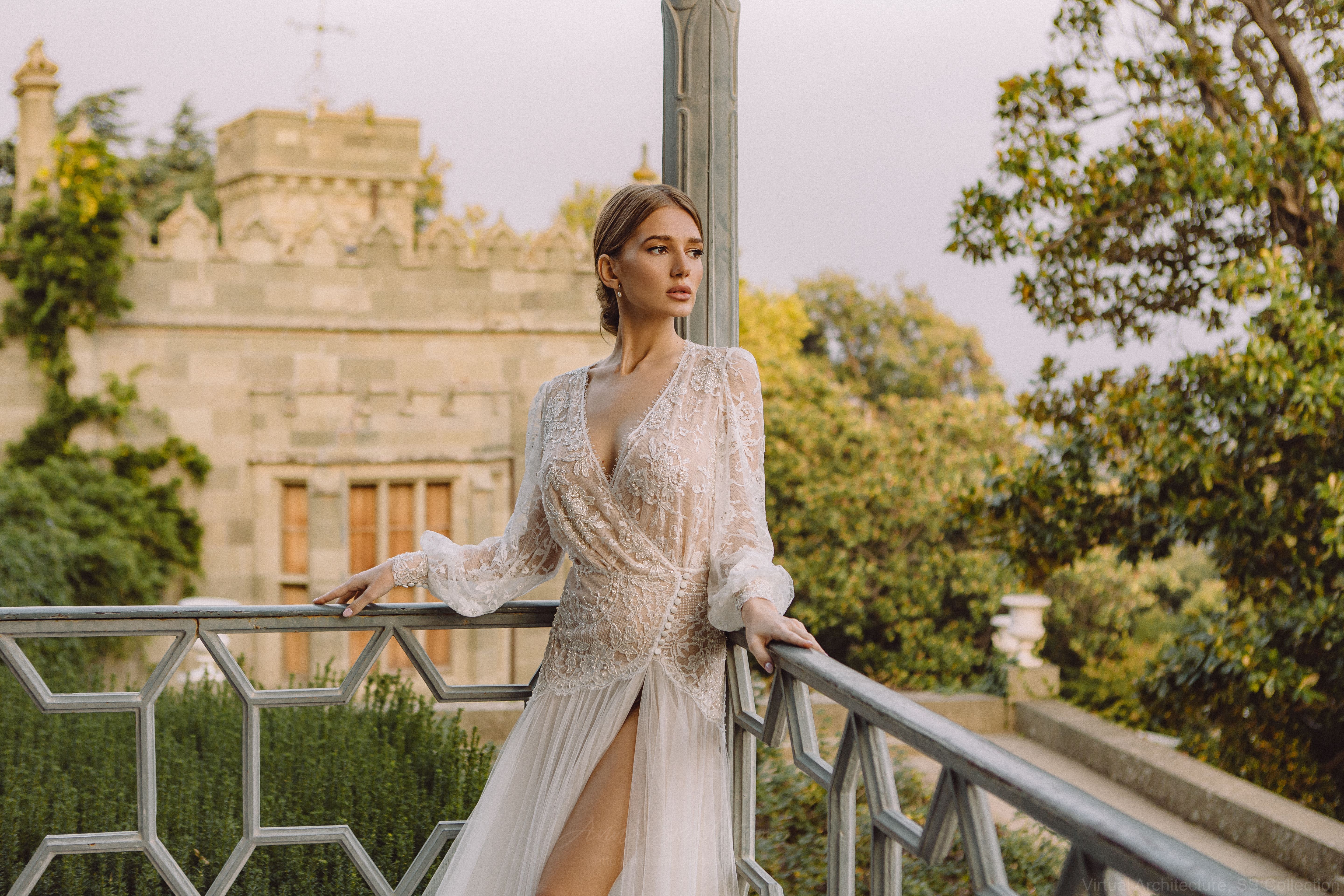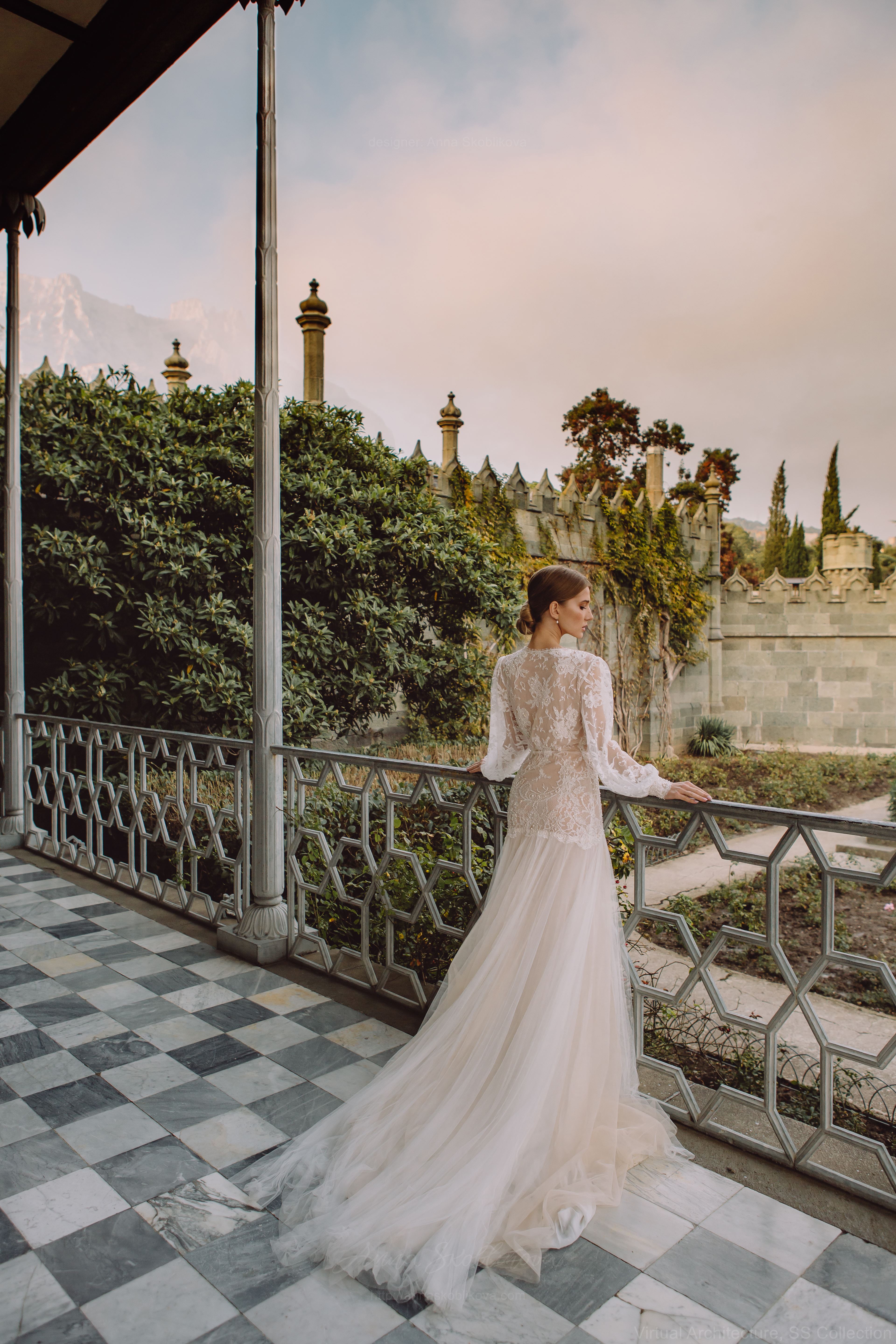Полупрозрачное королевское свадебное платье выполнено полностью из натуральных материалов: французского кружева Solstiss c узором роз, шелка, вискозной сетки и натуральных бусин и камней.