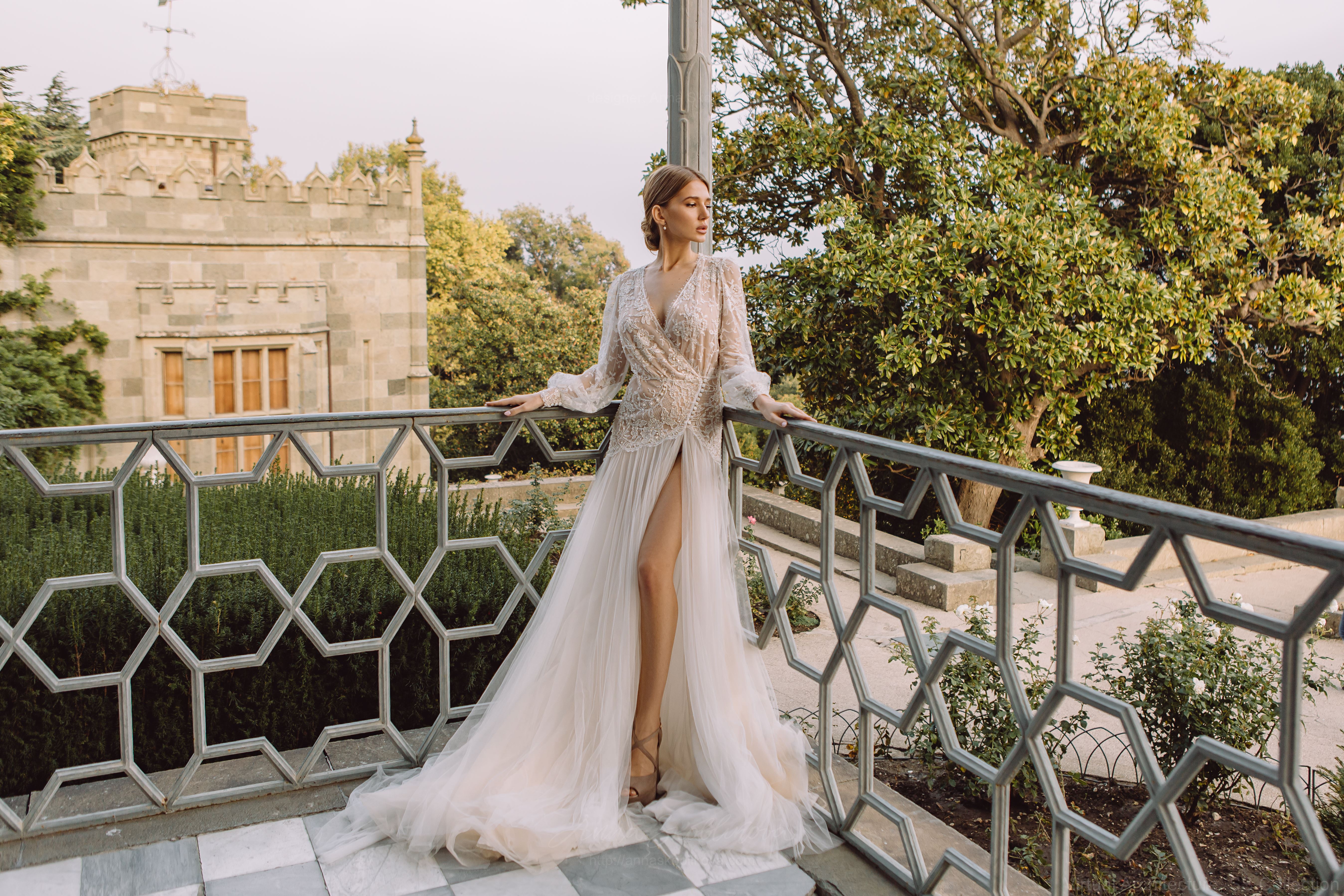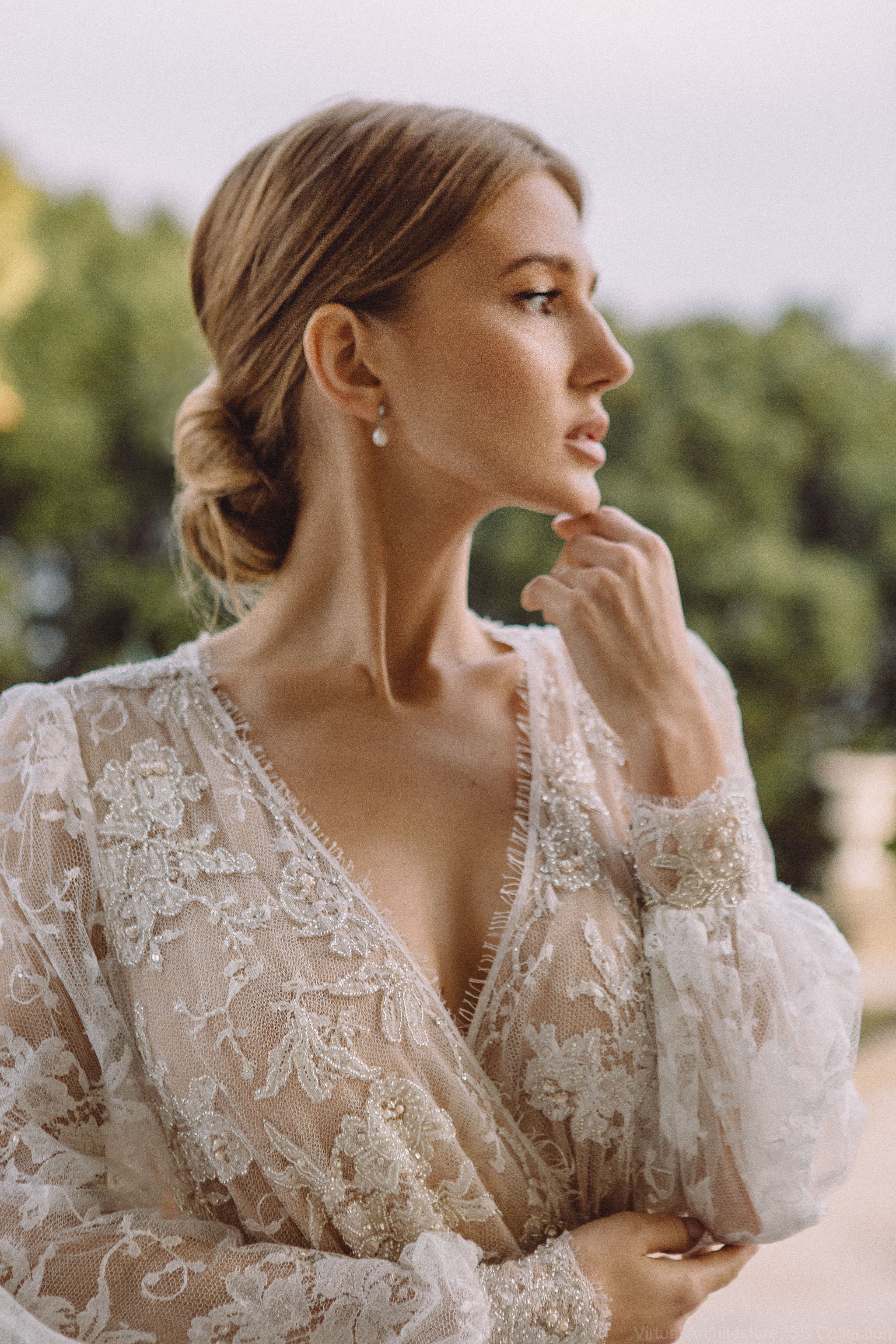 Мы видим невесту – гармоничной, уверенной в себе, девушкой, которая любит себя и любит манятся. Платье само по себе обильно украшено, и мы не рекомендуем фату или другие аксессуары, если невеста хочет, это может быть небольшая диадема или заколка.