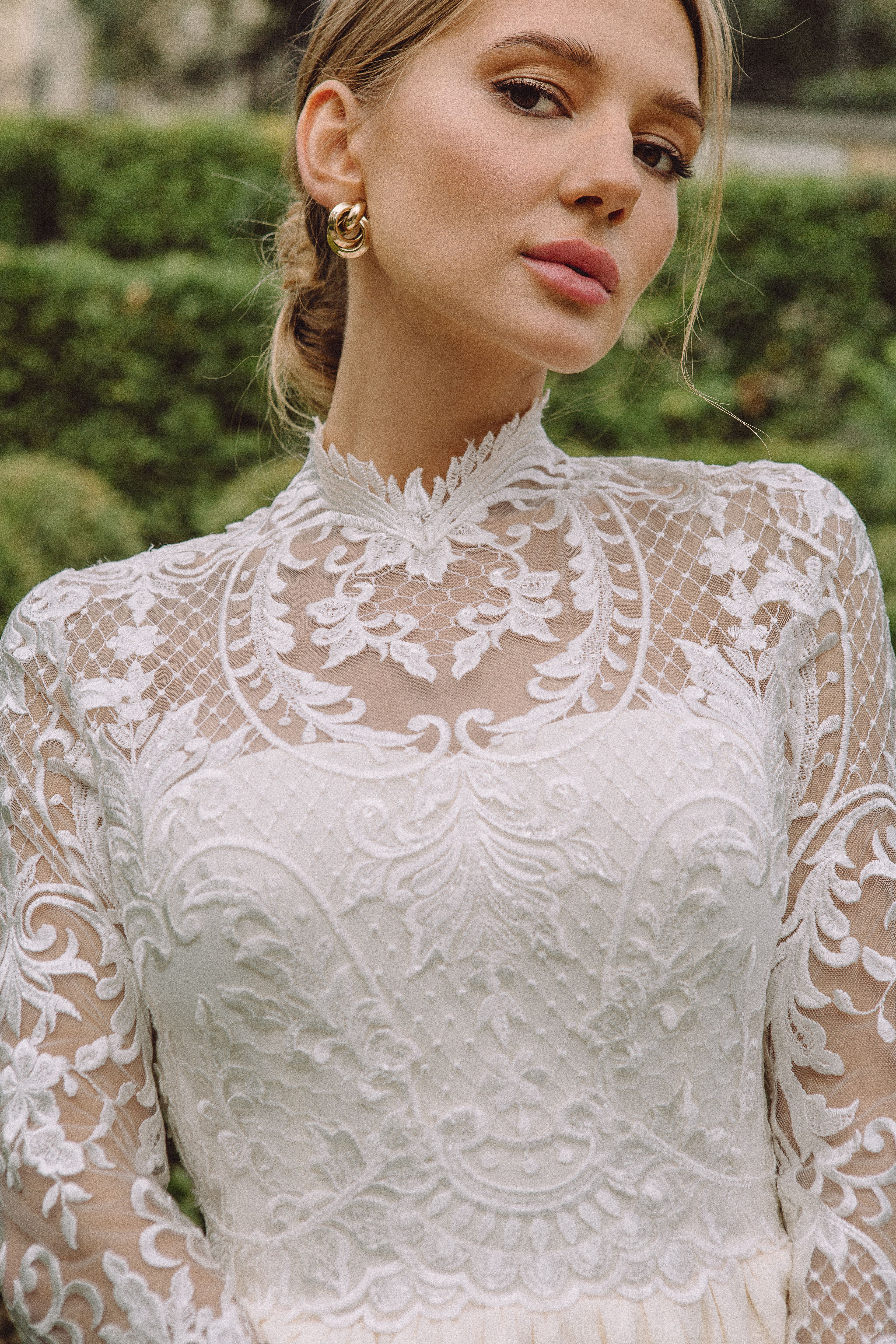 Лиф свадебного платья Rimosa выполнен из кружева с роскошным узором, словно роспись на вазе, среди цветов и листьев, вензеля и завитки переплетаются с растительными узорами. Лиф имеет нотки аристократичного стиля, высокую горловину с зубцами из кружева. Узор на шее выложен вручную, образуя украшение в виде кружевного чокера. =