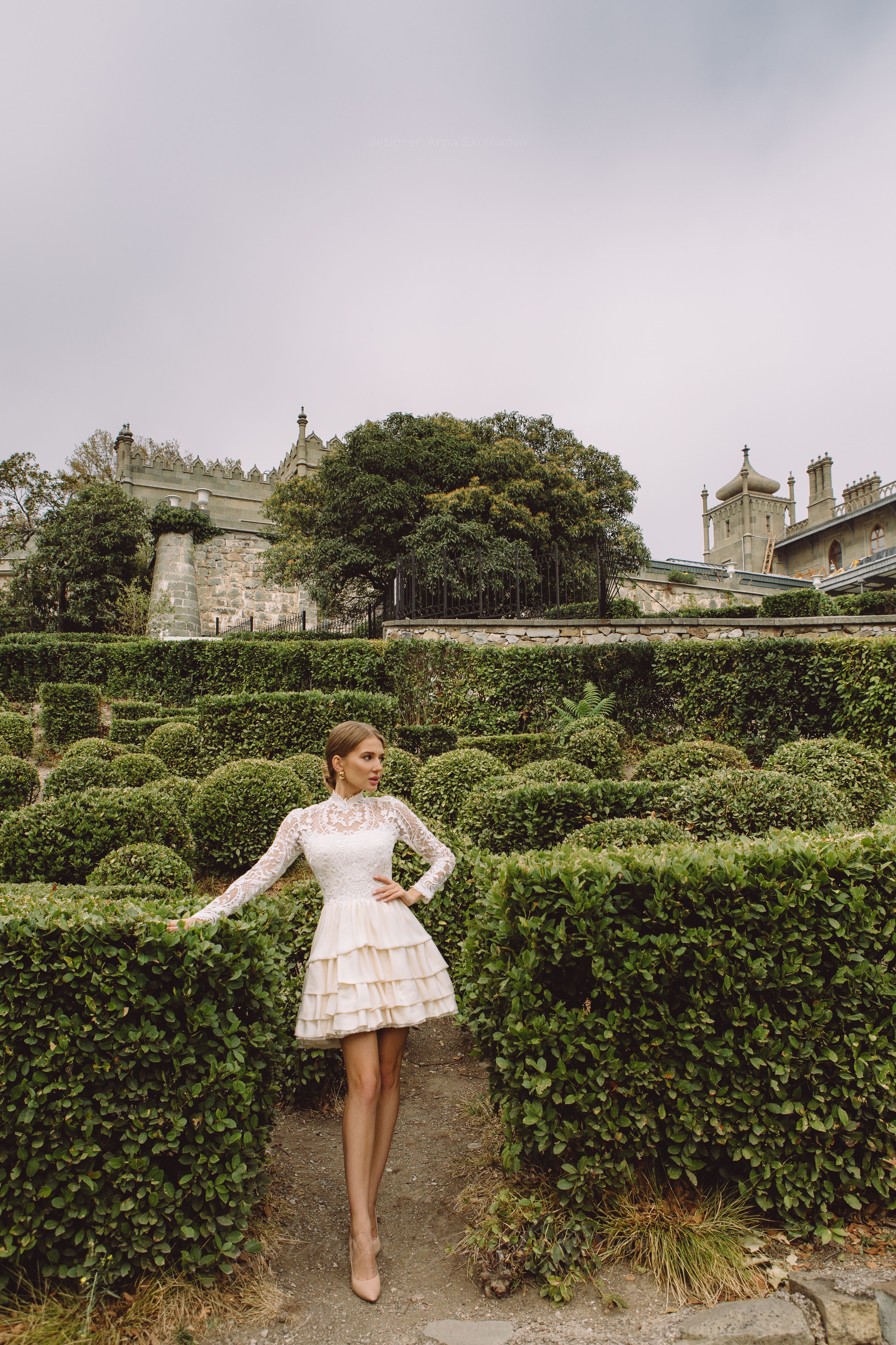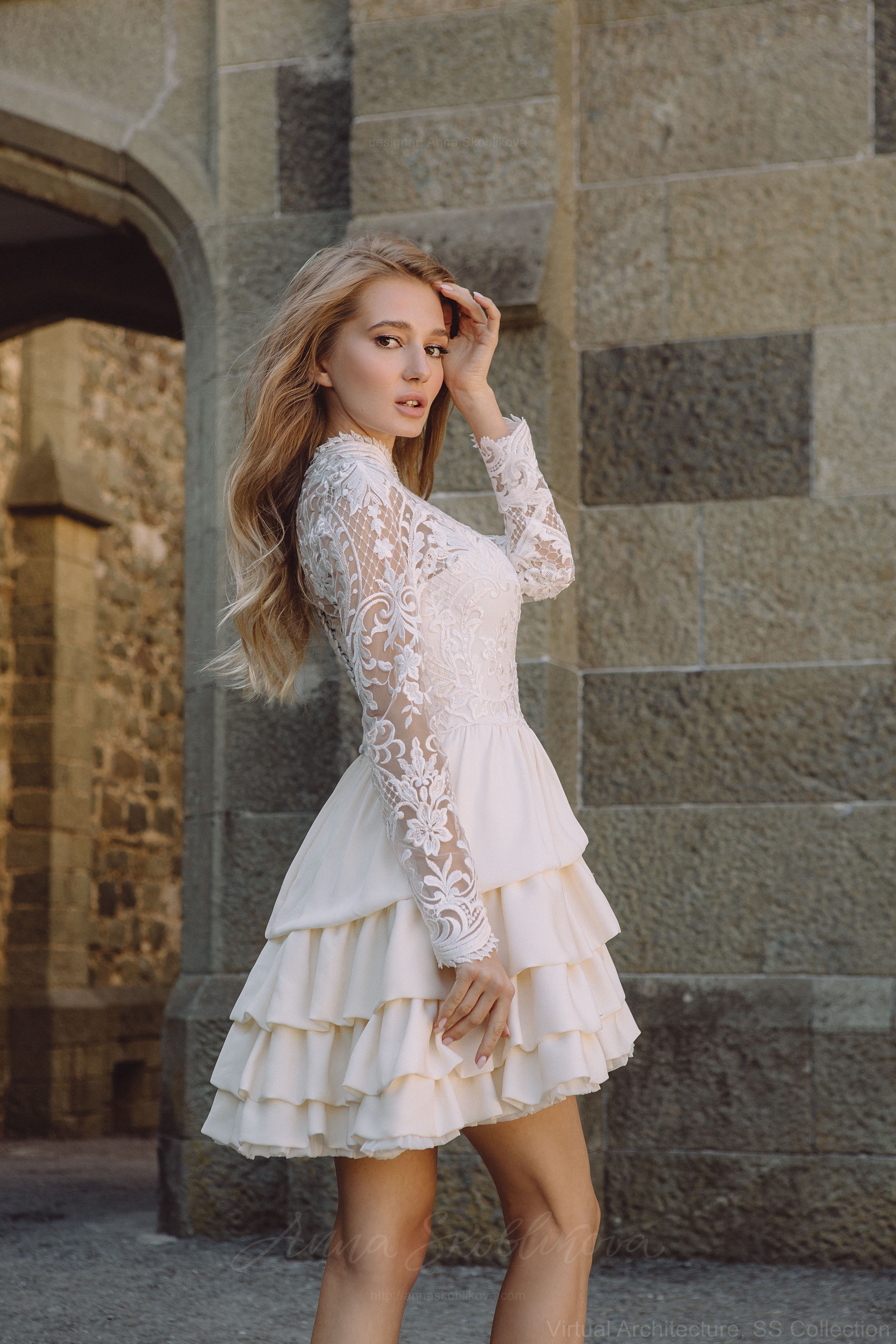 Изначально данное платье было разработано как свадебное платье для девушки, которая ищет наряд для динамичной свадьбы, возможно это может быть даже подруга байкера, ведь с сапогами казаками и кожаной курткой это платье будет выглядеть стильно и по-новому. Платье вышло довольно романтичным и милым, но это точно не мешает интерпретировать его, по-разному сочетая стили. Обратитесь к дизайнеру, и мы порекомендуем лучшие сочетания согласно вашим идеям.