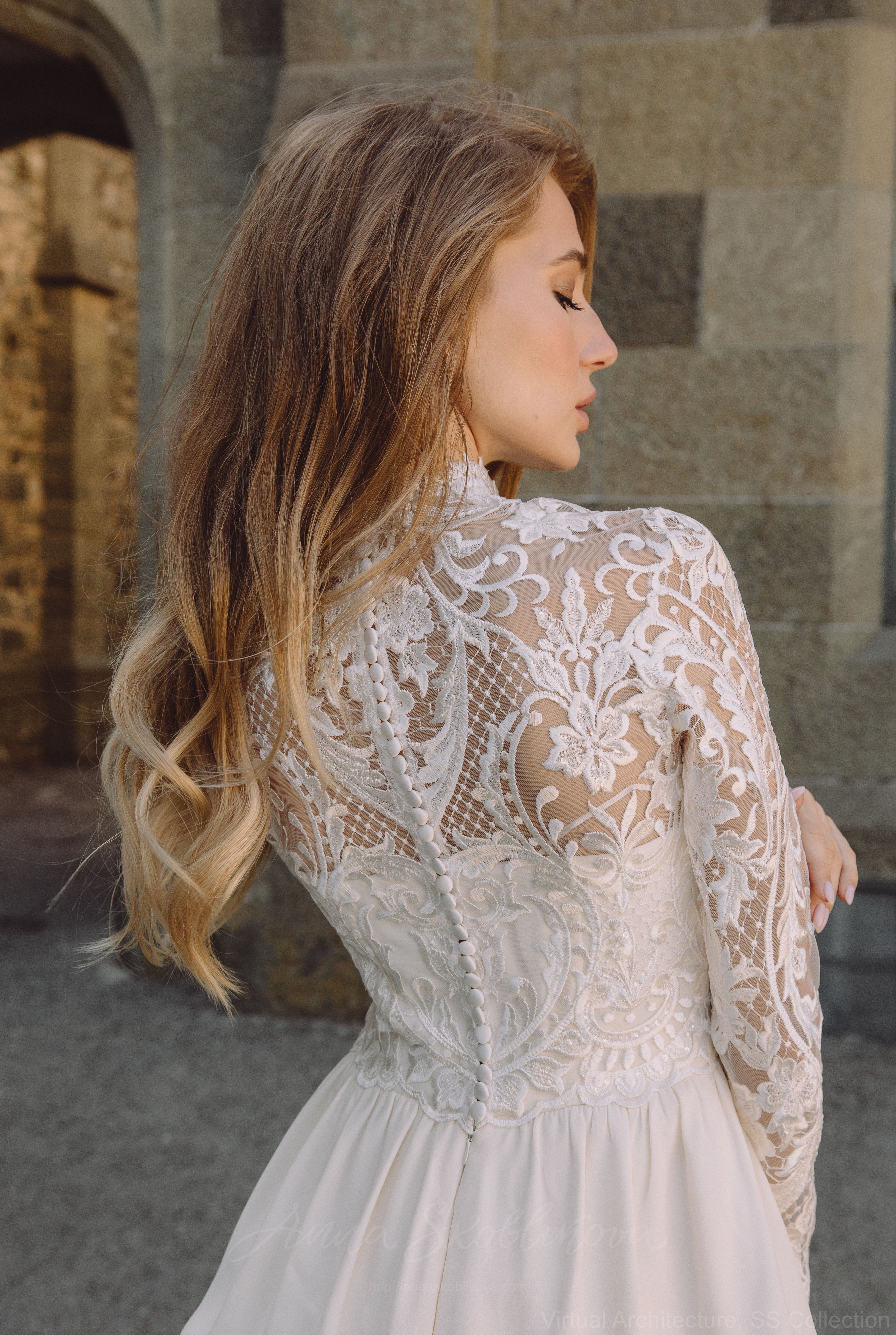 Спинка свадебного платья закрытая, с застежкой на тканевые пуговицы. Мы сделали красивое соединение узора на спинке, ее интересно рассматривать.