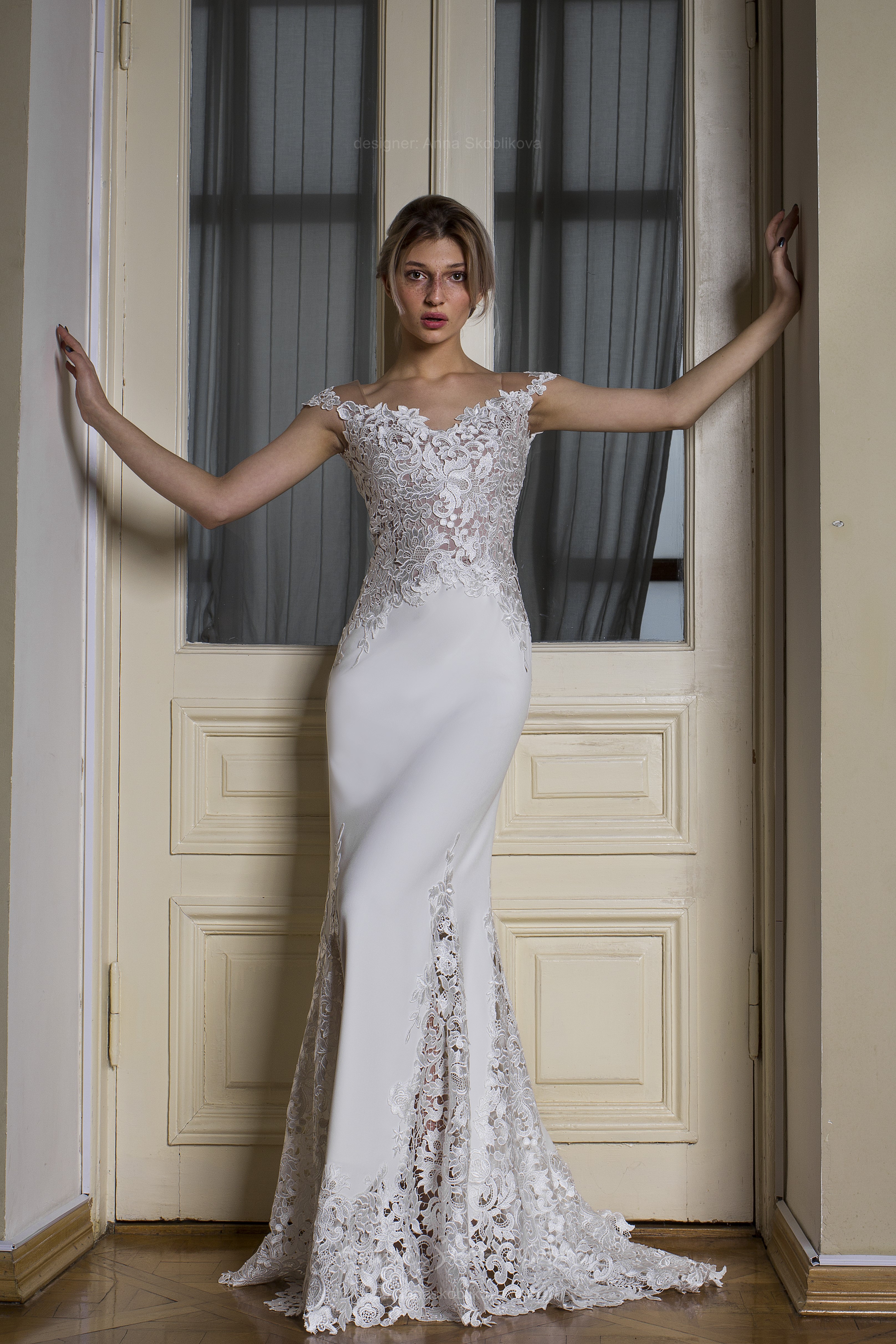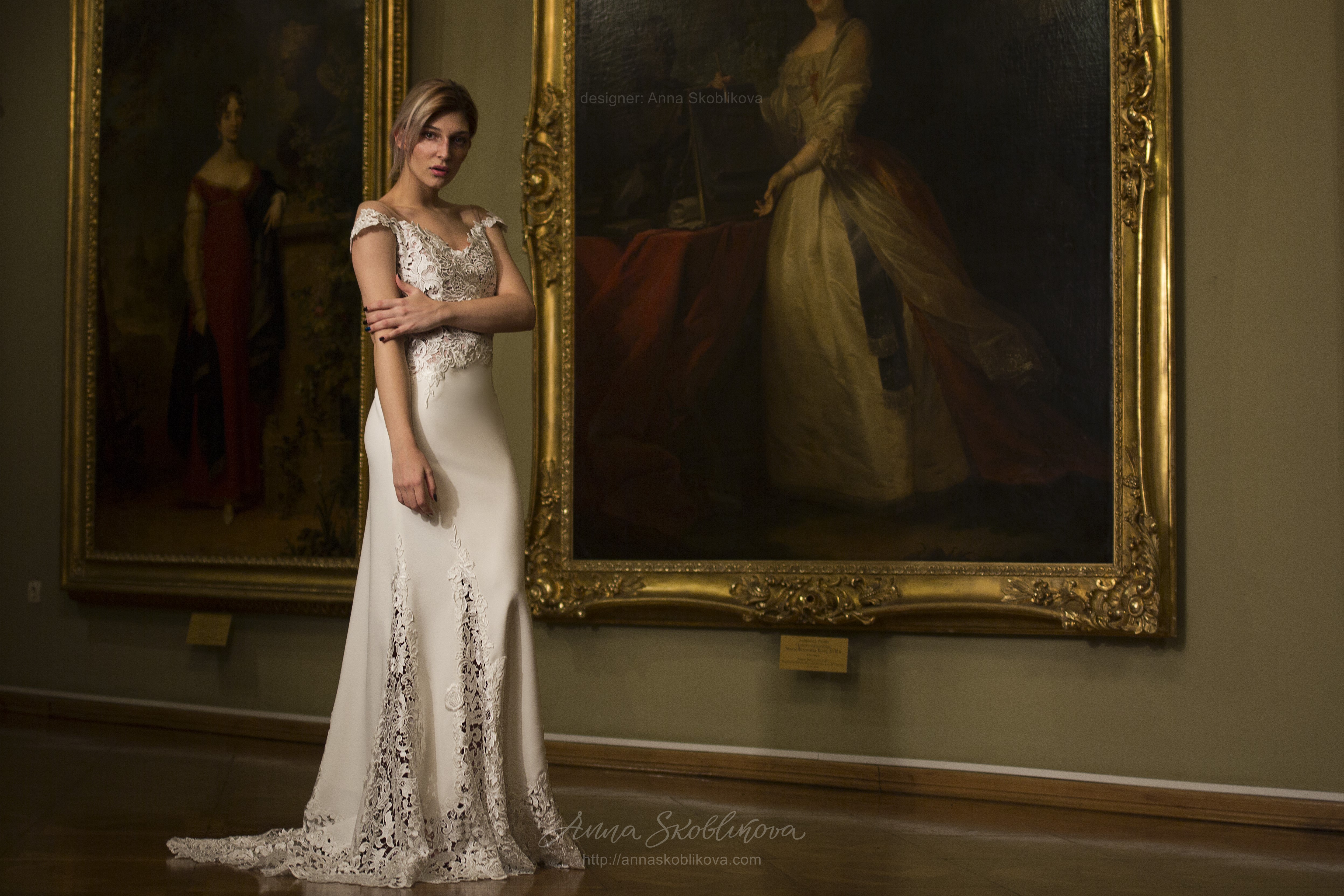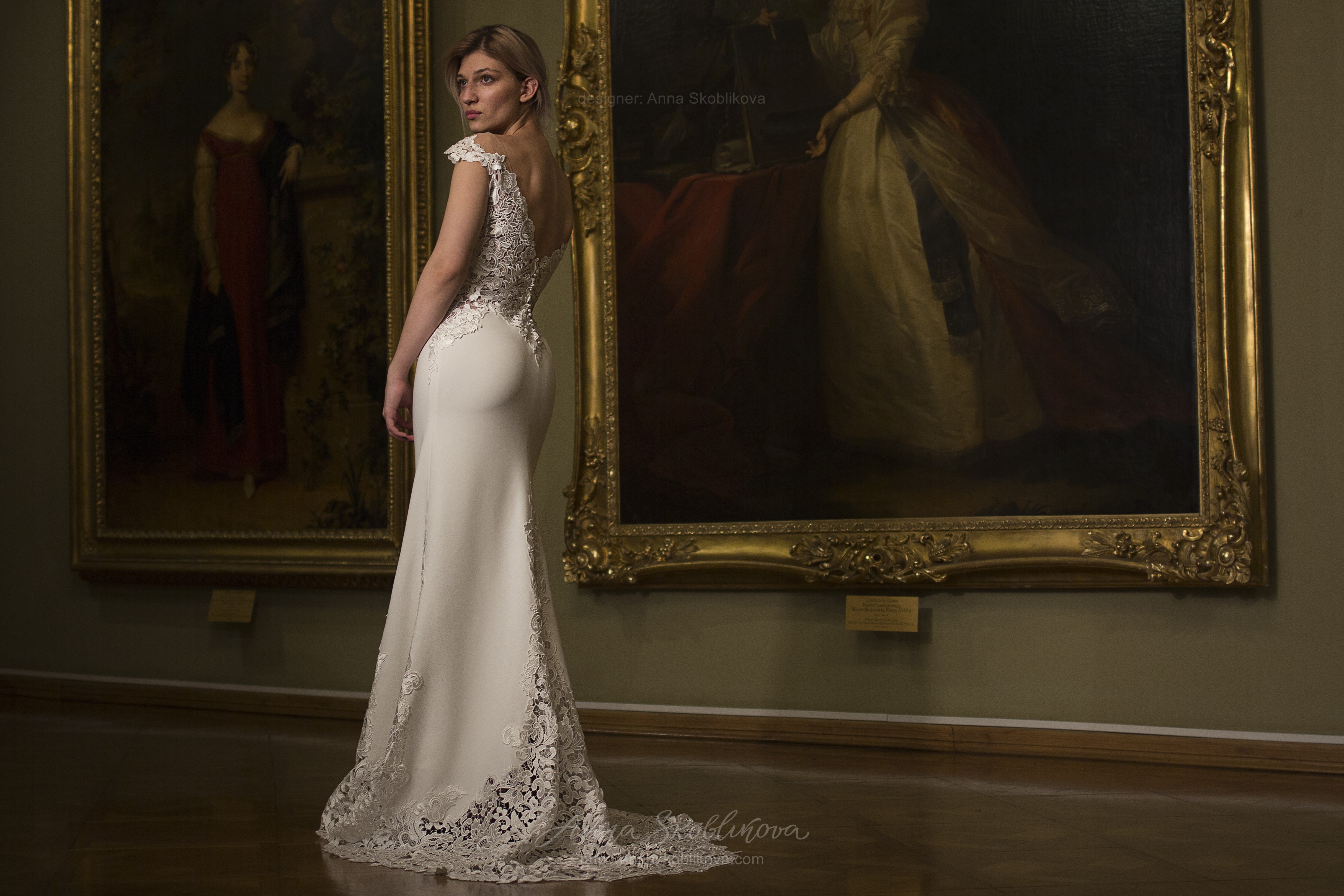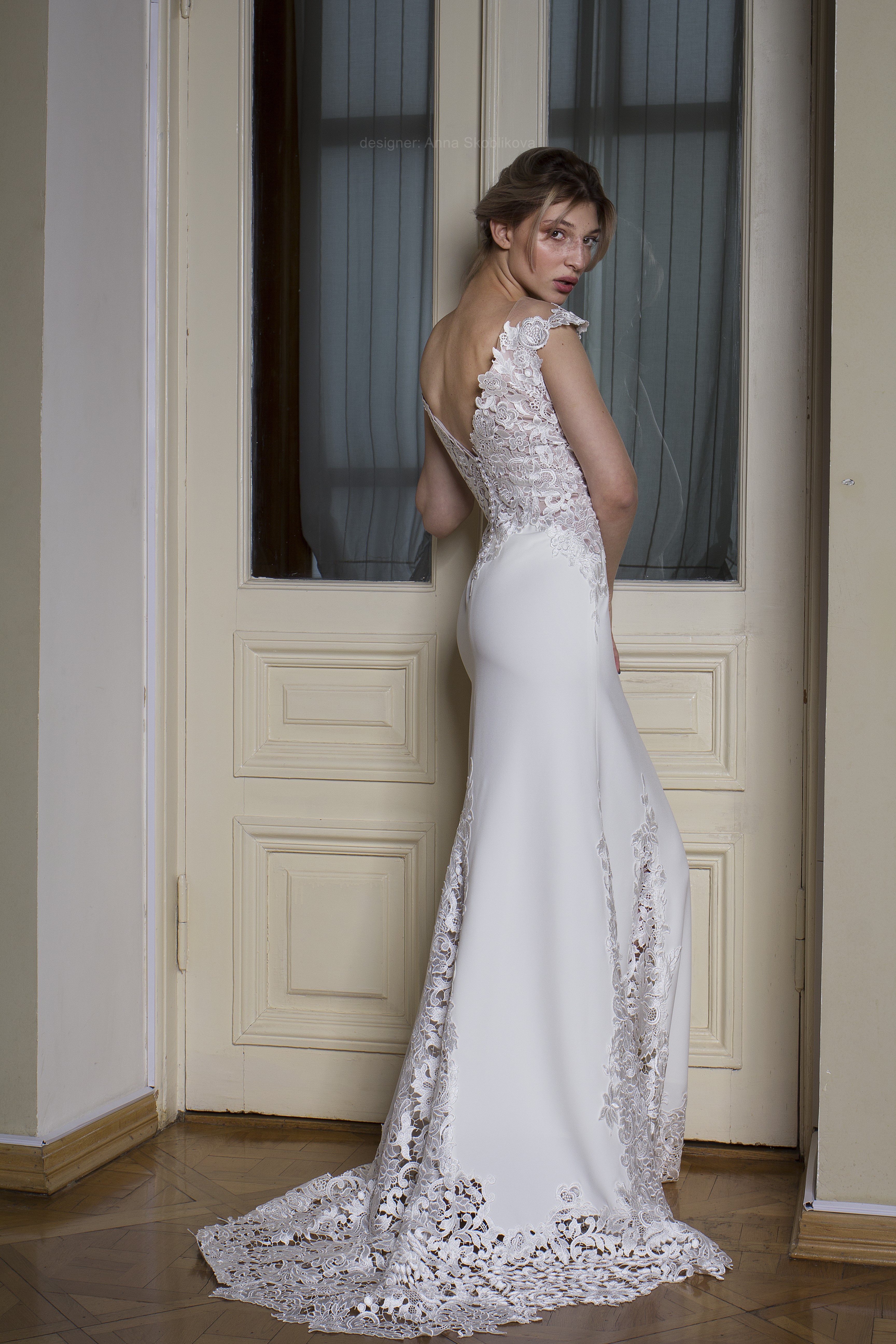 Элегантное свадебное платье из плотного итальянского крепа с отделкой из кружева-макраме.