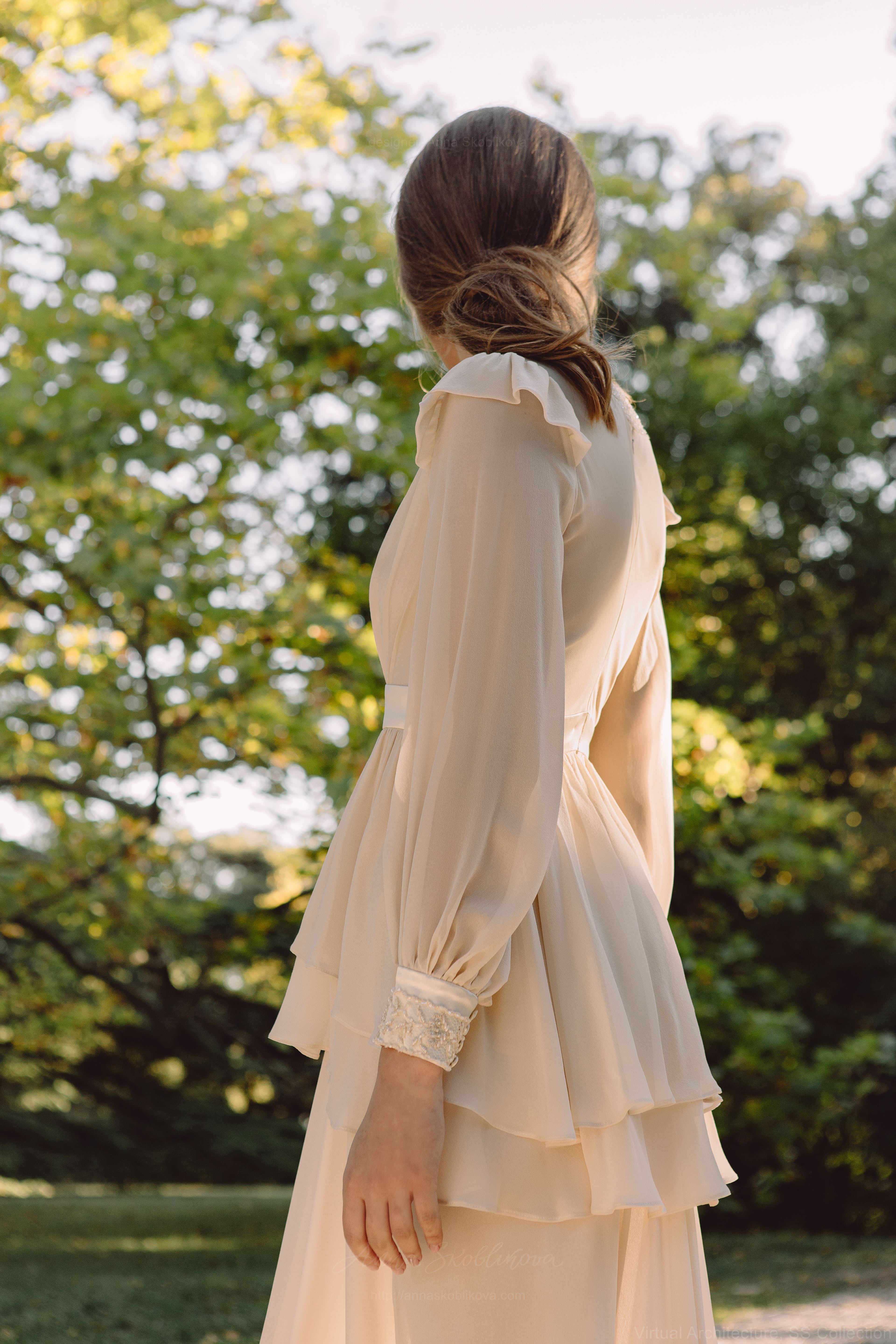 При просвечивании бежевого крепового шелка молочный осветляет вид верхней ткани и делает образ свадебным.