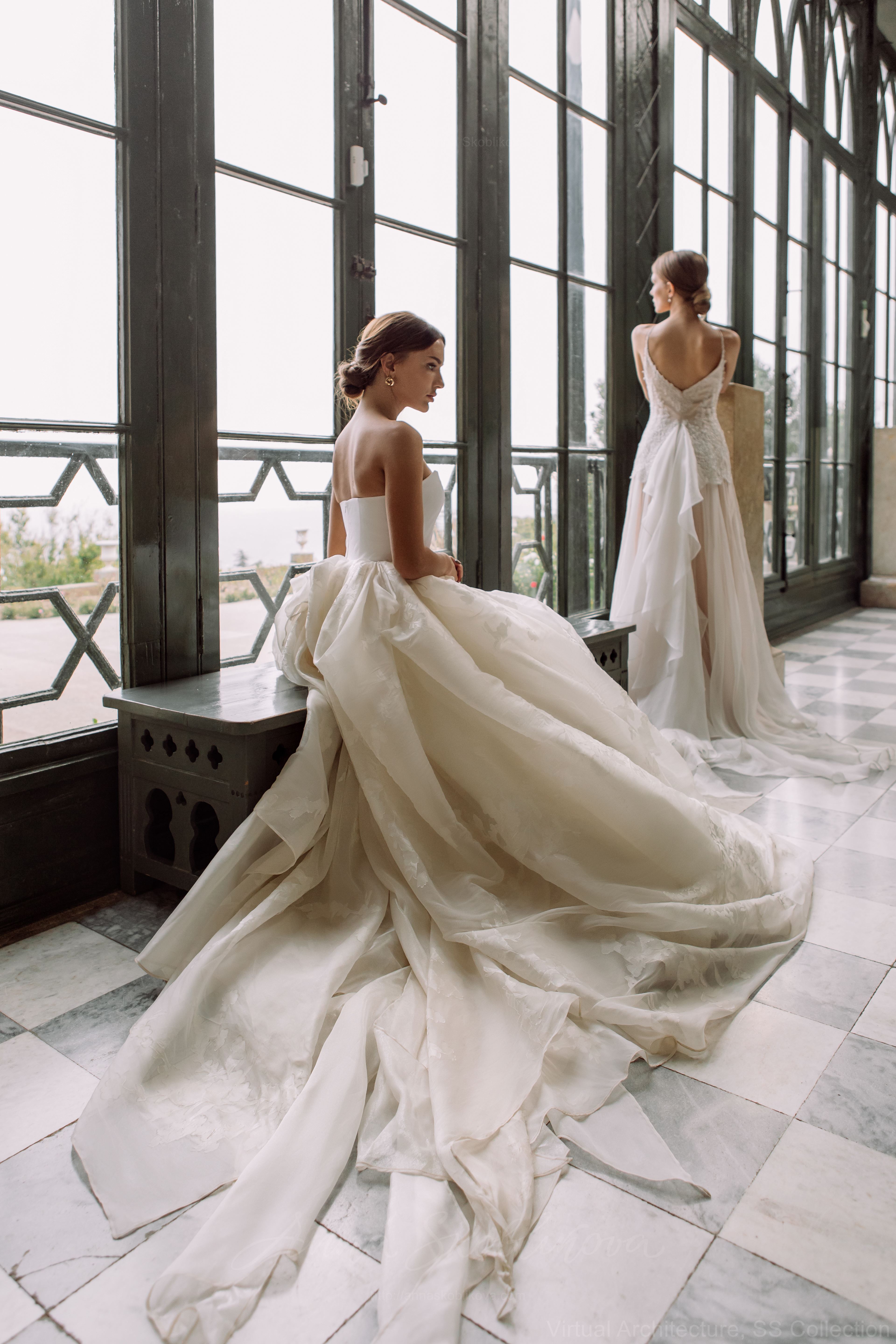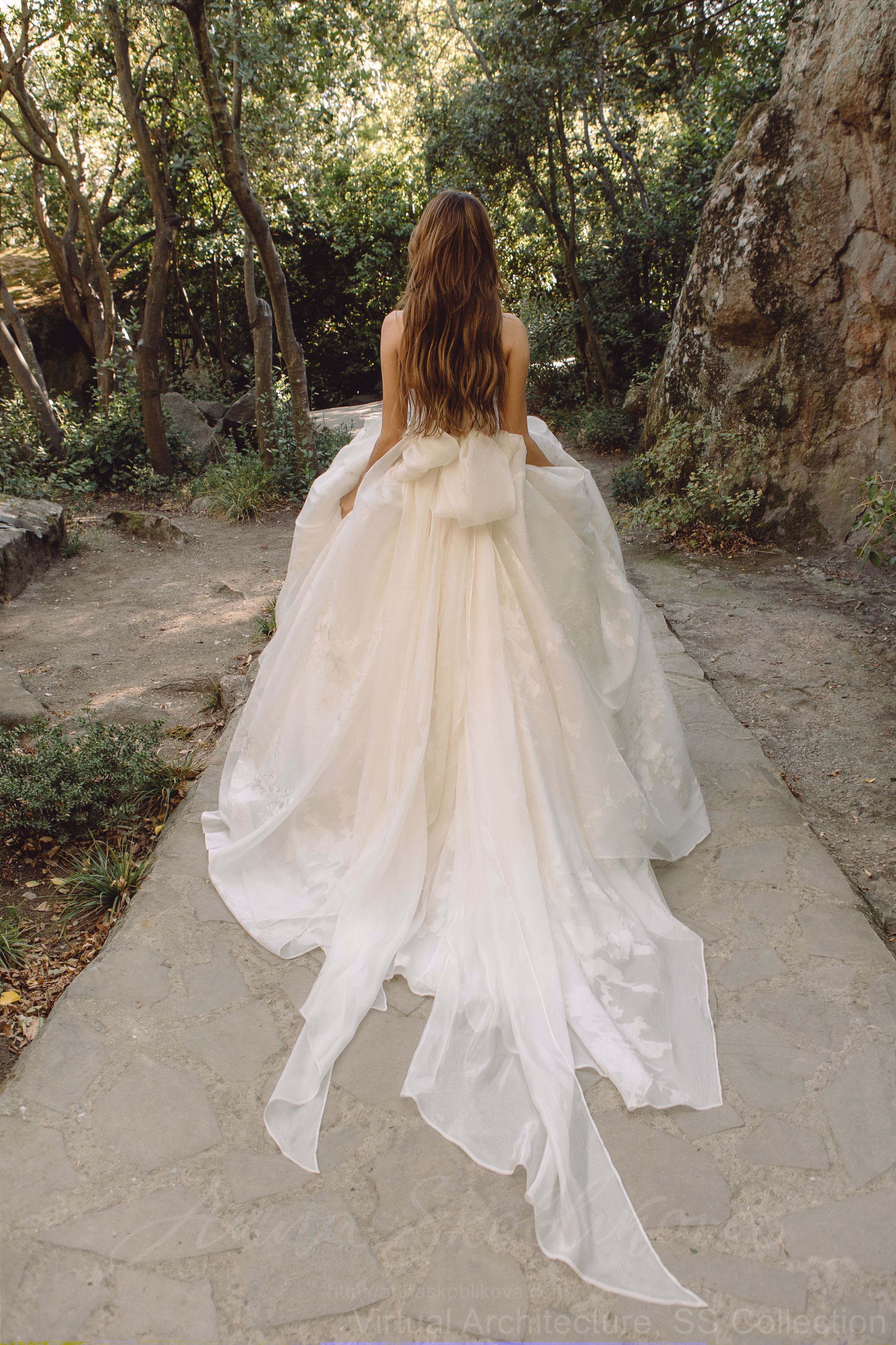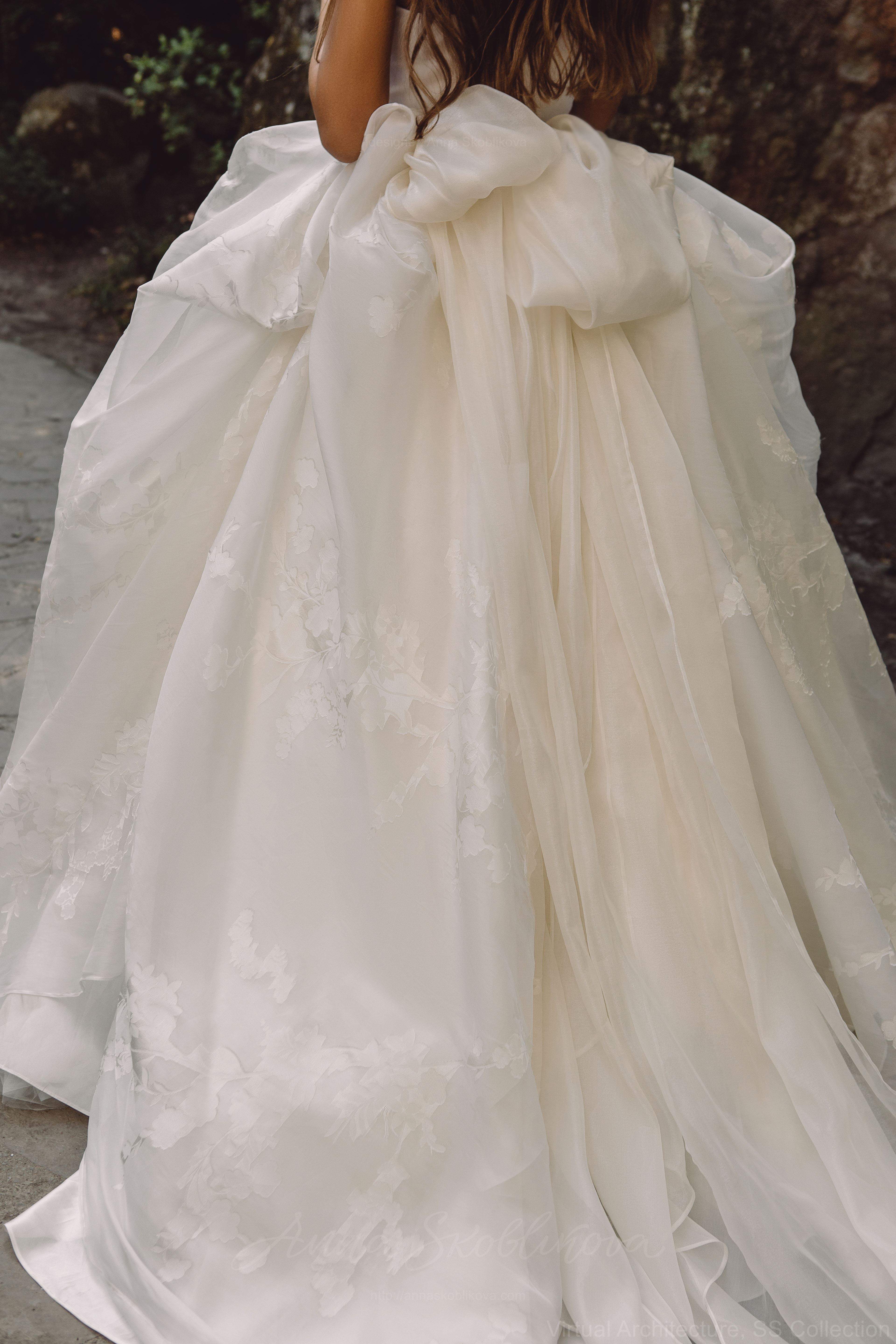 Наши мастера драпировали юбку полностью вручную из нескольких десятков метров воздушной шелковой органзы двух типов.