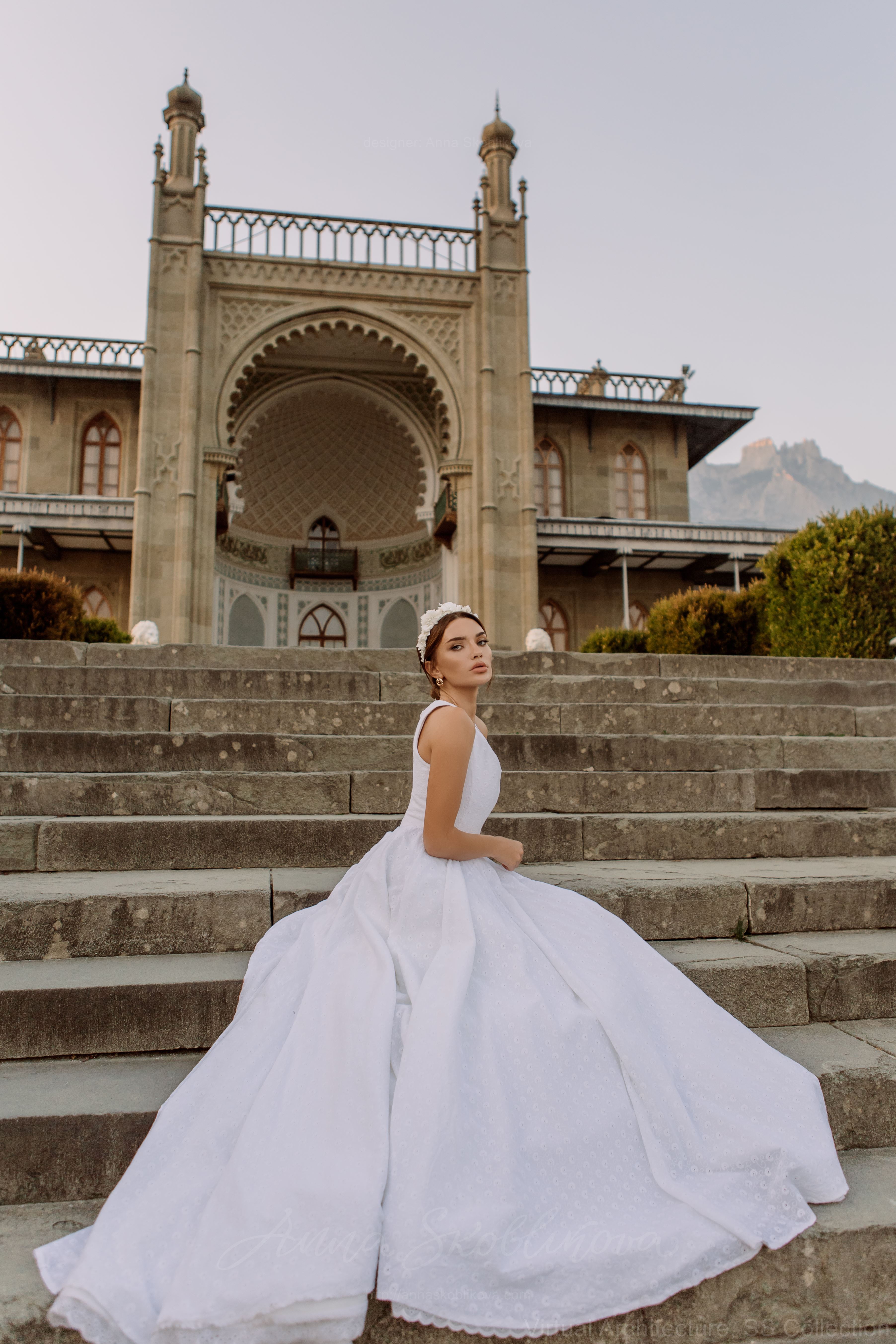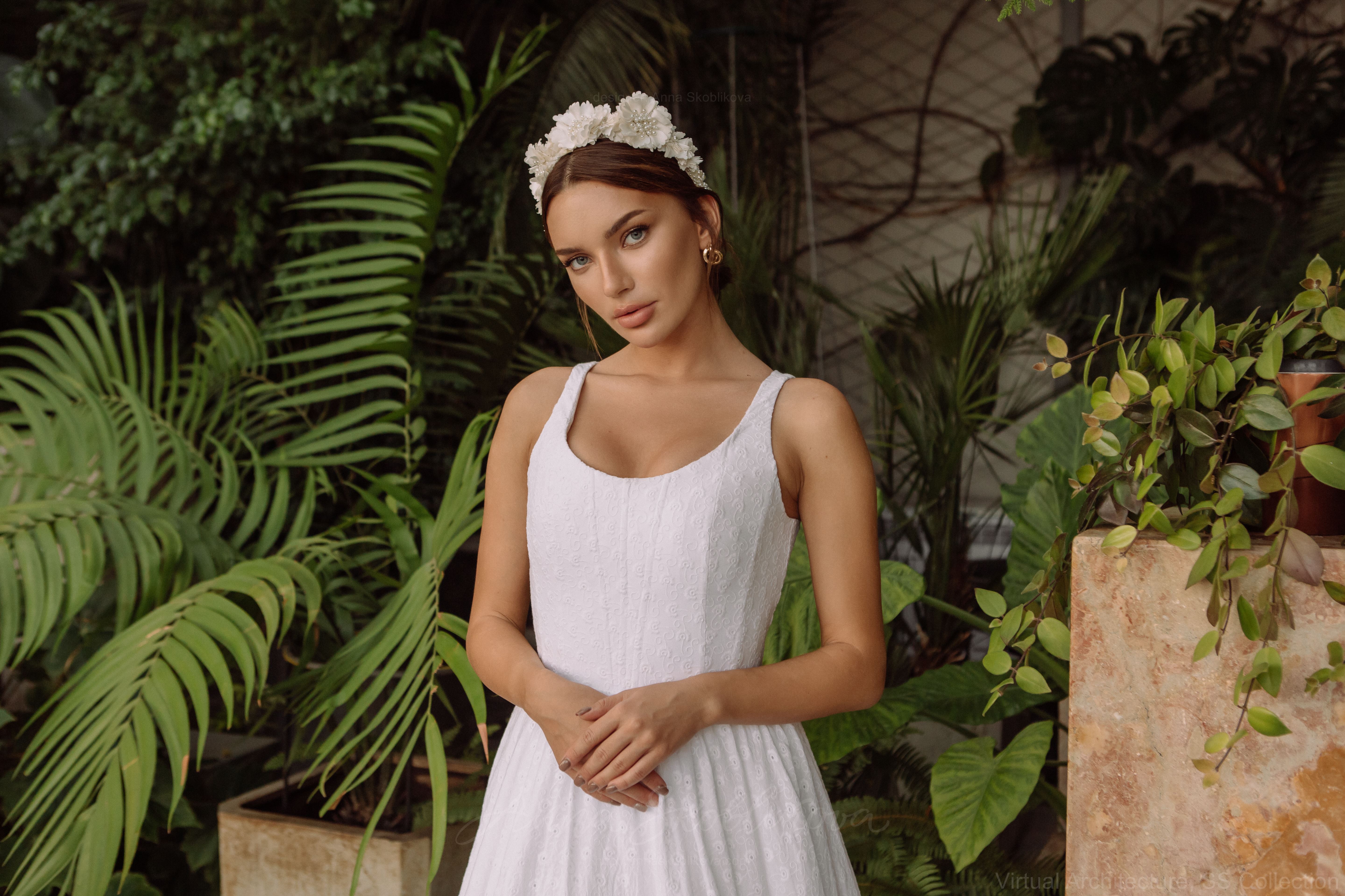 Свадебное платье имеет довольно чистый, лаконичный вид. Рекомендуем добавить к платью крупный венок для волос или шляпу.