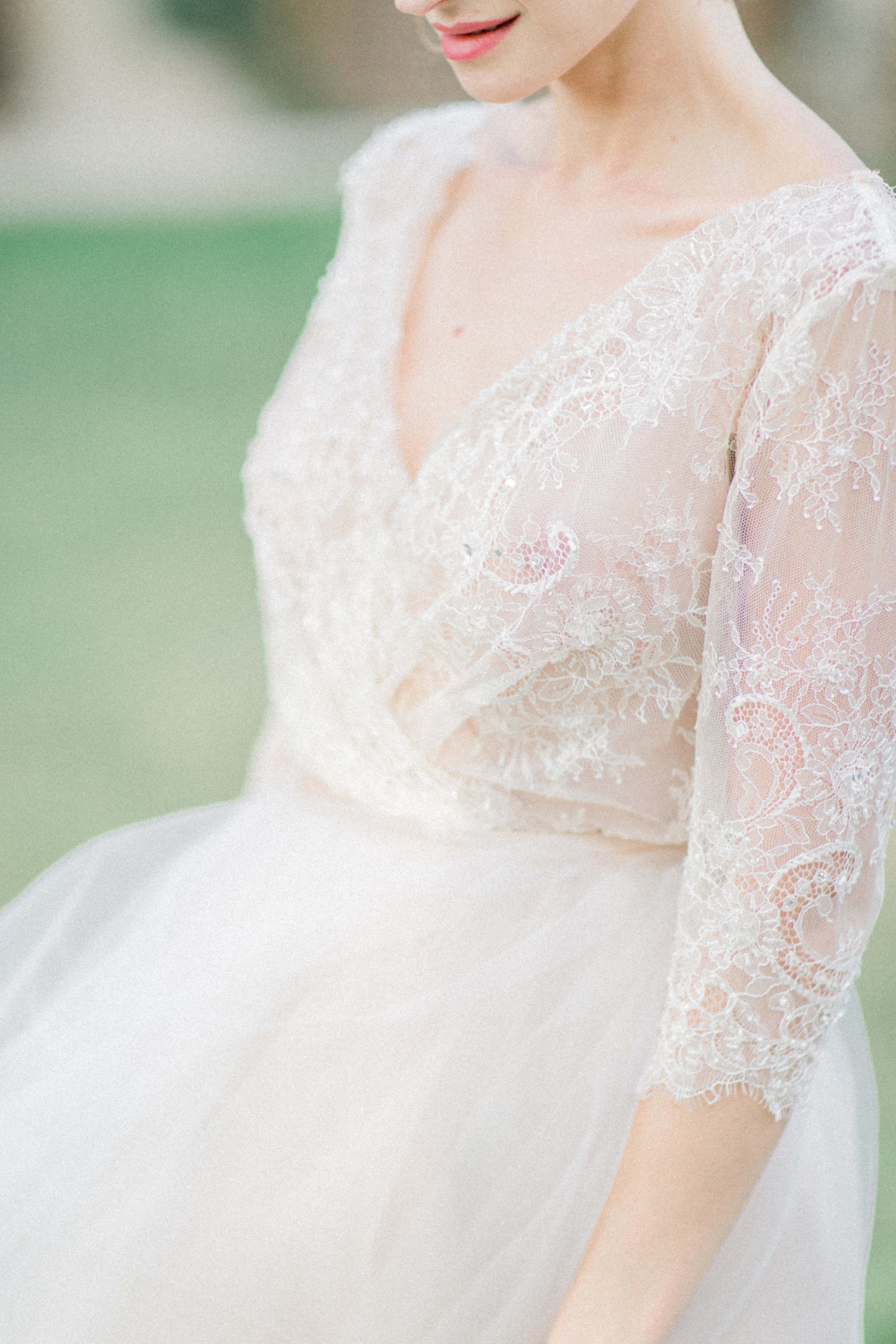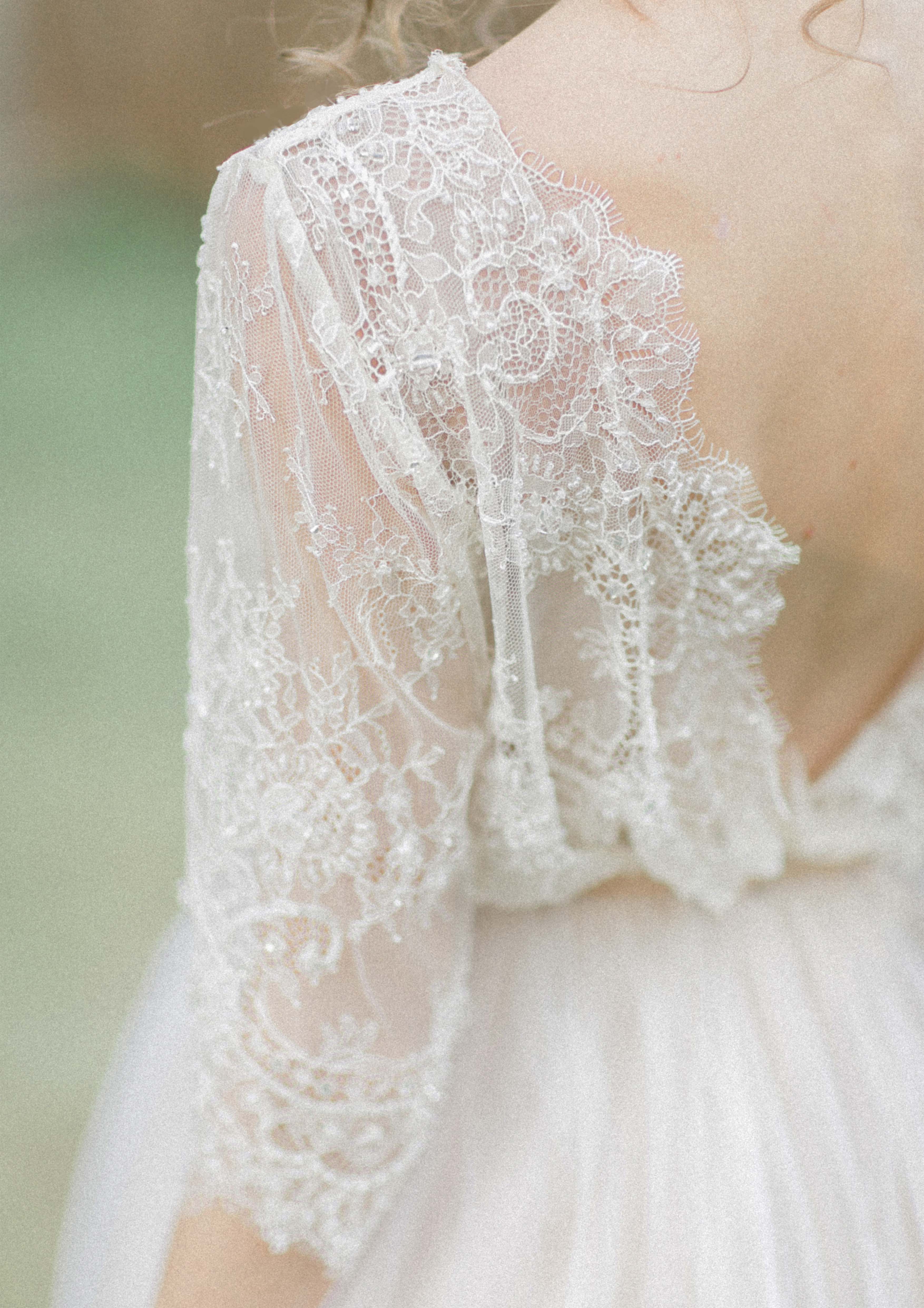 Свадебное платье выполнено из кружева шантильи и фатина.