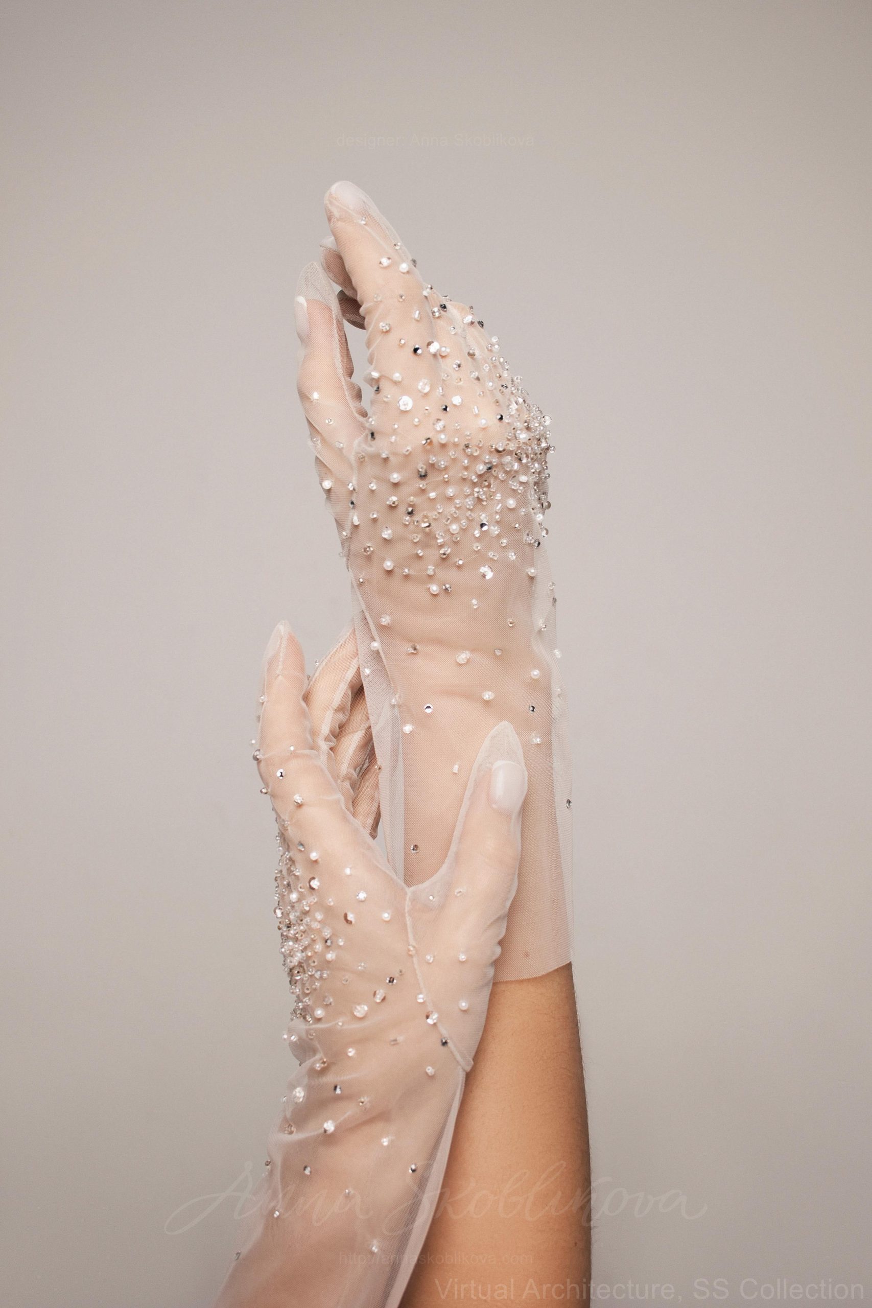 Свадебные перчатки идеально подойдут к платью из гладкого шелка, тафты или сетки с вышивкой.