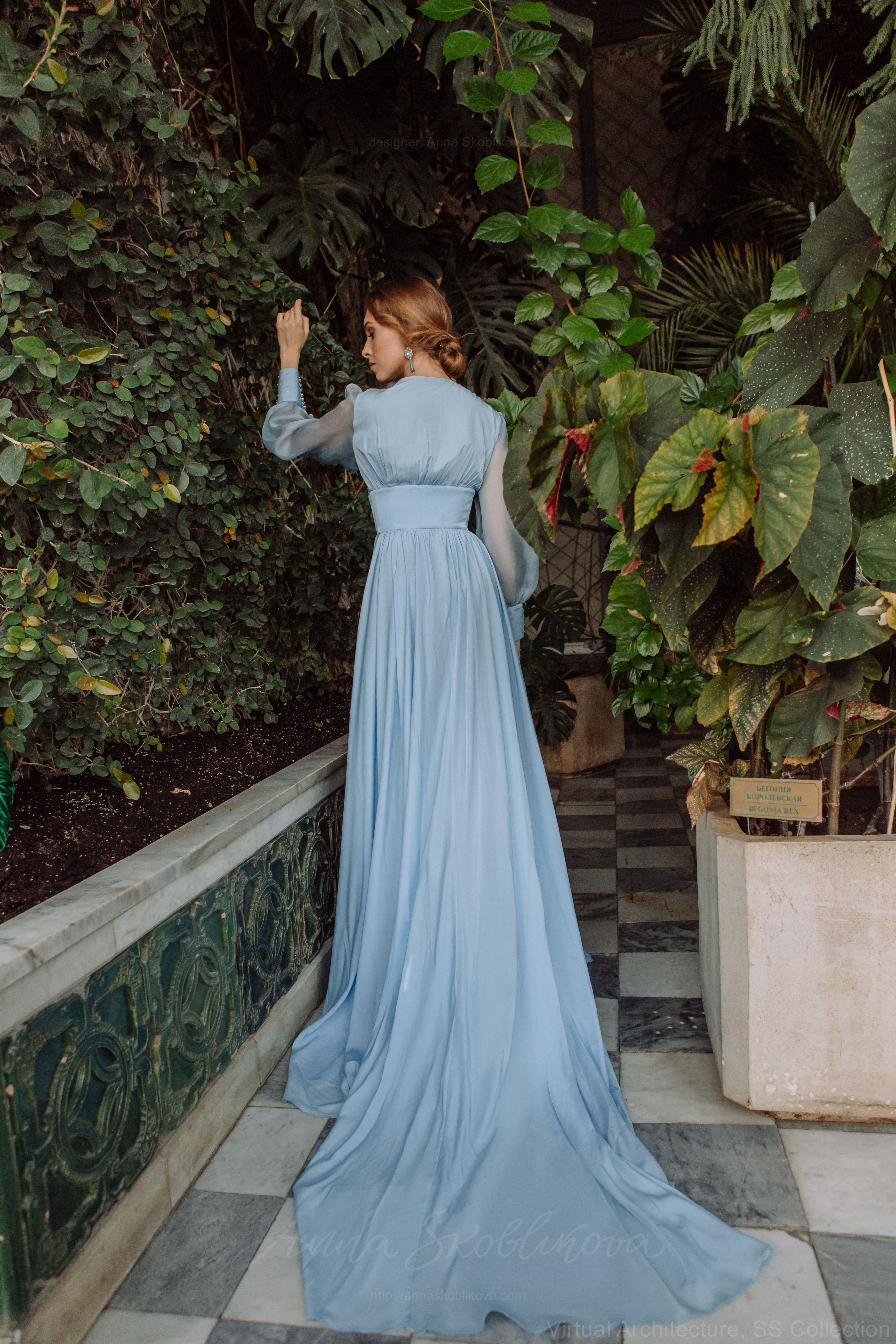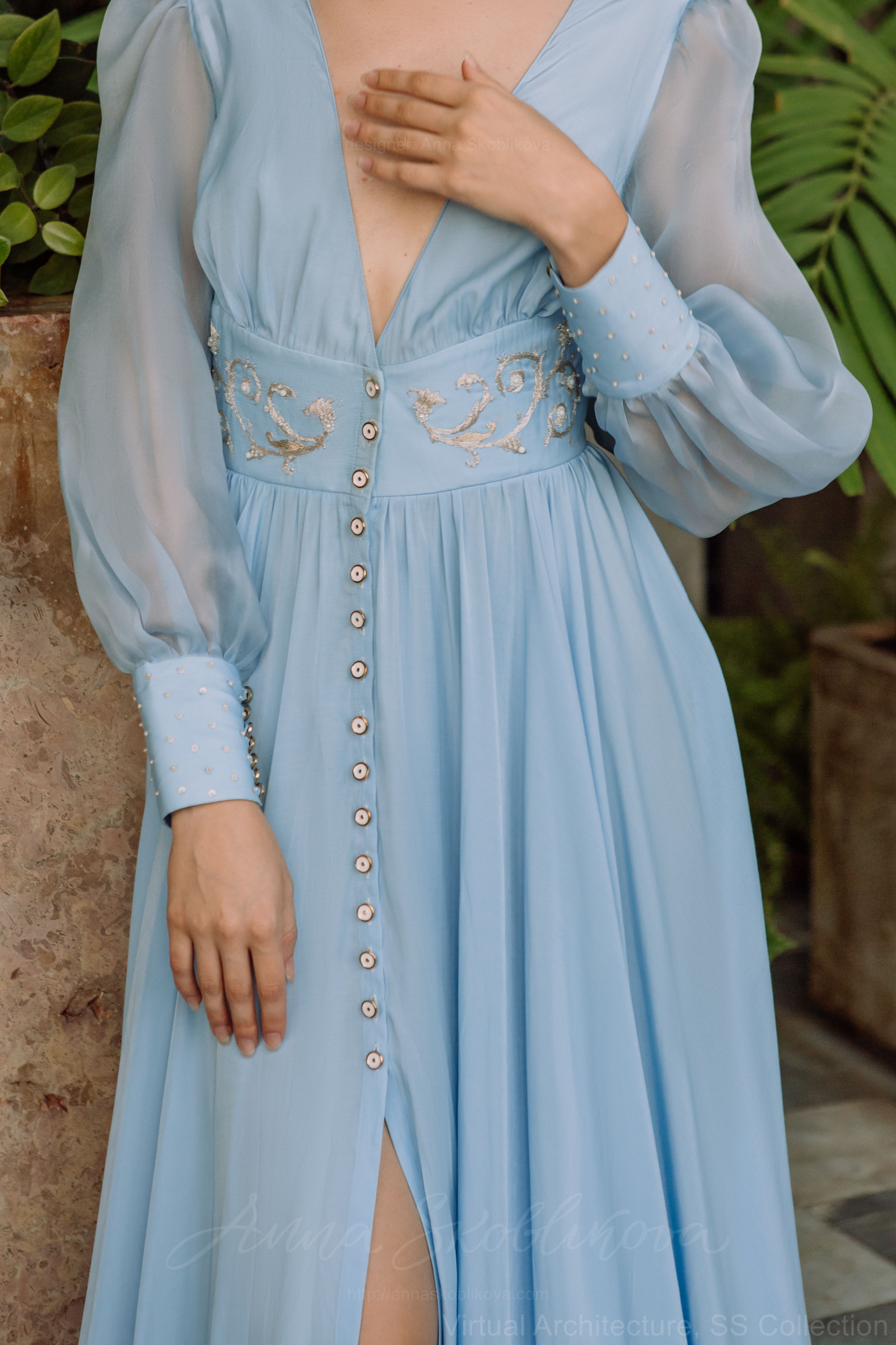 Голубой – цвет моря, загадочности. Креповый шелк невероятно легкий и воздушный, красиво струится при движении. Для рукавов мы выбрали прозрачную органзу. Разность и сочетание двух материалов одного цвета привлекает внимание к деталям, выполненным вручную, золоченой нитью и бусинами из слоновой кости. Манжет вышит узором крапинка (dot) с помощью французских пайеток и бисера.