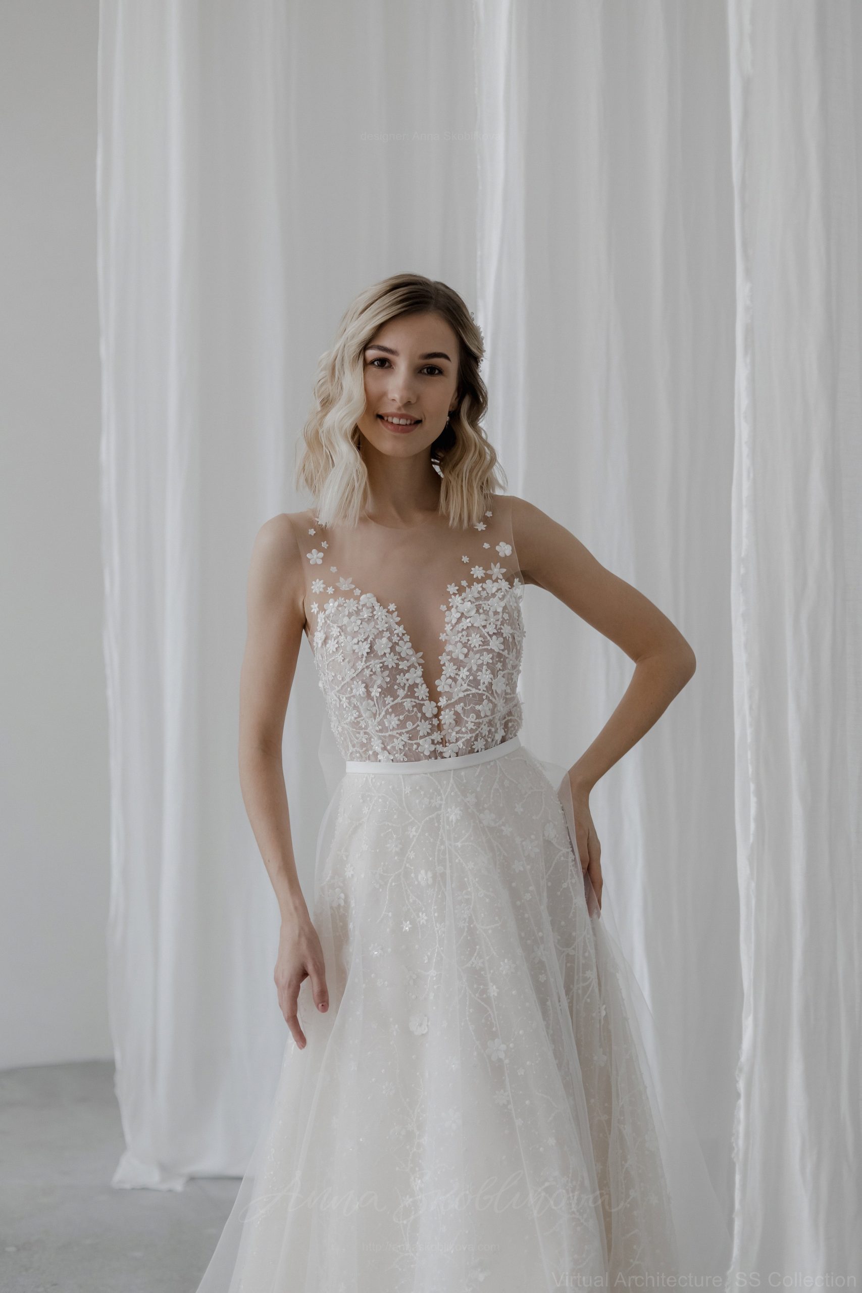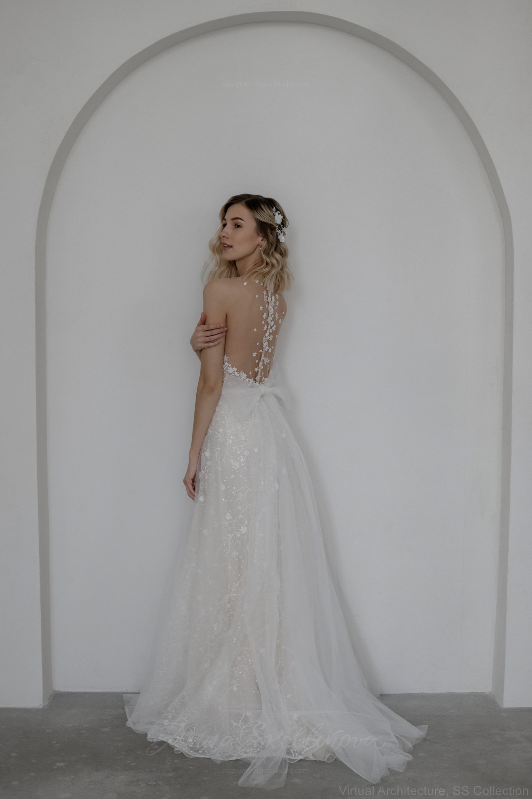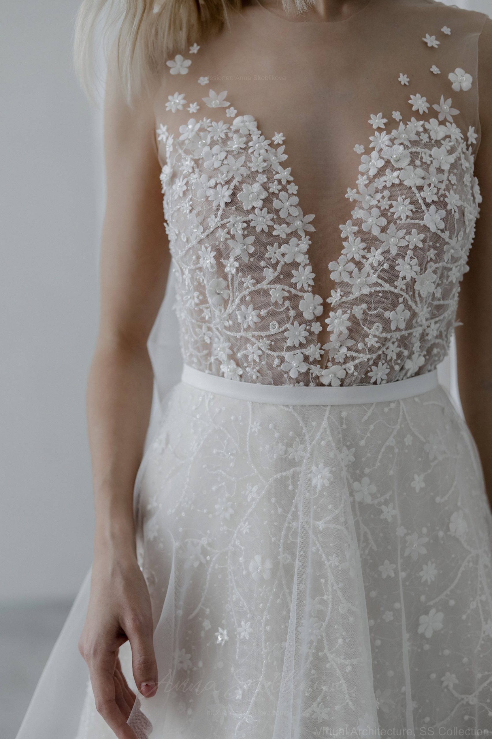Юбка выполнена из слоев шелковой органзы, тюля и кружева. Кружевное полотно вручную расшито небольшими цветочками из ткани. Боди из мягкой невидимо сетки вышито полностью вручную небольшими цветами и бусинами. Комплект удобен тем, что при желании сменить образ, вы можете поменять юбку на более простую или короткую и чувствовать себя более комфортно.