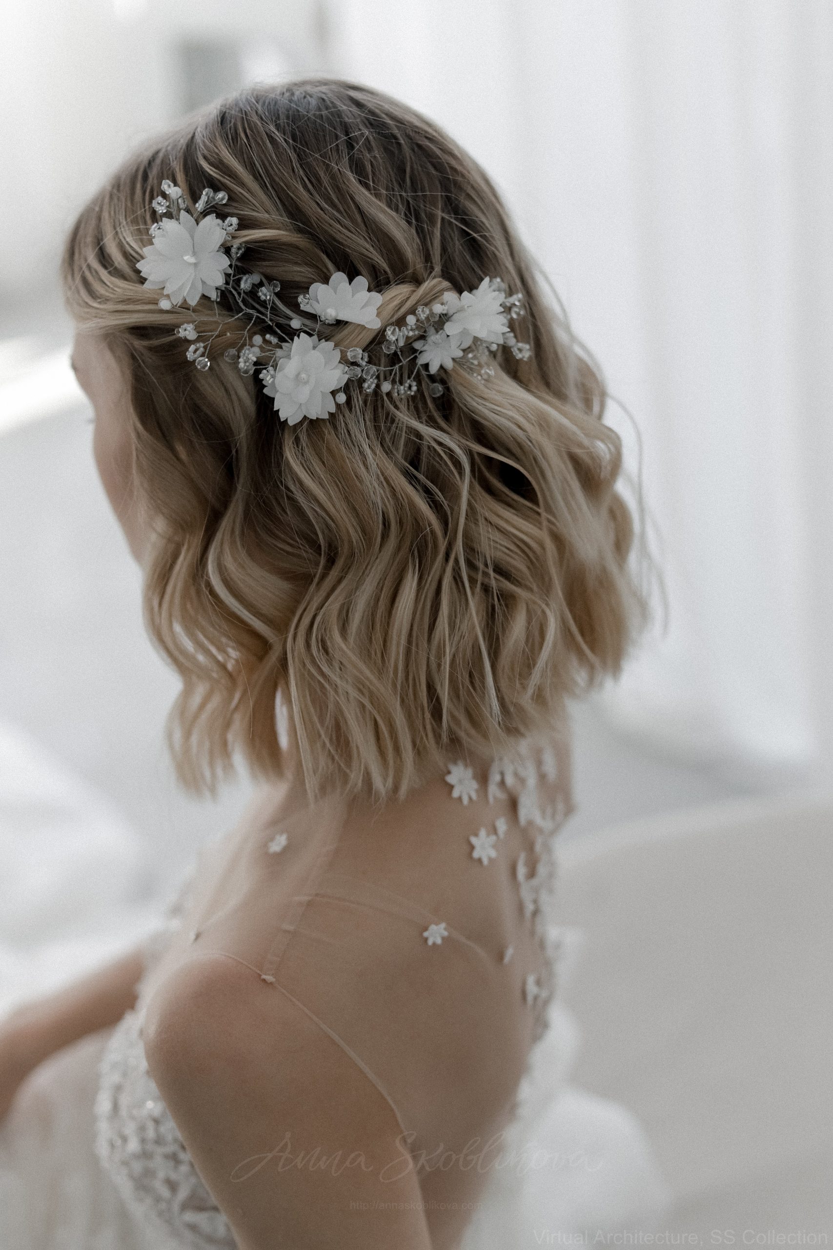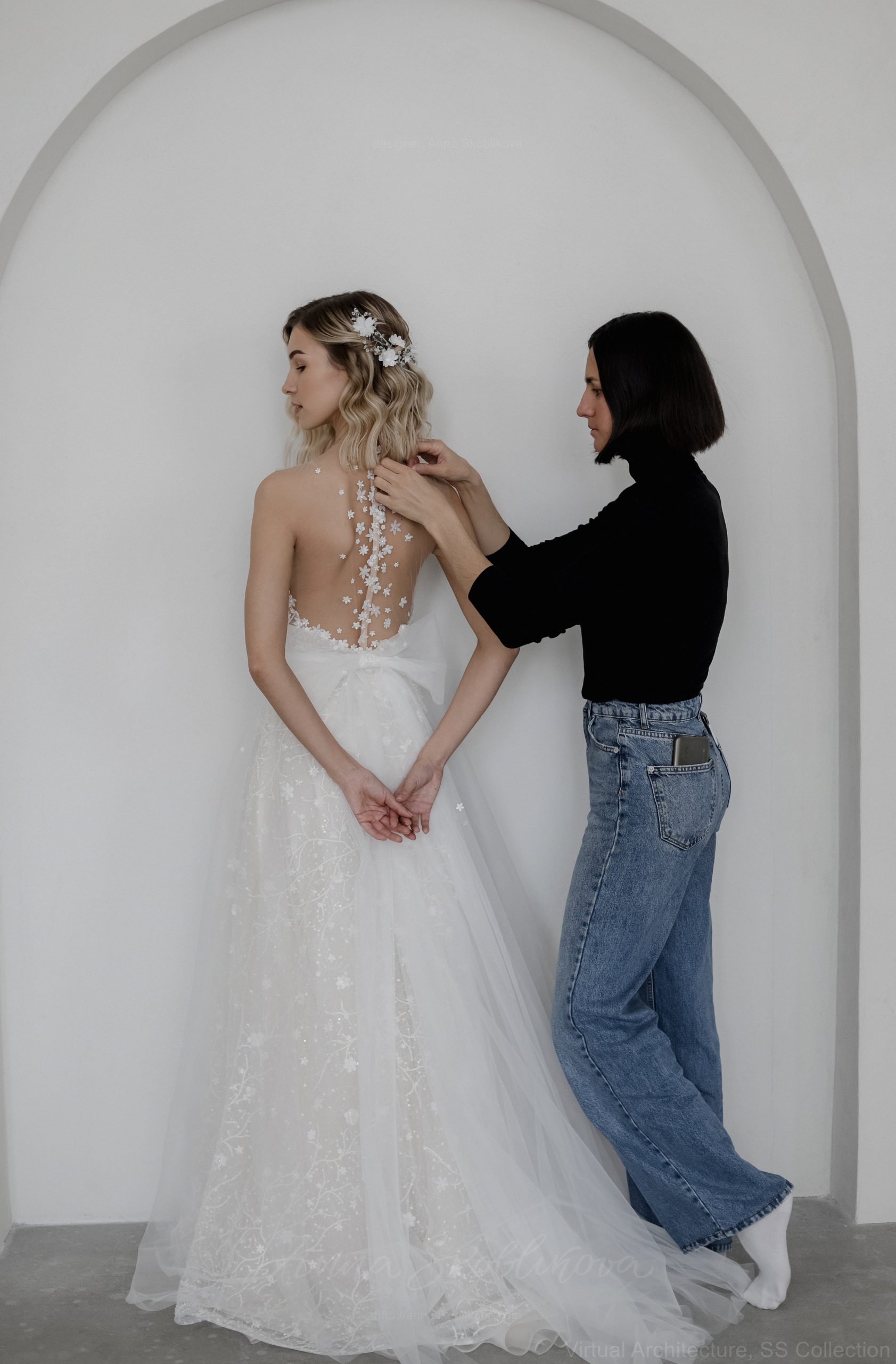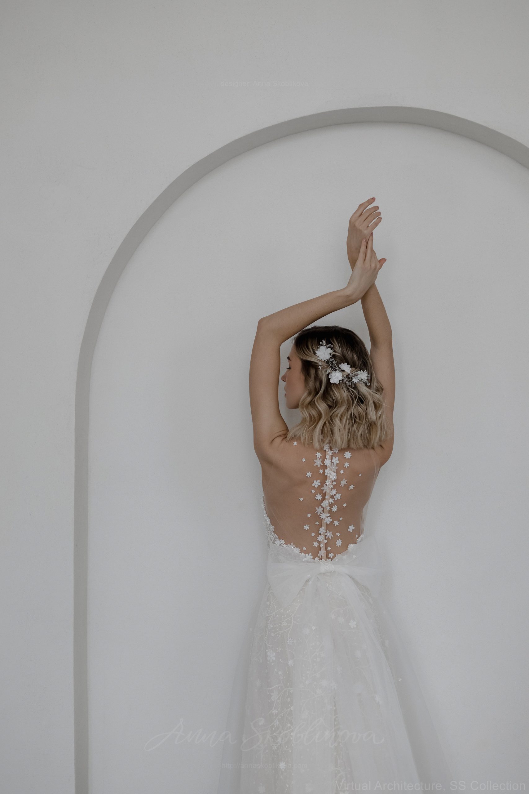 Юбка выполнена из слоев шелковой органзы, тюля и кружева. Кружевное полотно вручную расшито небольшими цветочками из ткани. Боди из мягкой невидимо сетки вышито полностью вручную небольшими цветами и бусинами. Комплект удобен тем, что при желании сменить образ, вы можете поменять юбку на более простую или короткую и чувствовать себя более комфортно.