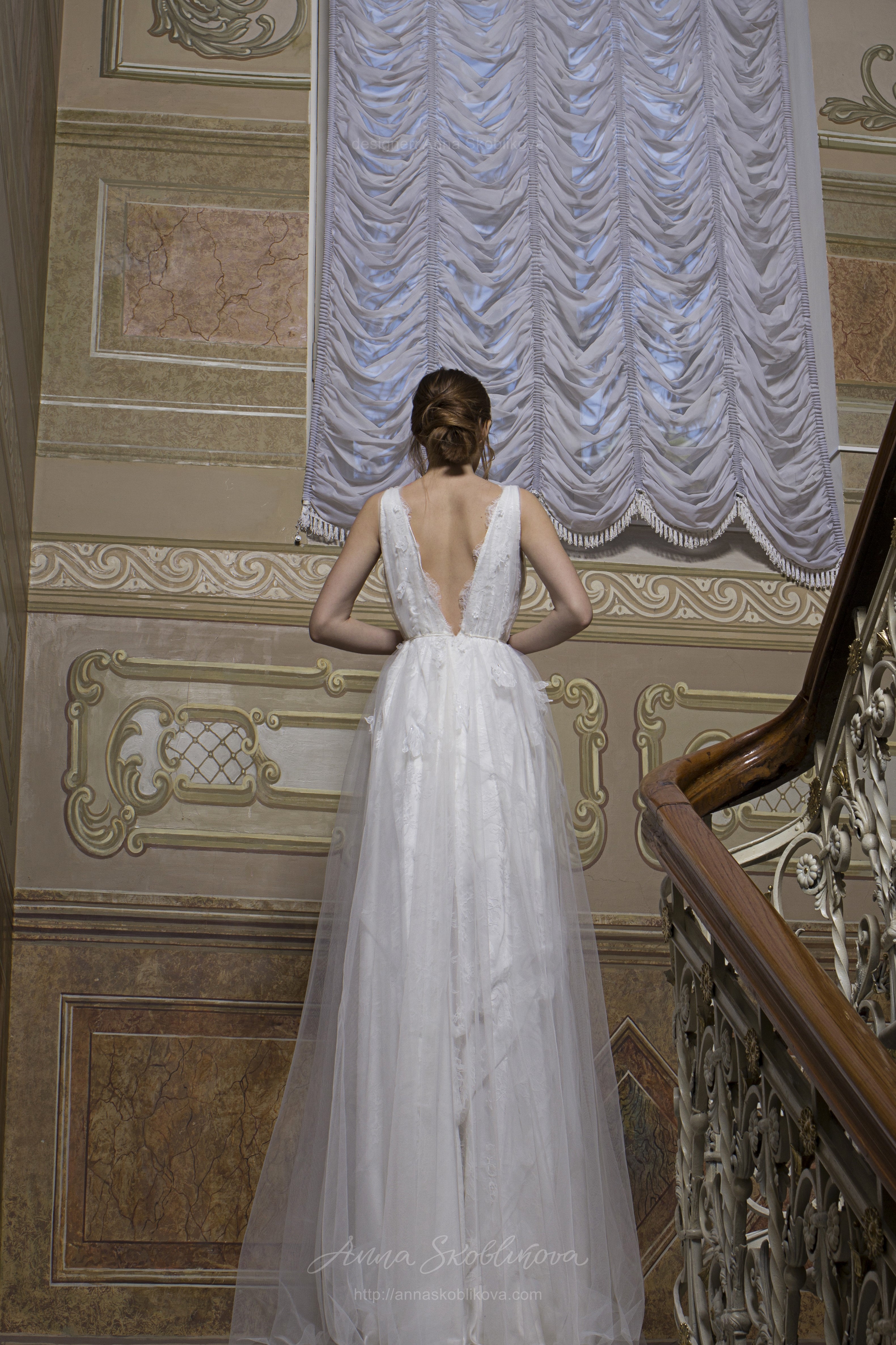 Спереди декольте средней глубины, также с фестонами по краям. Платье имеет застежку на потайную молнию сзади. Цветы для декора вырезаны из кружева и пришиты вручную, создав эффект легких бабочек, которые сели на полотно.