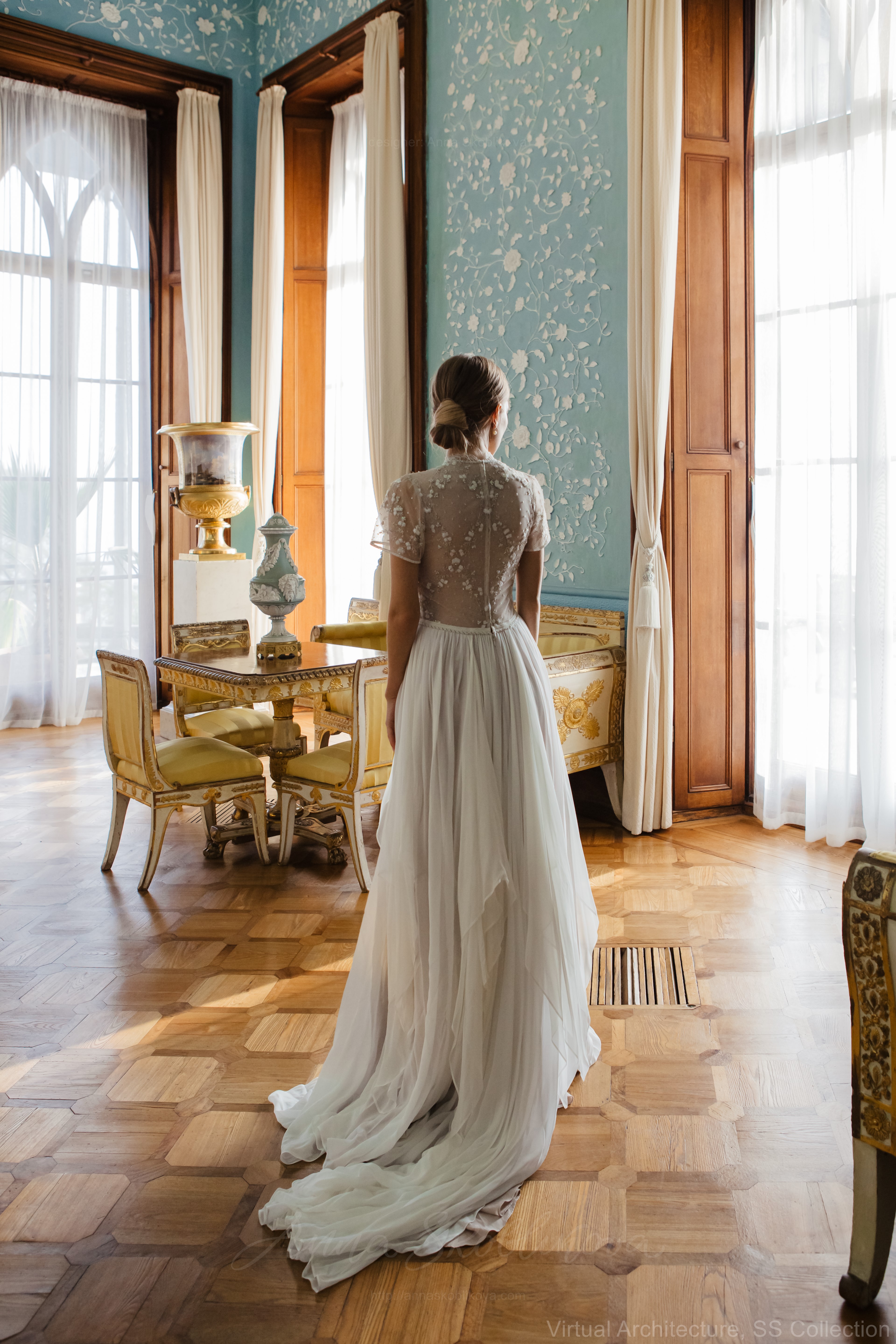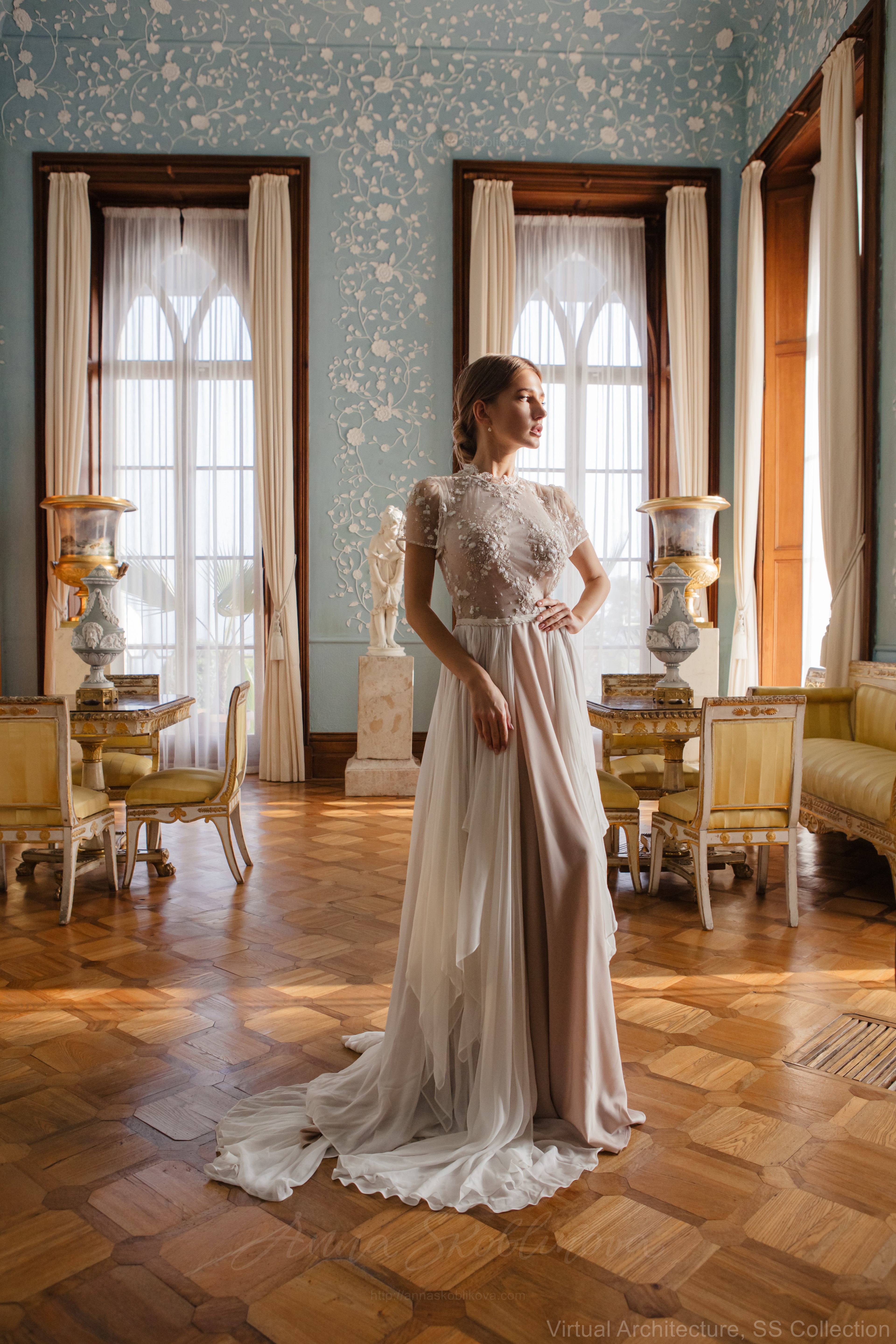 Свадебное платье Oseana – изделие с уникальным кружевом и многослойной юбкой. Лиф с короткими рукавами, высокой горловиной и закрытой спинкой немного прозрачный, имеет несколько слоев шелковой сетки внутри, и дополнительную вышивку в области груди.