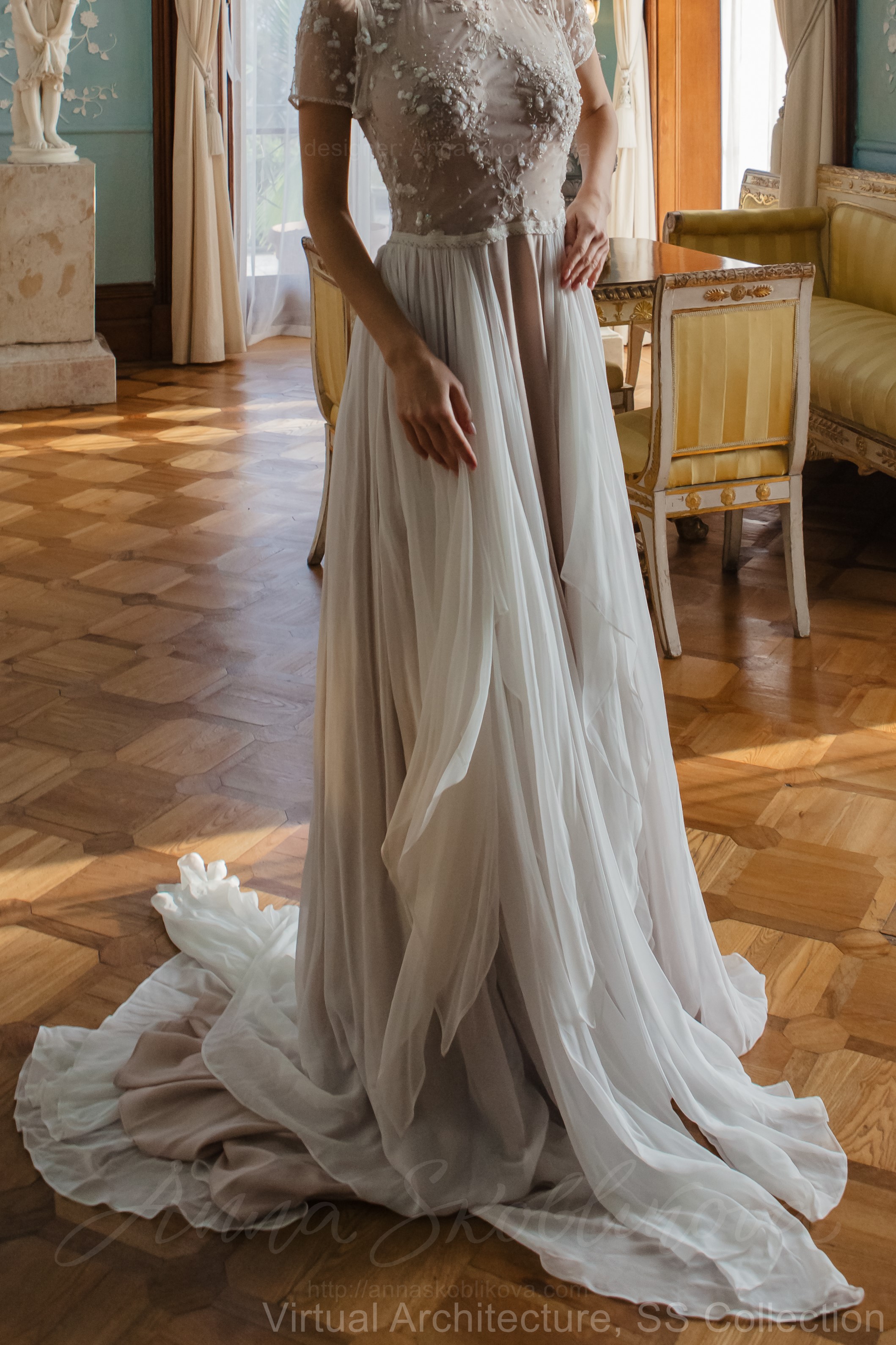 Чтобы добавить структуры в юбку, мы сделали внешние ассиметричные ярусные клинья, из очень прозрачного шифона. Они добавляют объём не перегружая свадебное платье.