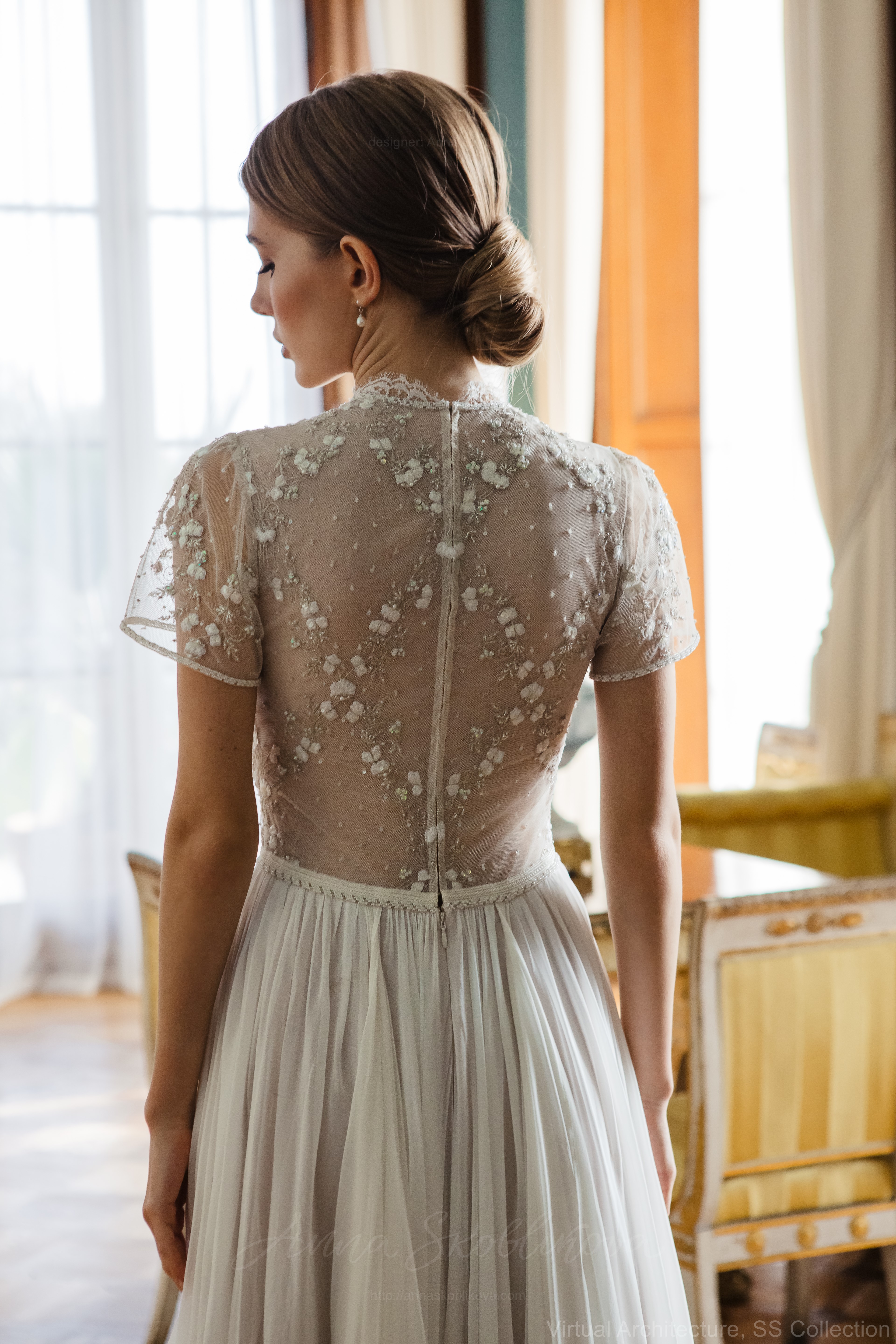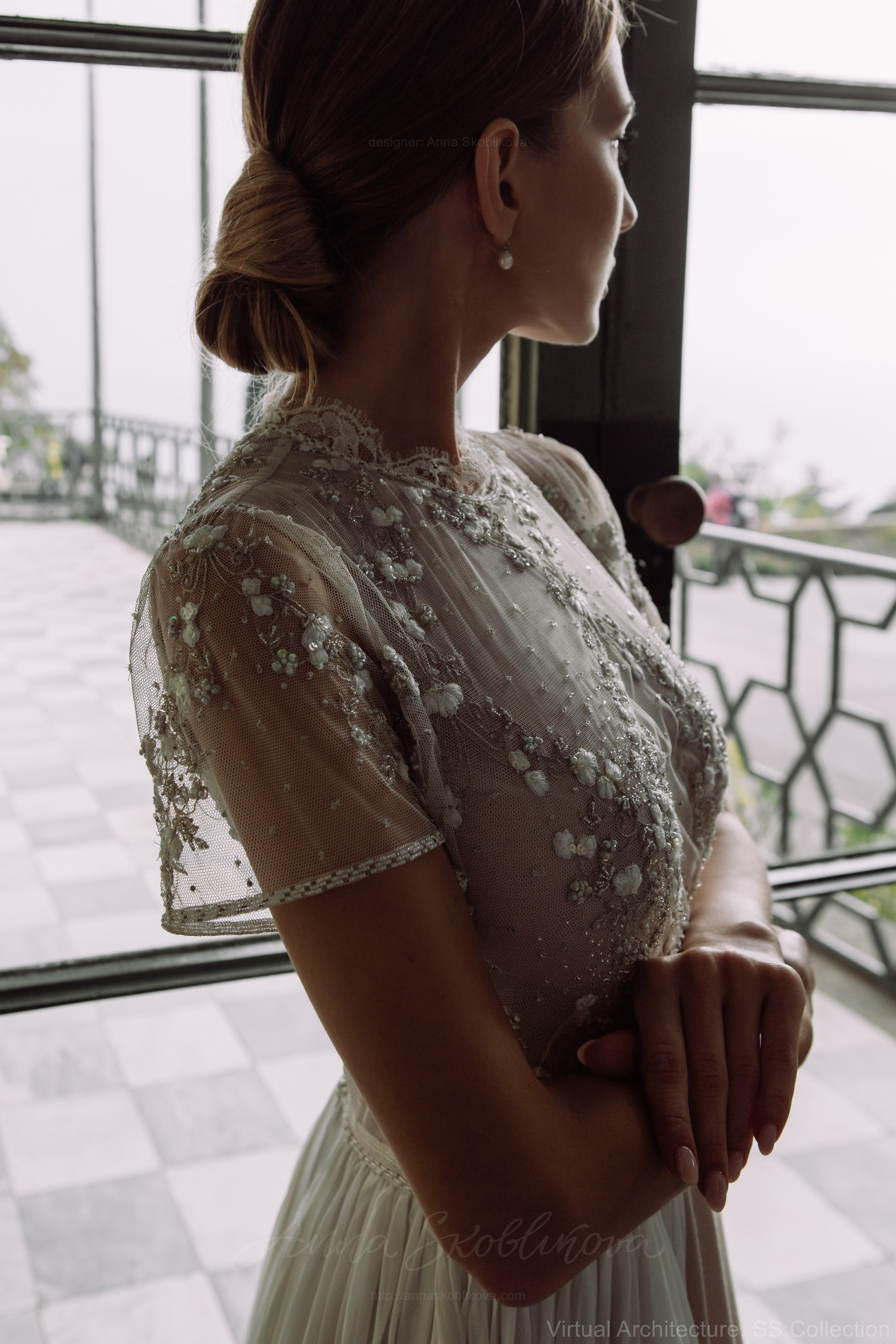 Небольшая горловина-стойка с фестончатым краем придает свадебному платью элегантный вид. У свадебного платья лаконичный короткий рукав, обрамленный узким кружевом с ручной вышивкой по краю.