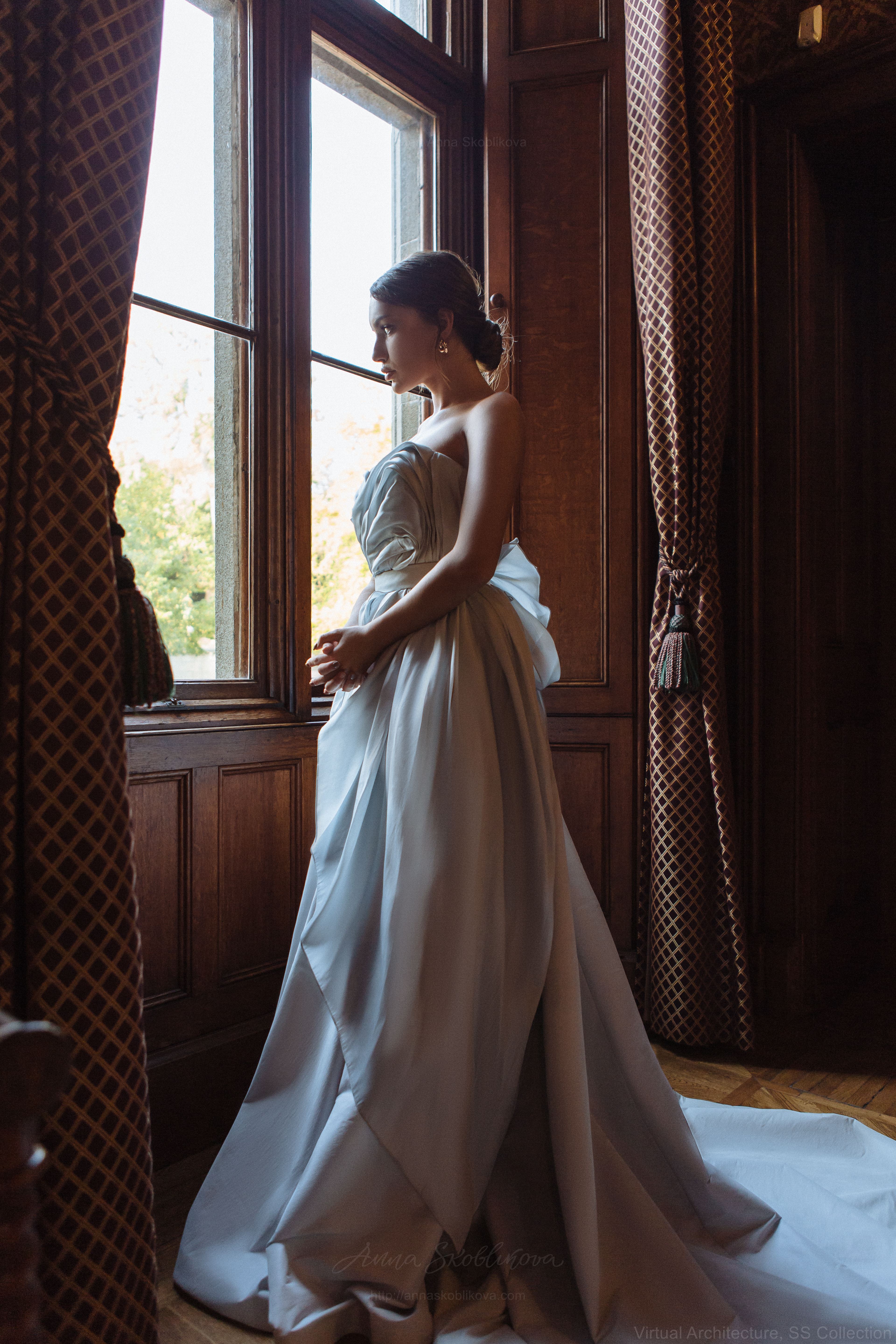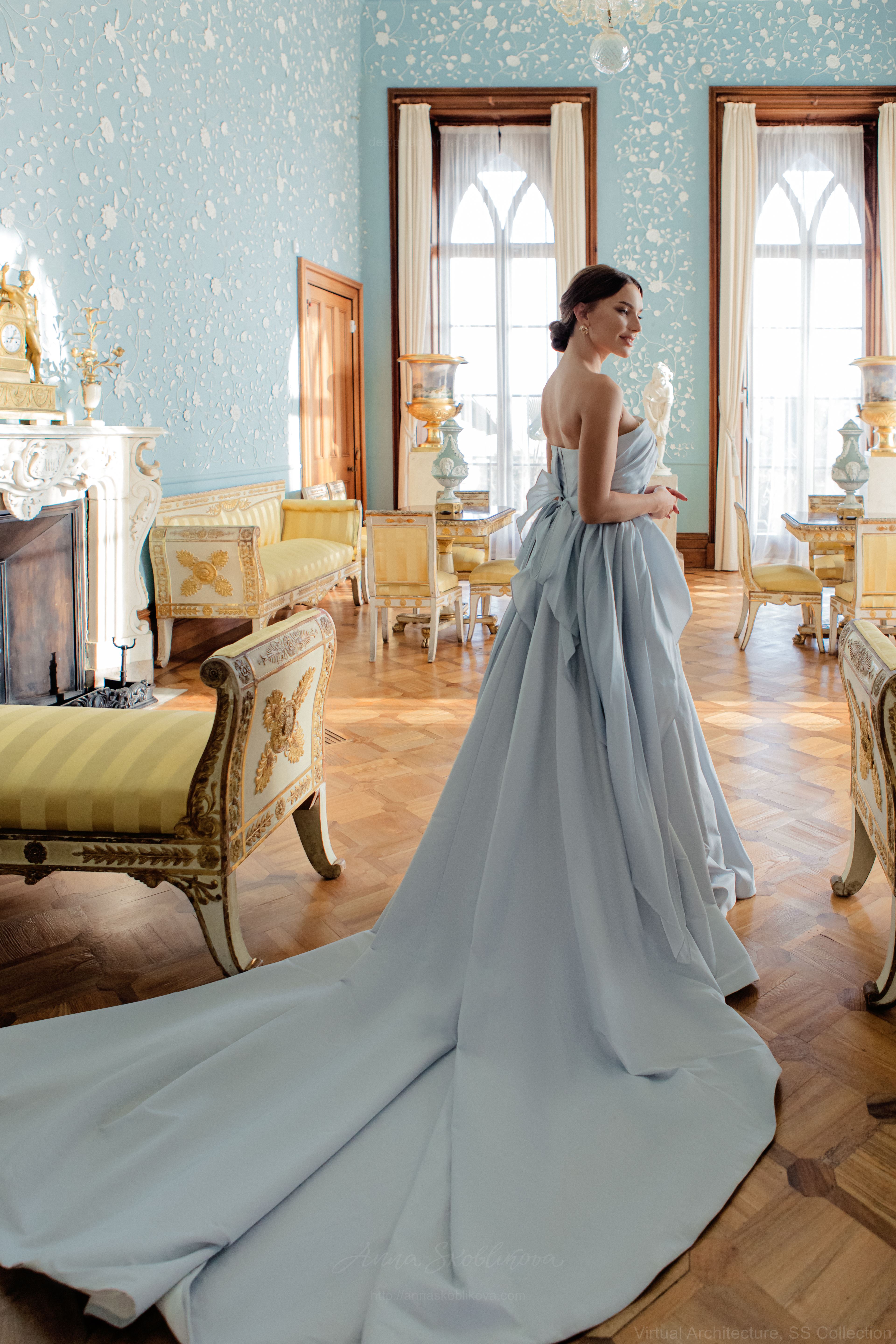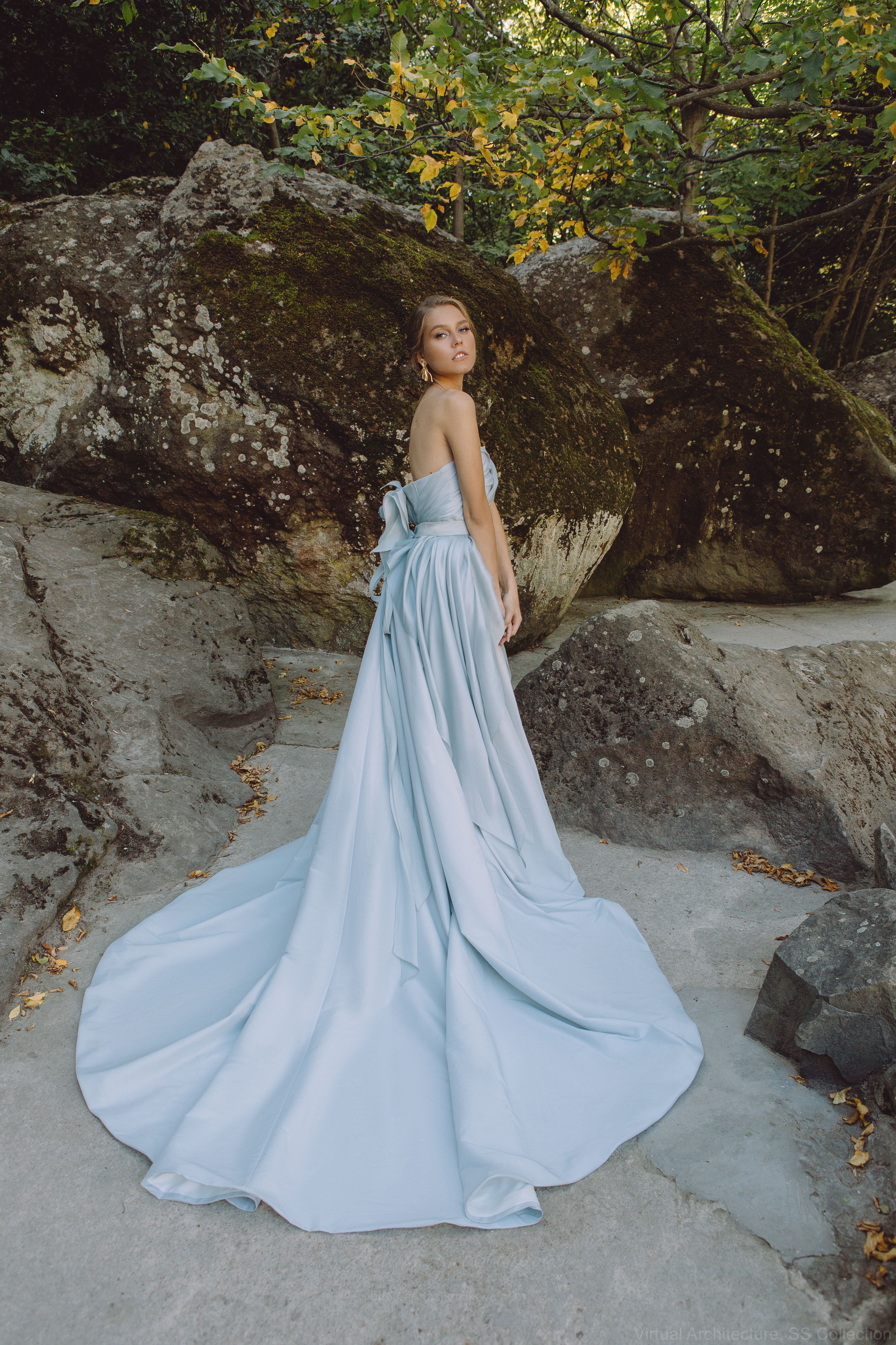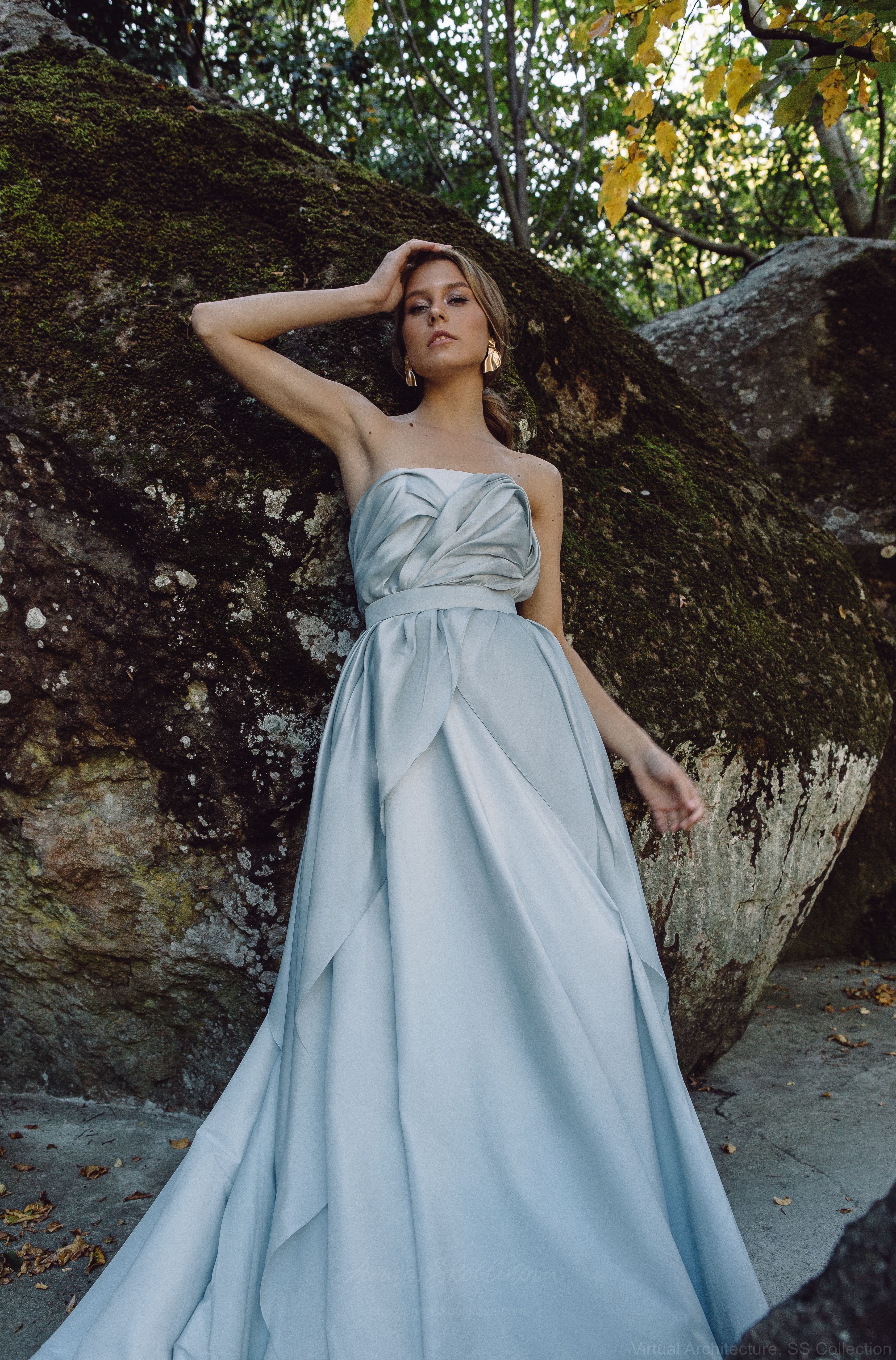 Свадебное платье дымчато-голубого цвета из натурального шелка нескольких видов.