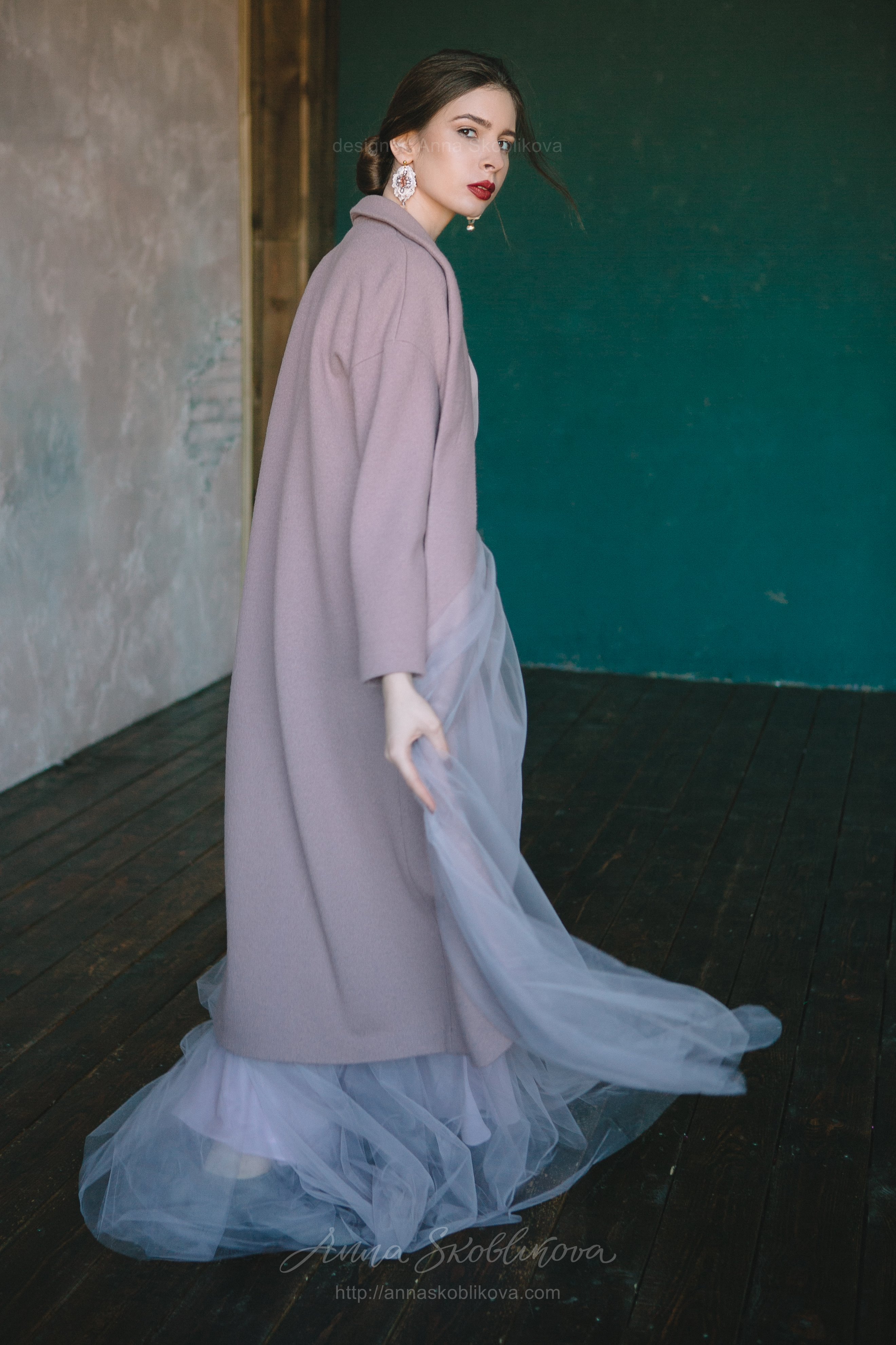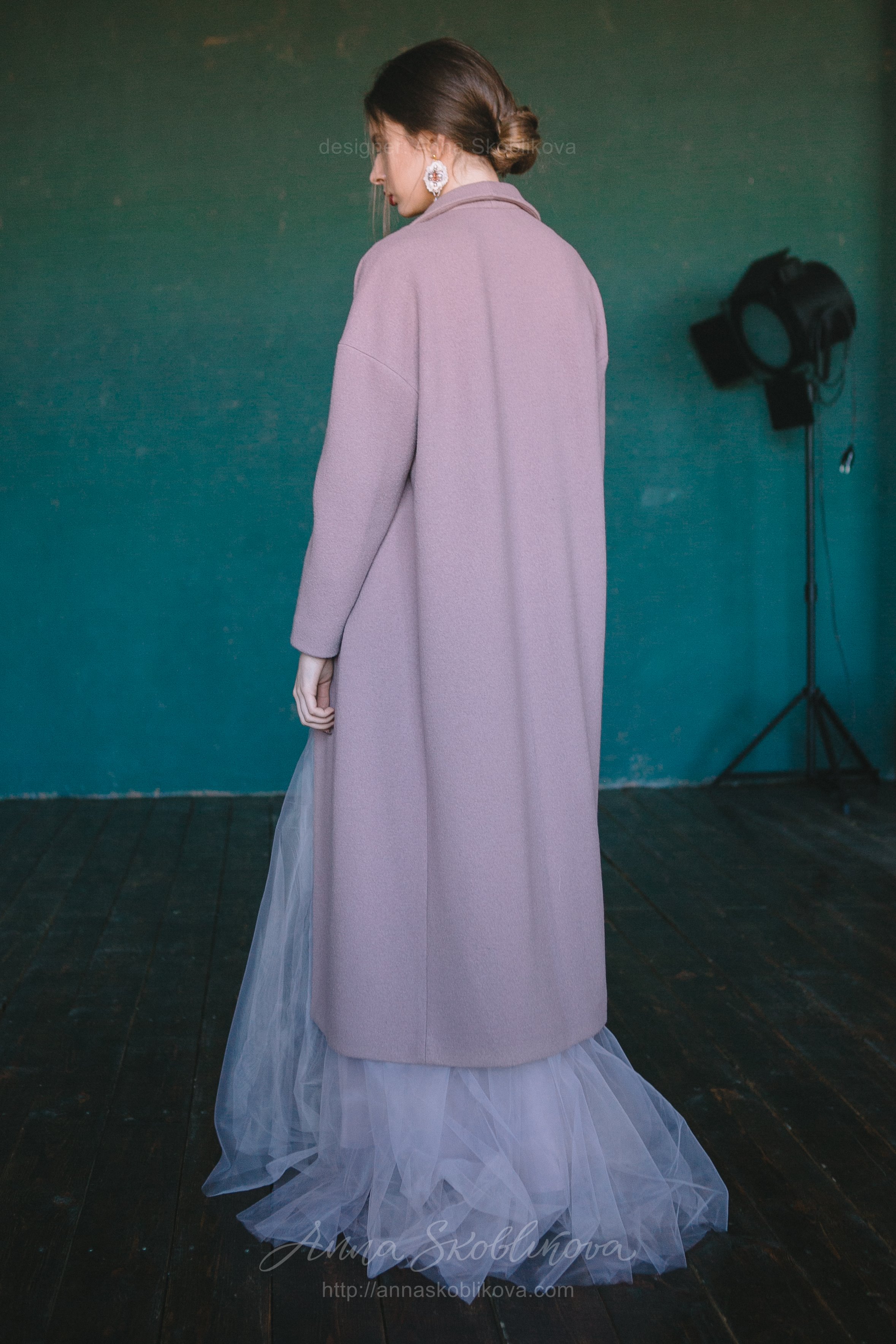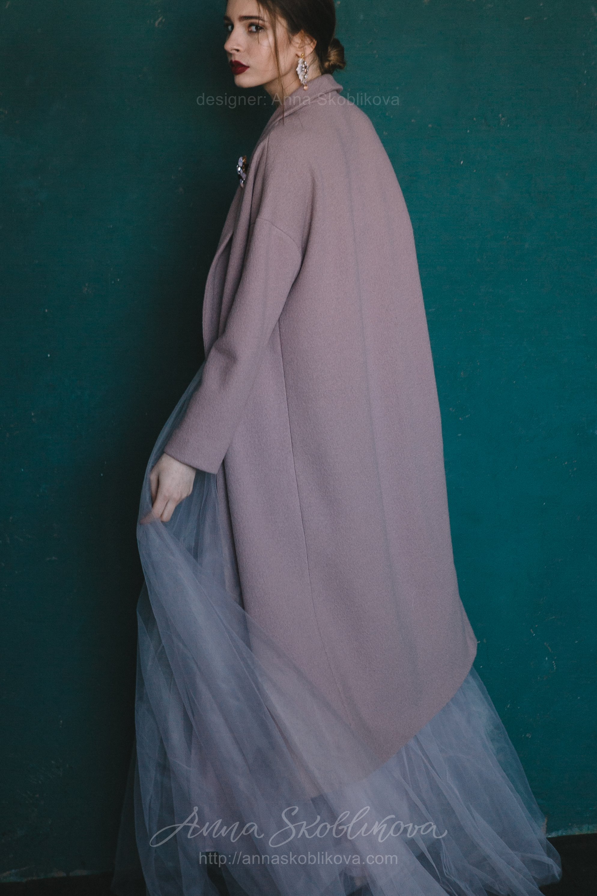 Кардиган с воротником-шалькой (шалевый воротник, халатный воротник) Длиной до икры. Кардиган выполнен из пальтовой ткани – состав 100% шерсть мериноса. Кардиган имеет спущенную линию плеча и прямой крой. Застежка – под пояс