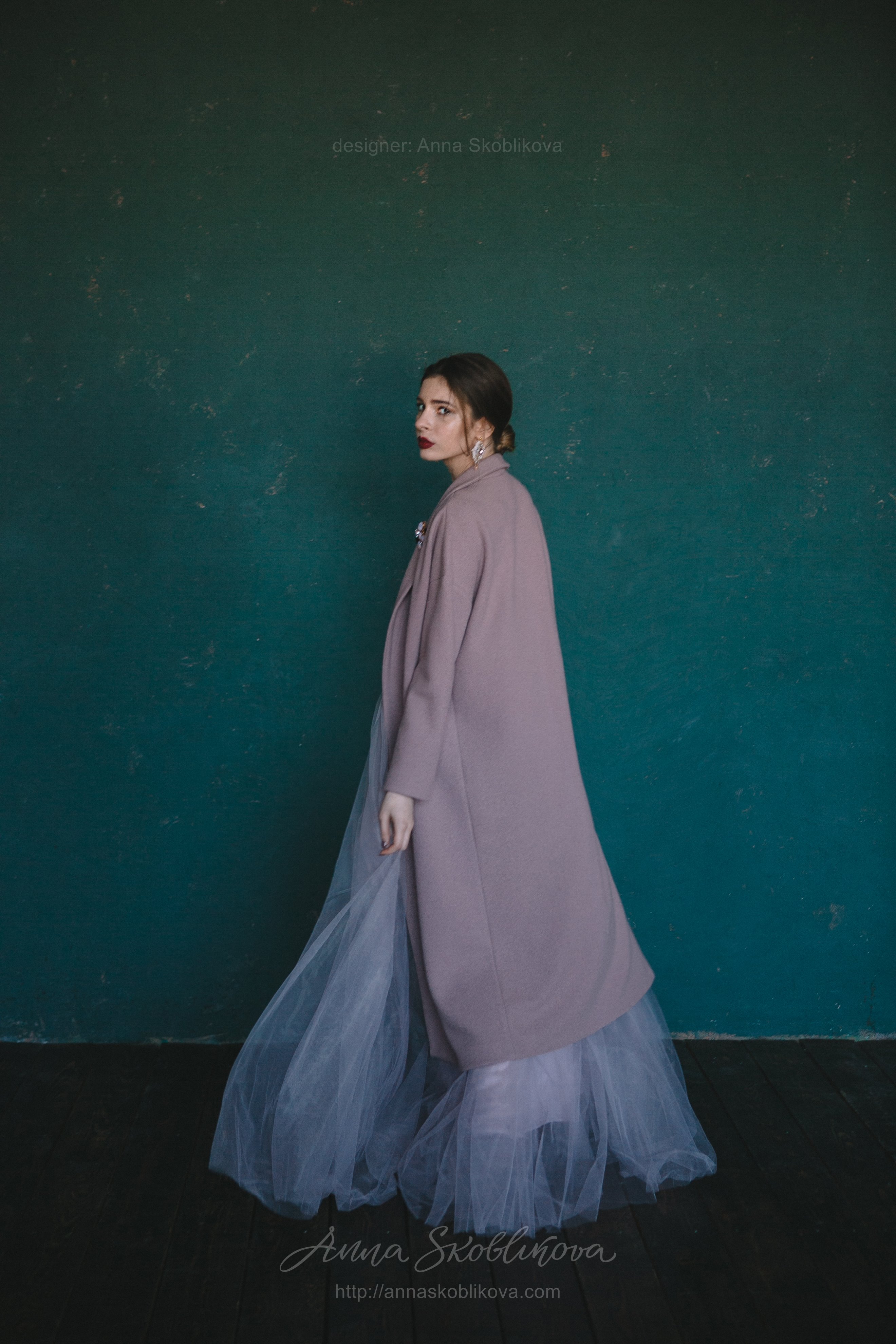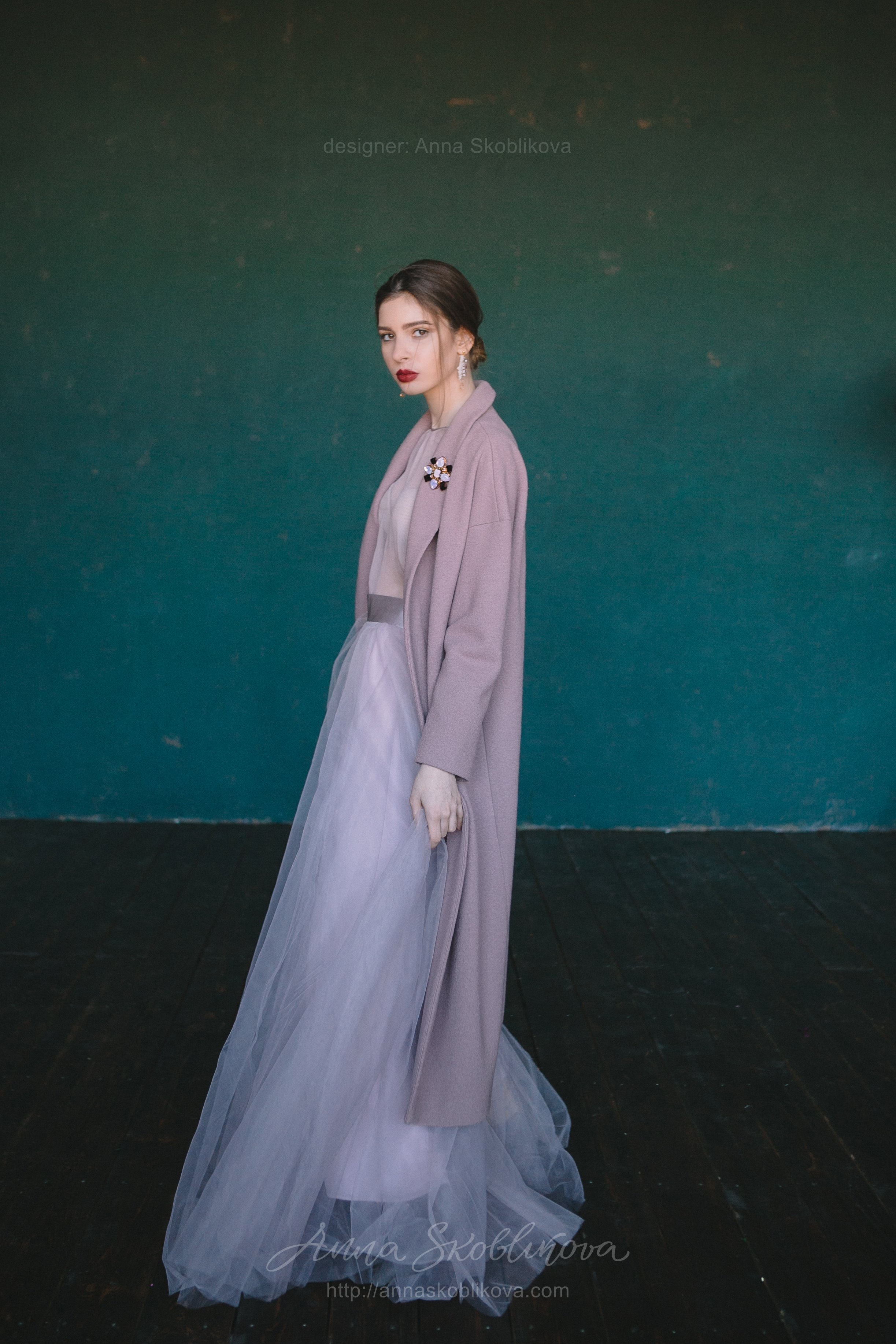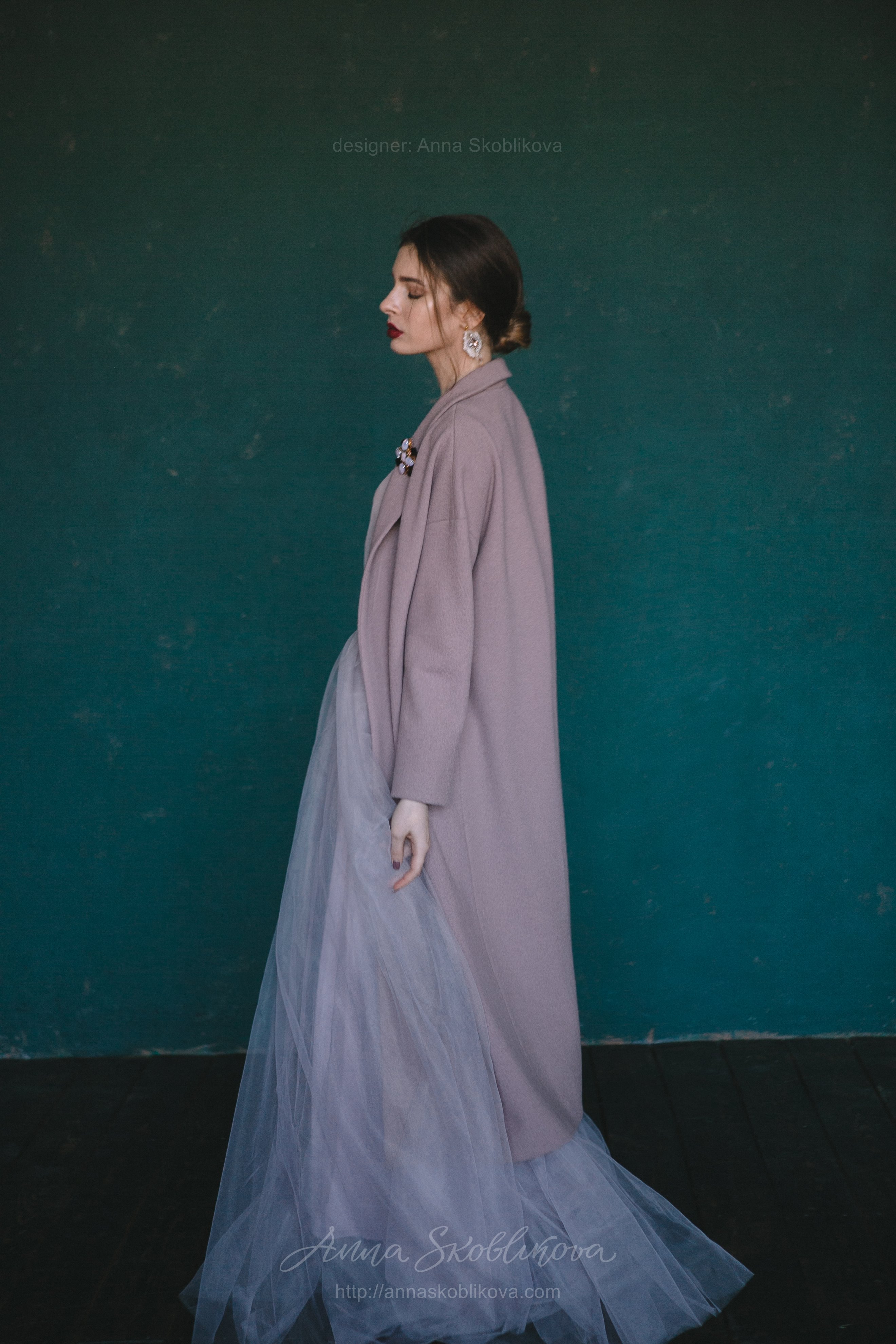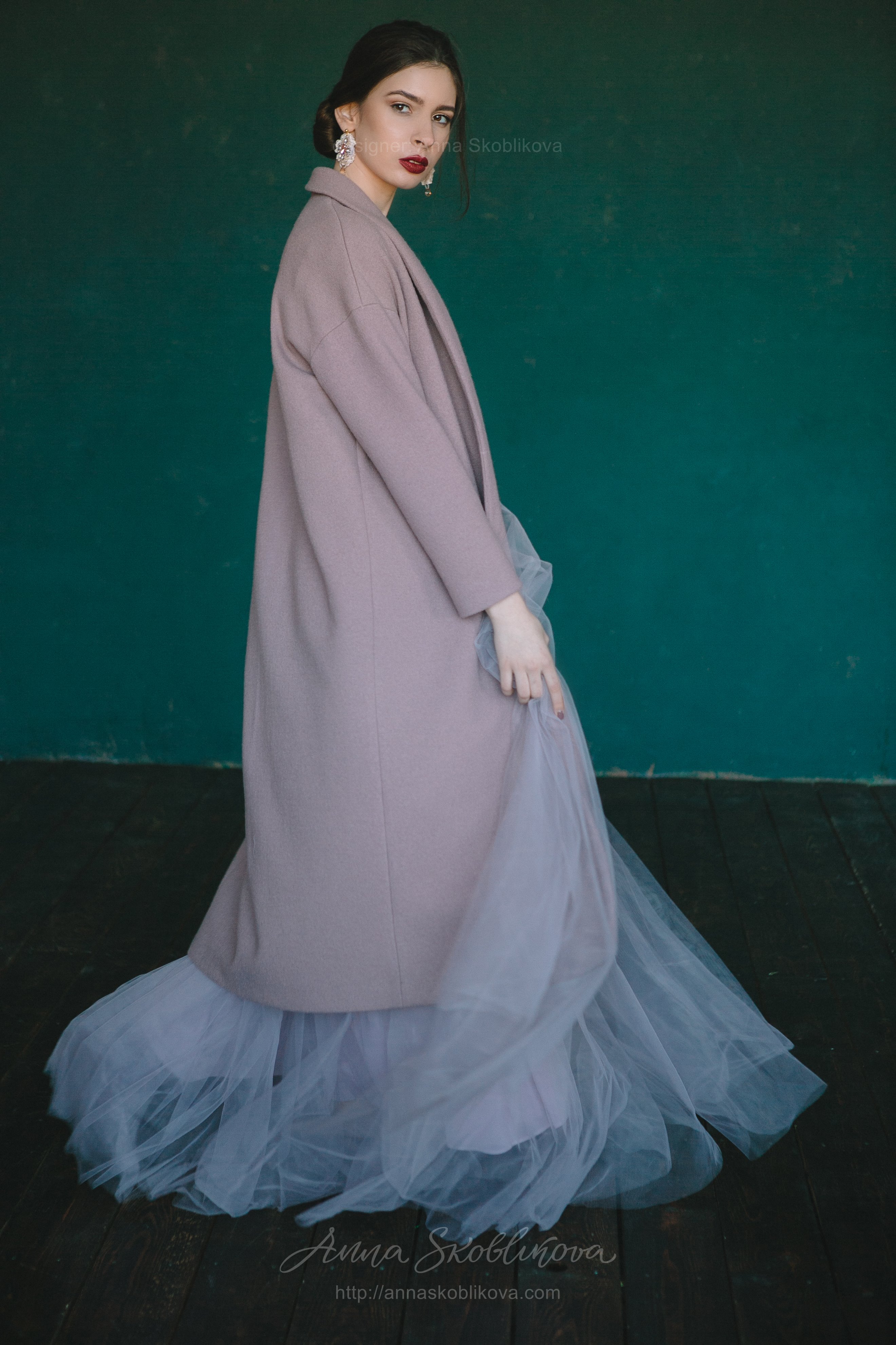 Кардиган с воротником-шалькой (шалевый воротник, халатный воротник) Длиной до икры. Кардиган выполнен из пальтовой ткани – состав 100% шерсть мериноса. Кардиган имеет спущенную линию плеча и прямой крой. Застежка – под пояс