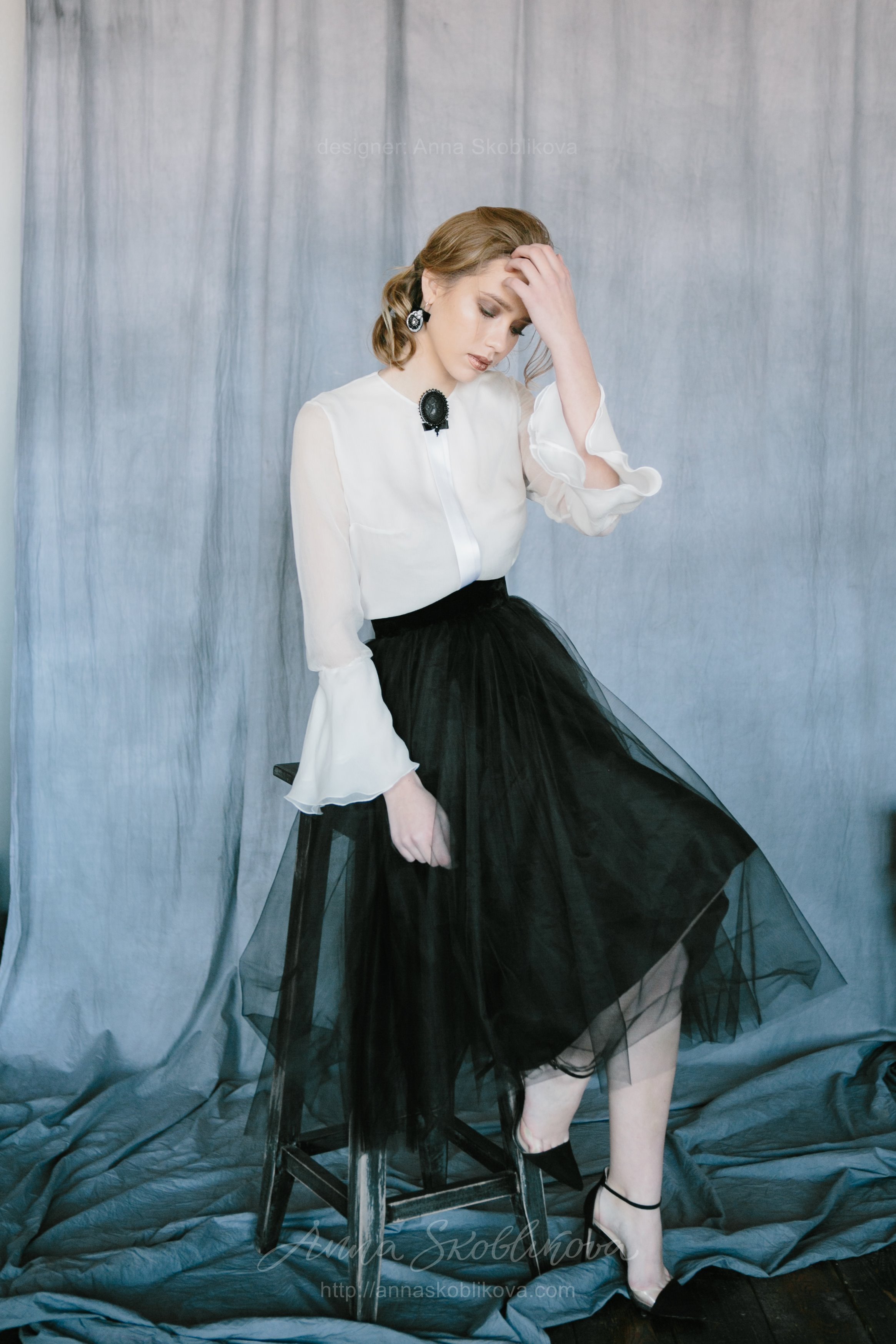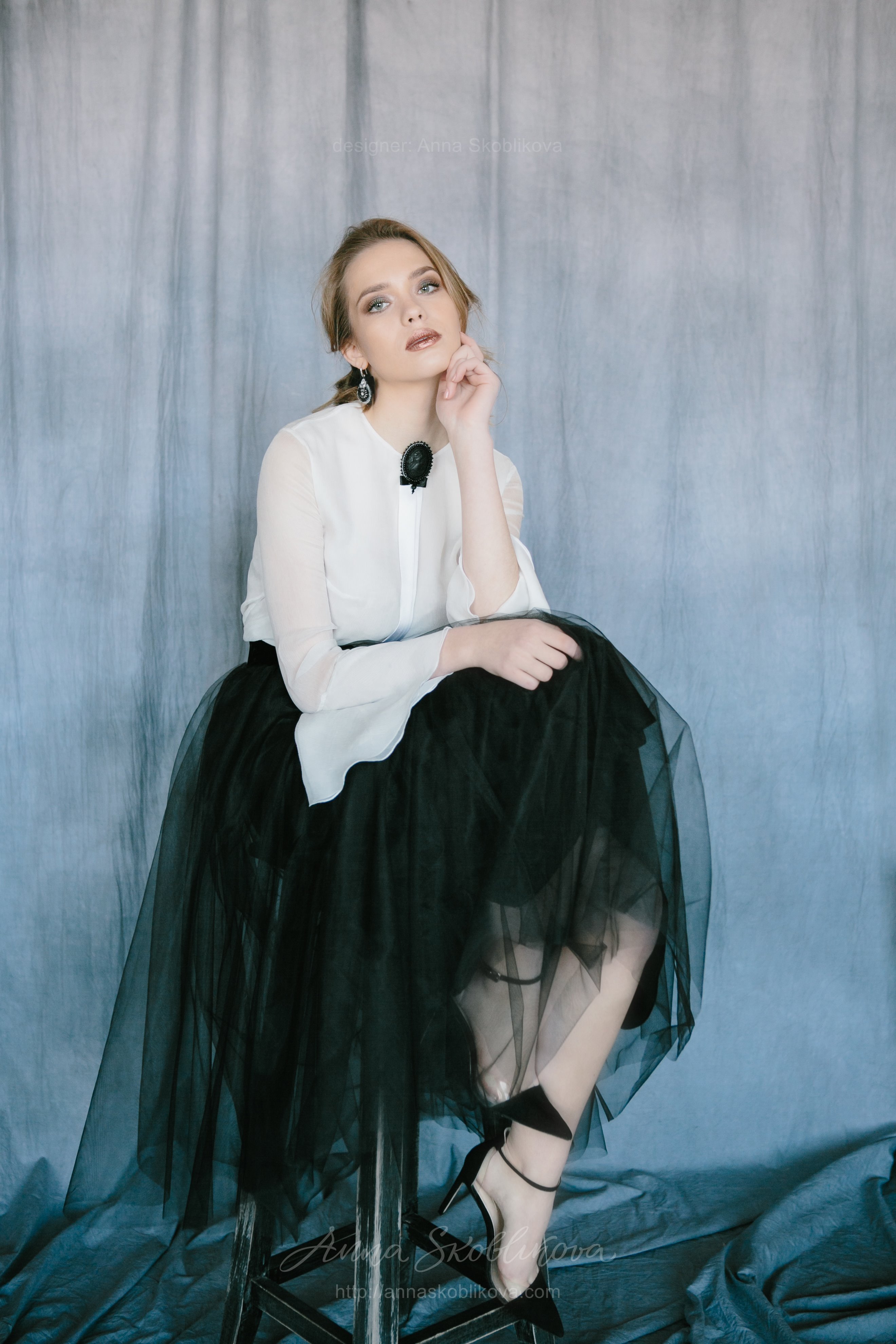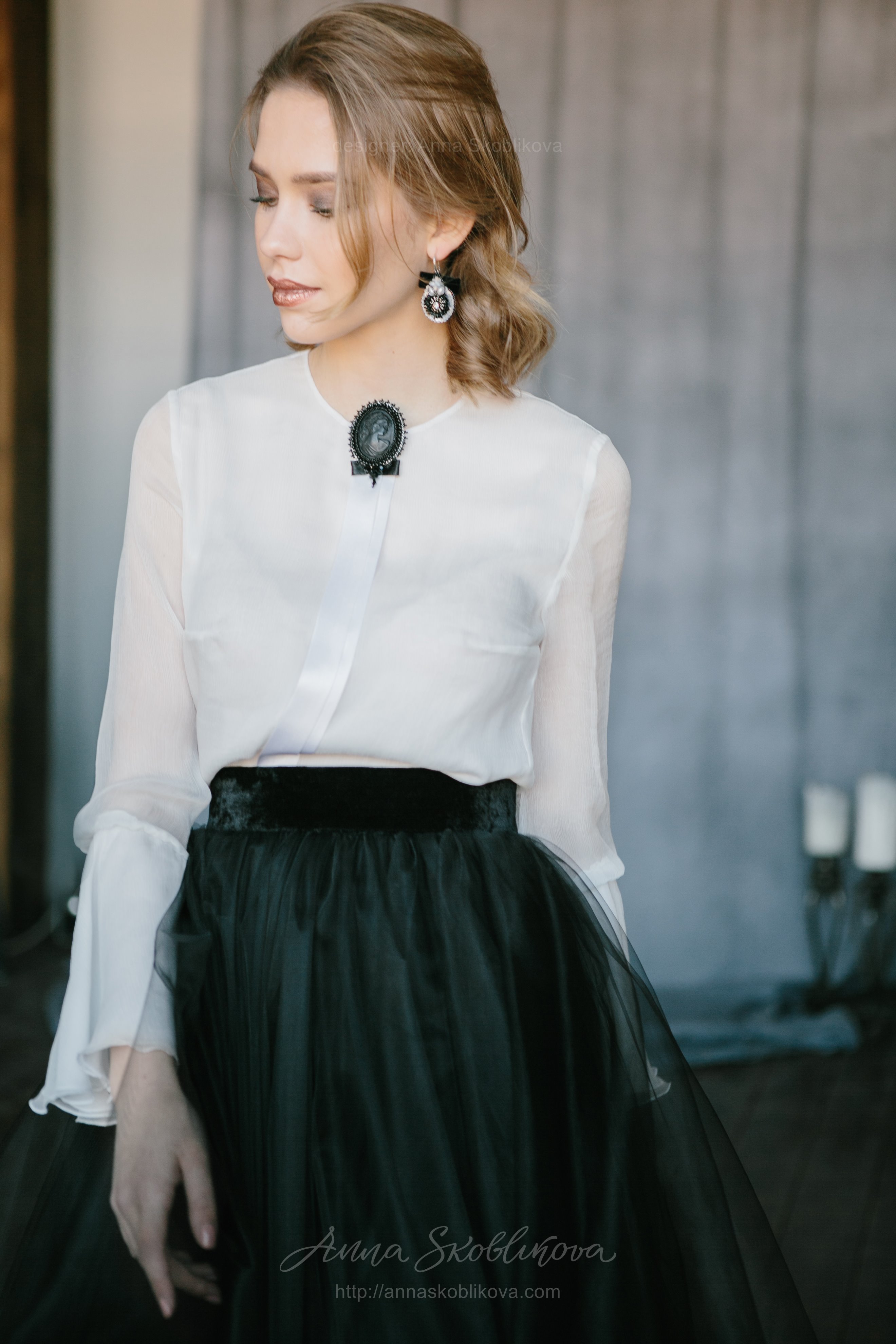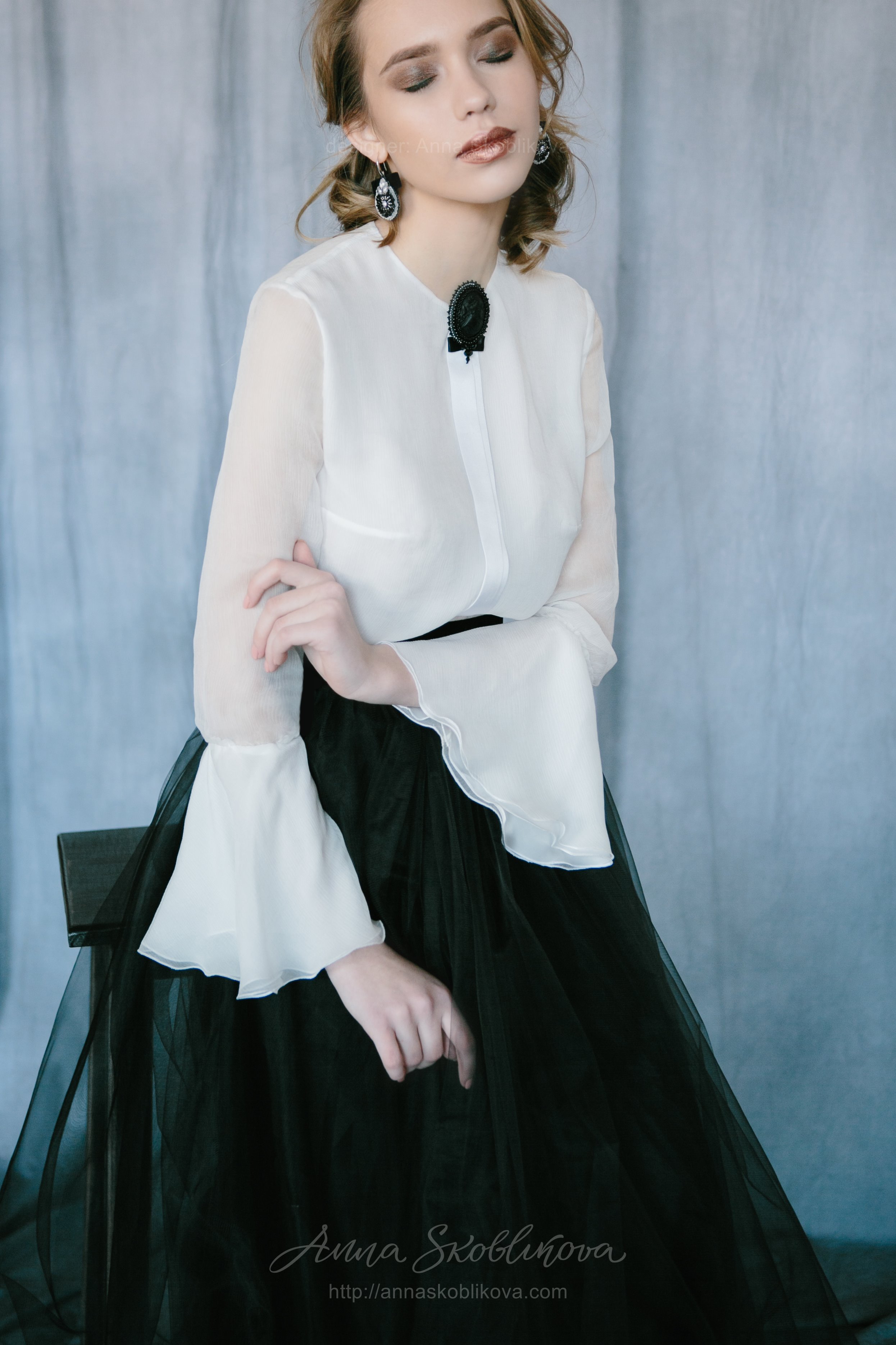 Классический вариант – черно-белый комплект всегда актуален. Пышная фатиновая юбка длиной миди с черным бархатным поясом. Блуза из натуральных материалов с двуслойной полочкой и необычным кроем рукава с манжетами-колокольчиками. Брошь для блузы отдельный аксессуар, который вы можете заказать написав нам.