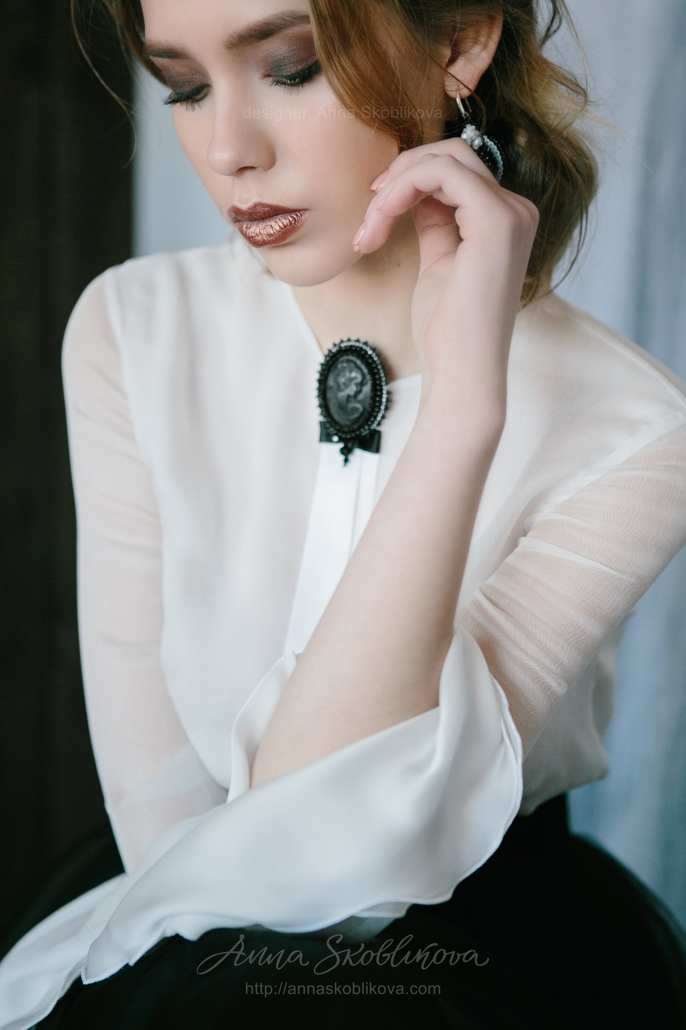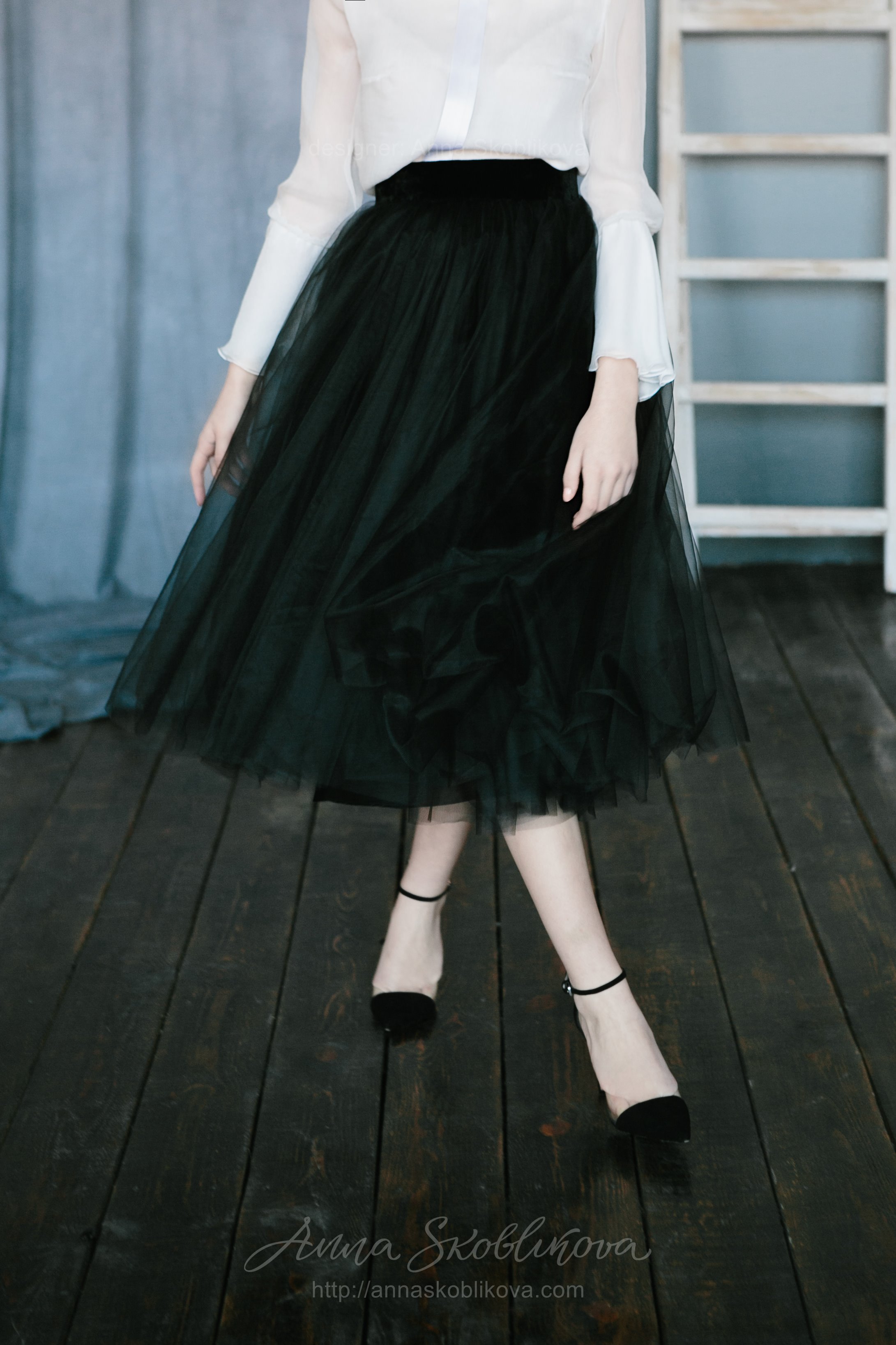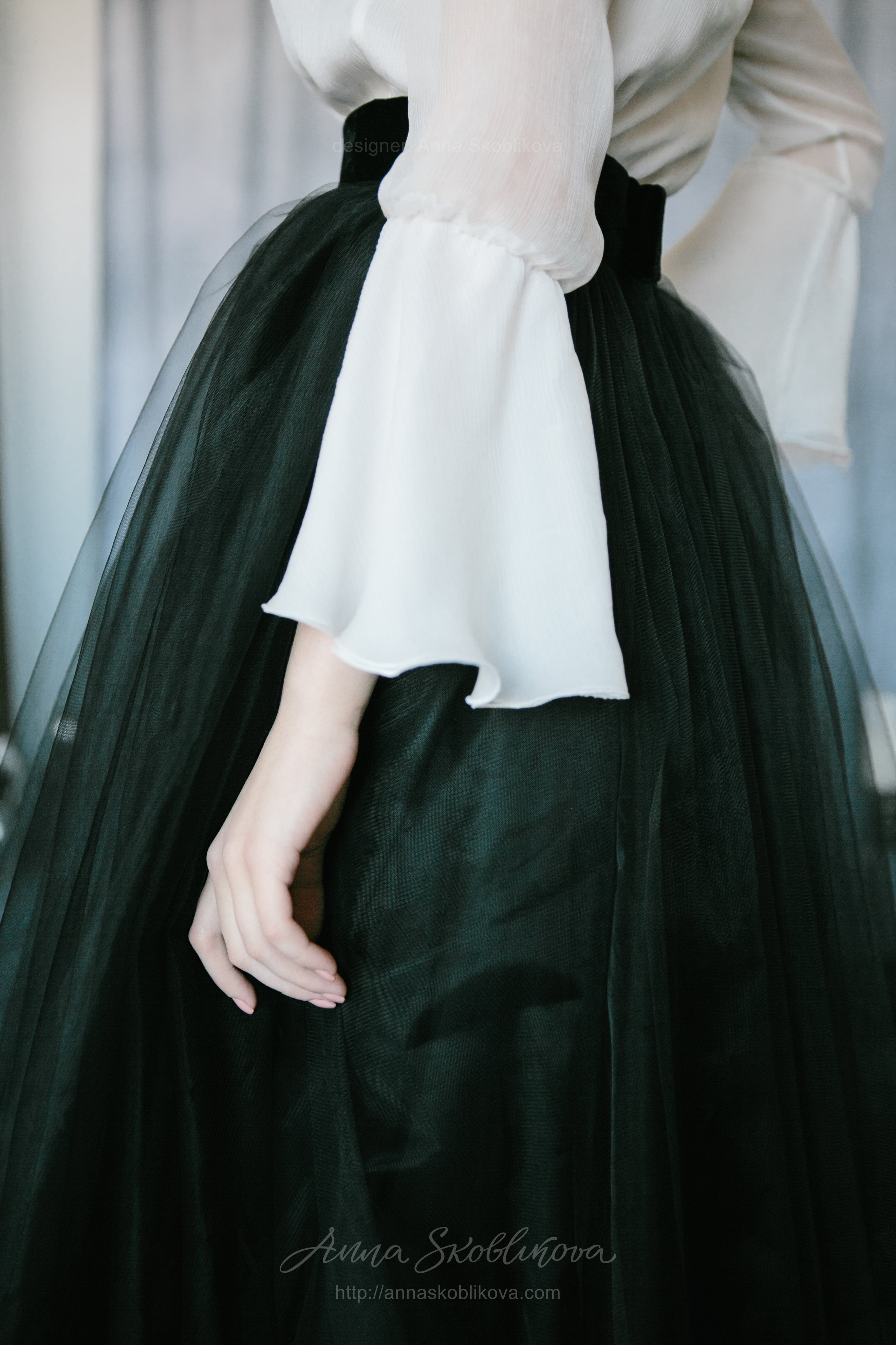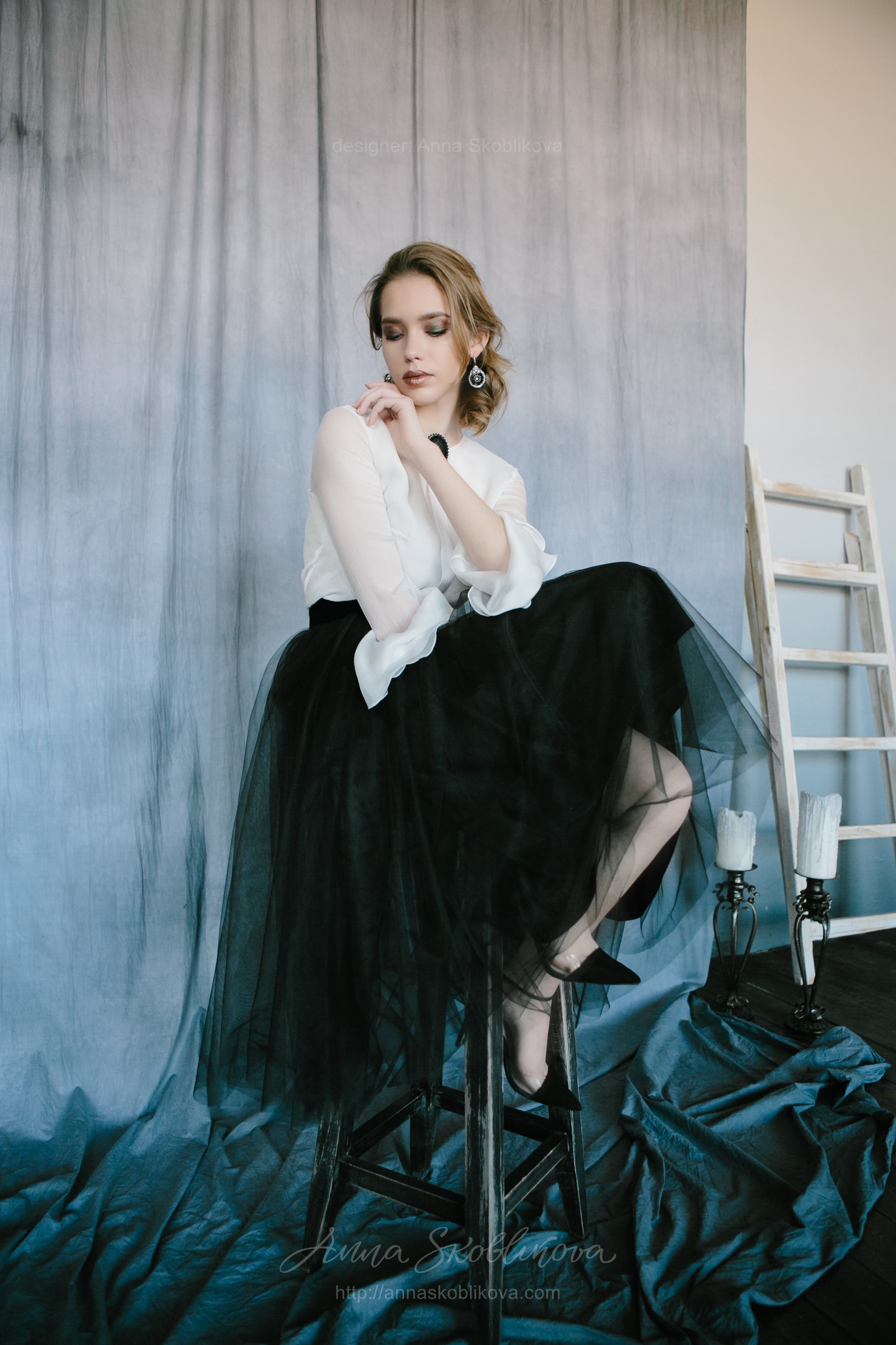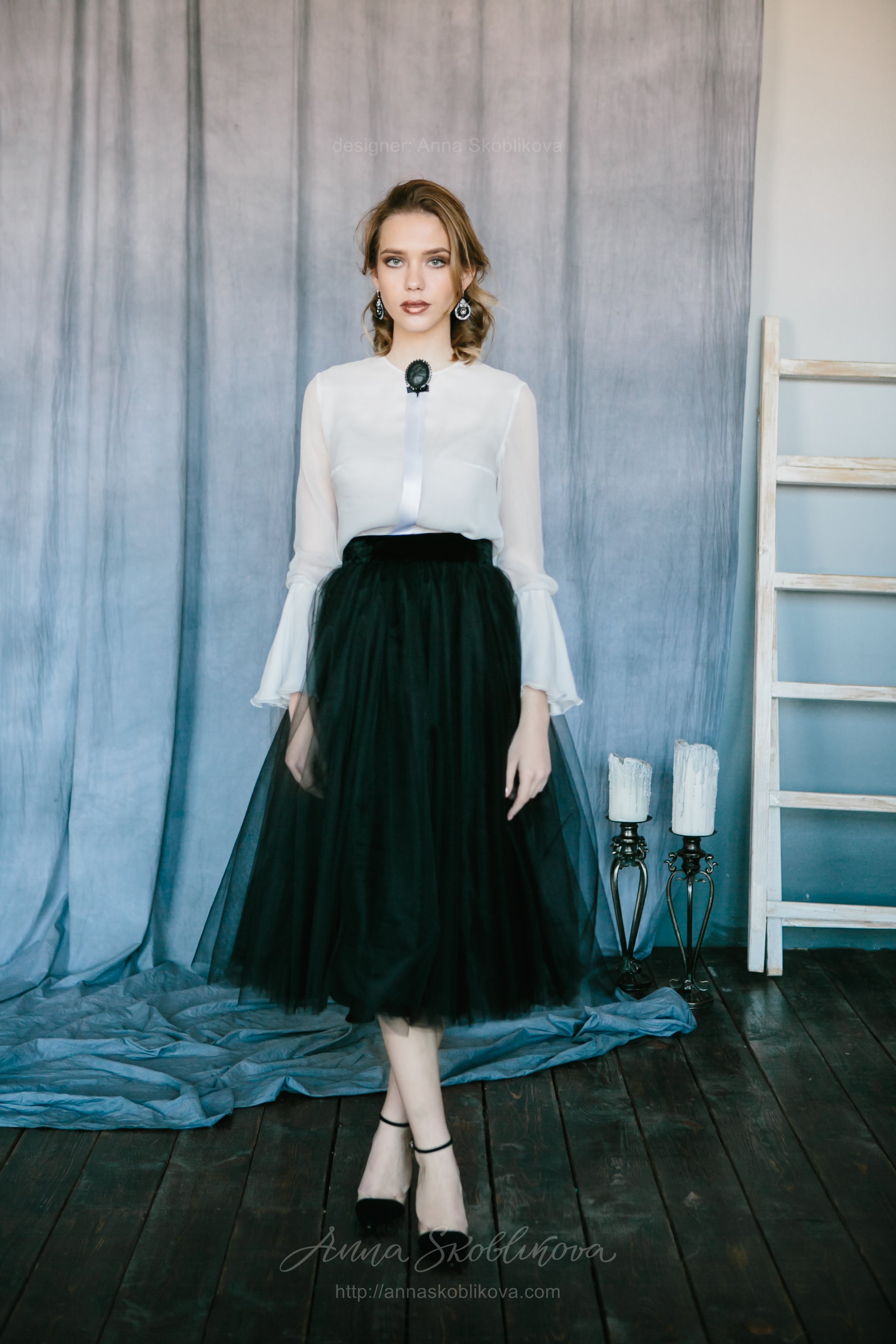 Классический вариант – черно-белый комплект всегда актуален. Пышная фатиновая юбка длиной миди с черным бархатным поясом. Блуза из натуральных материалов с двуслойной полочкой и необычным кроем рукава с манжетами-колокольчиками. Брошь для блузы отдельный аксессуар, который вы можете заказать написав нам.