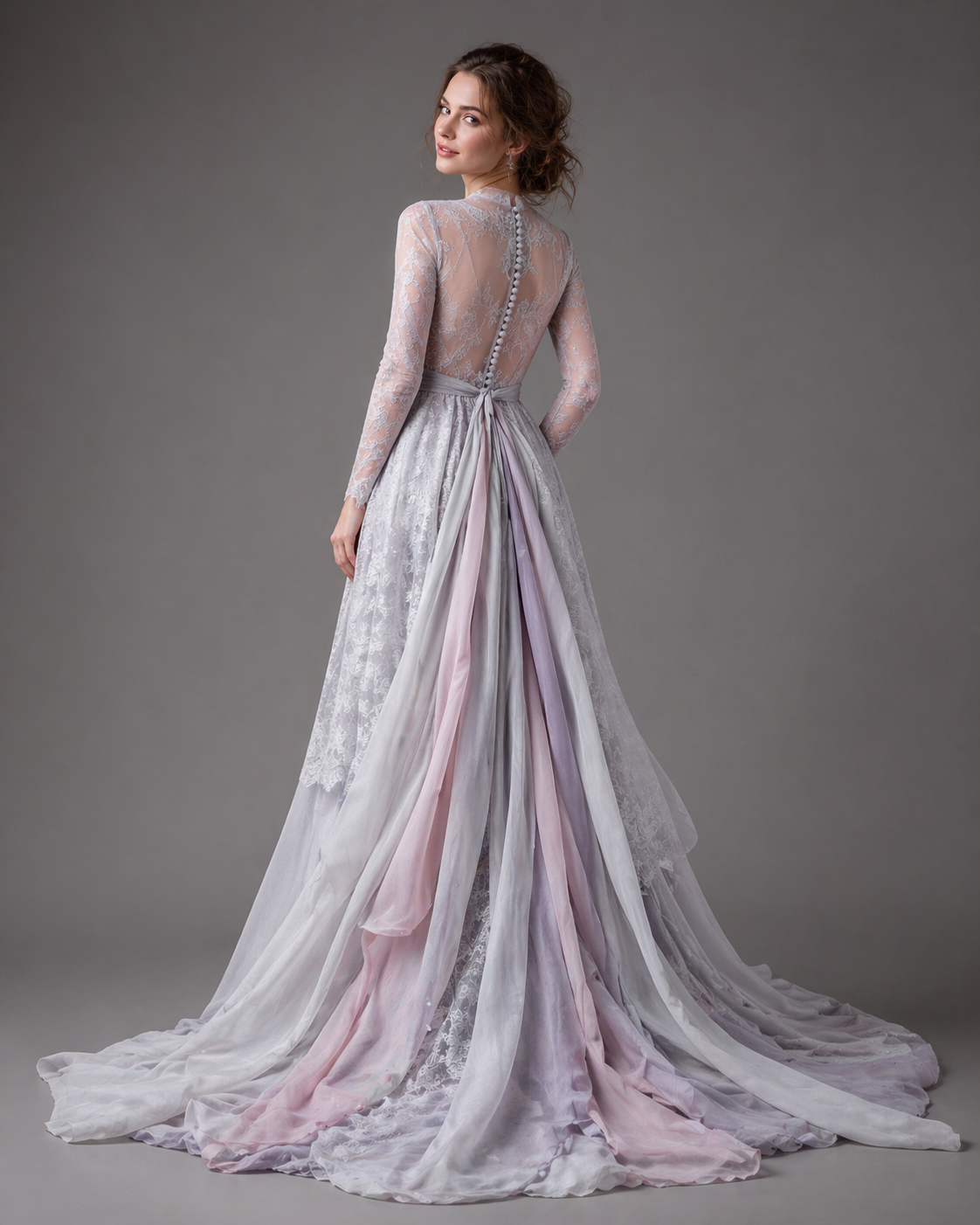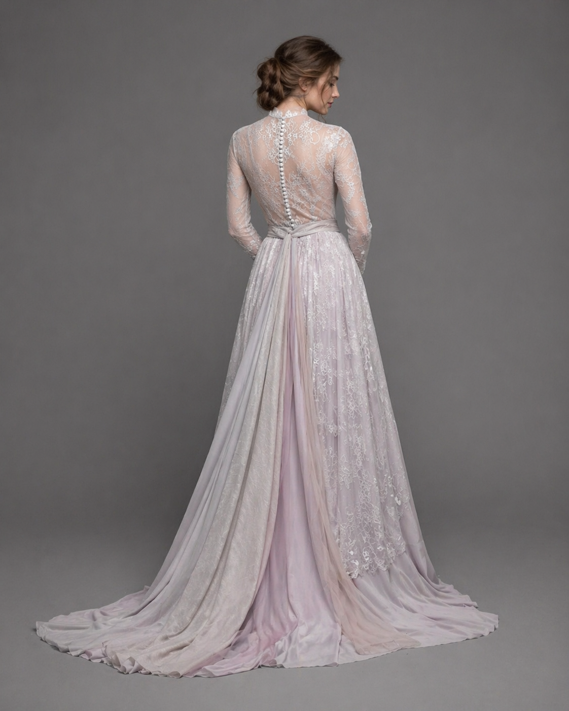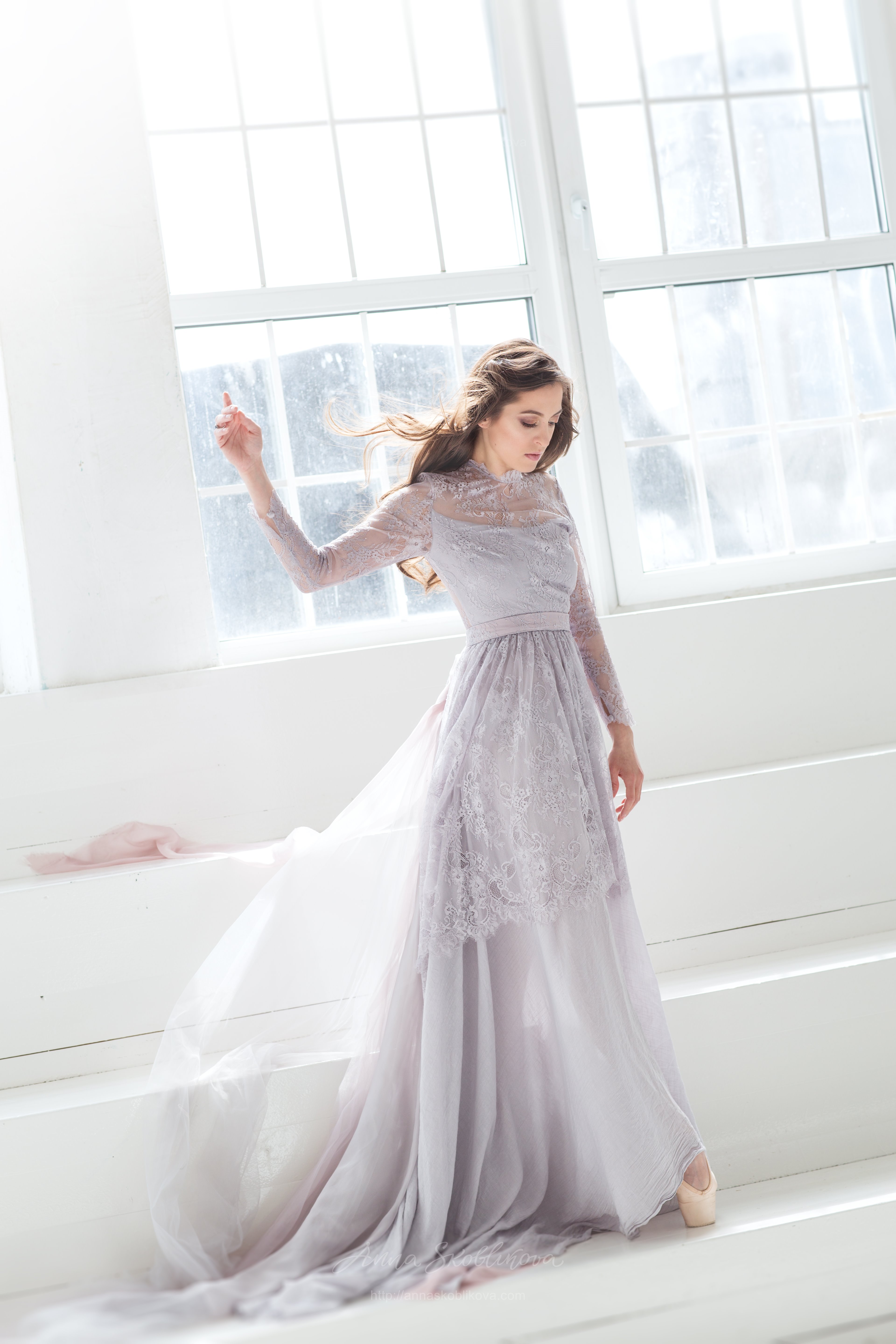 Свадебное платье в классическом стиле, приглушенного серо-сиреневого цвета. Платье выполнено из кружева Шантильи и хлопка. Лиф платья с воротником-стойкой, длинным рукавом, спинка с роскошными пуговками из натурального шелка по всей длине спины. Юбка платья двухъярусная из кружева с переходом в шлейф и из хлопка.