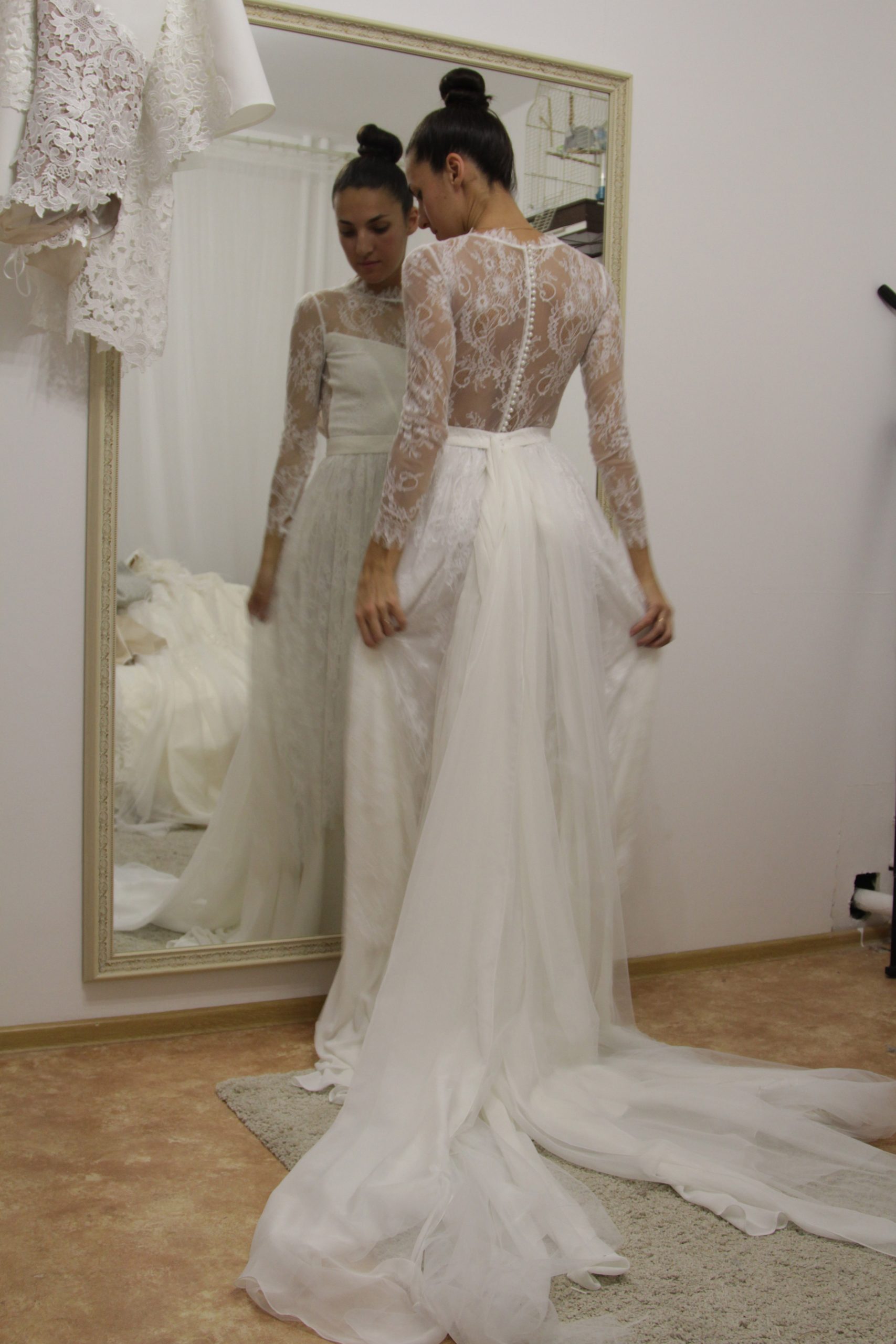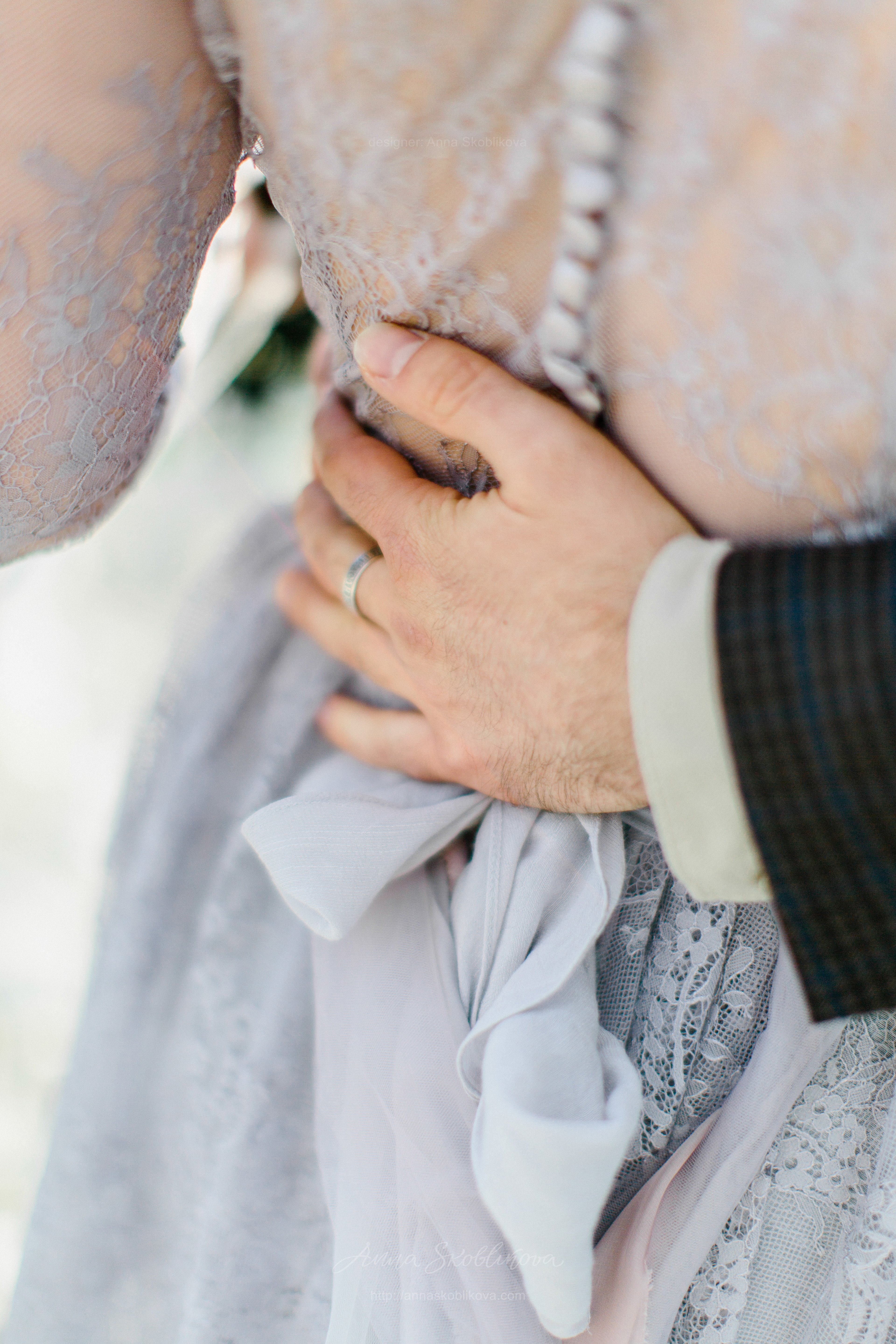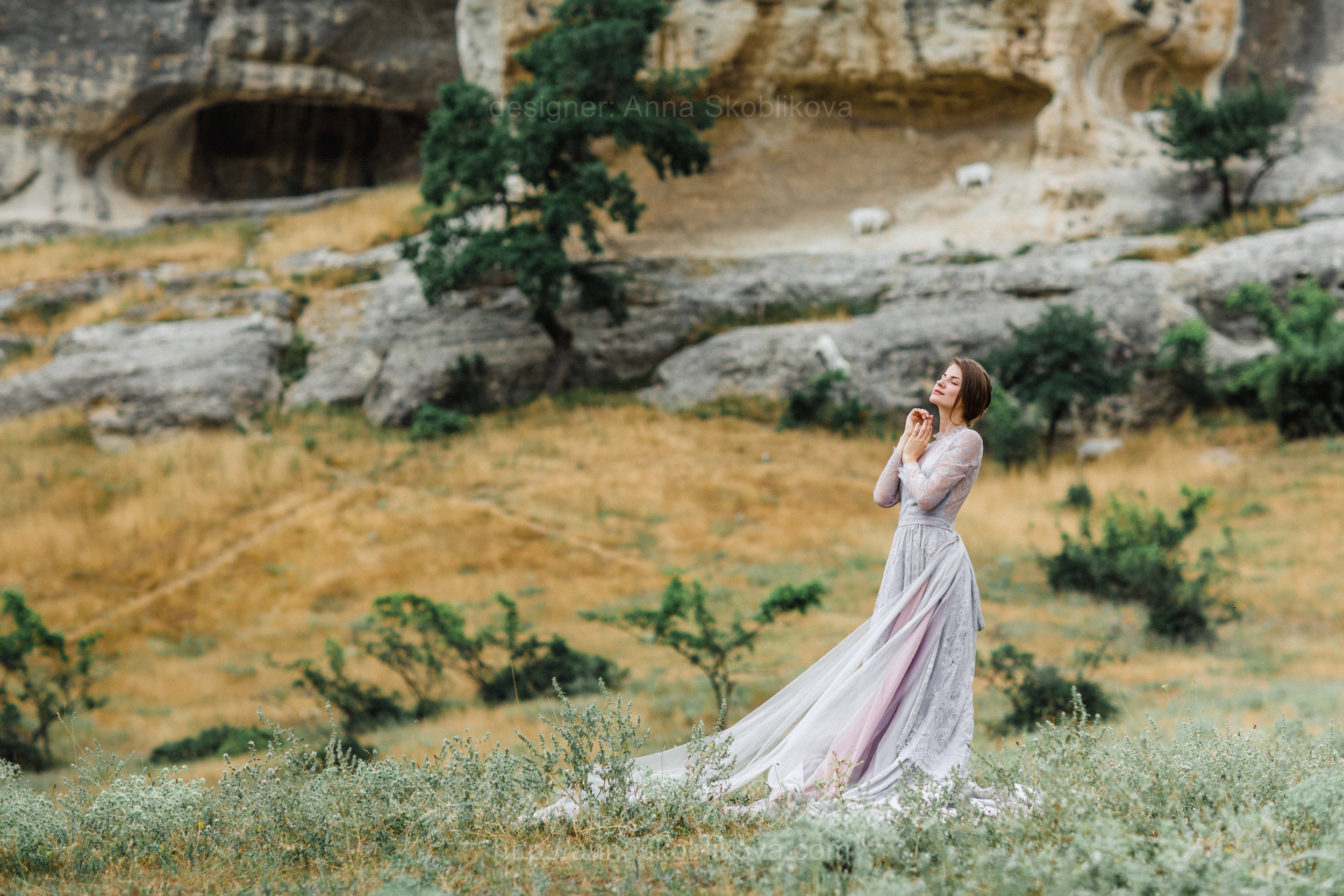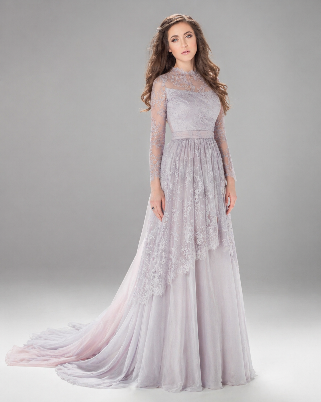 Свадебное платье в классическом стиле, приглушенного серо-сиреневого цвета. Платье выполнено из кружева Шантильи и хлопка. Лиф платья с воротником-стойкой, длинным рукавом, спинка с роскошными пуговками из натурального шелка по всей длине спины. Юбка платья двухъярусная из кружева с переходом в шлейф и из хлопка.