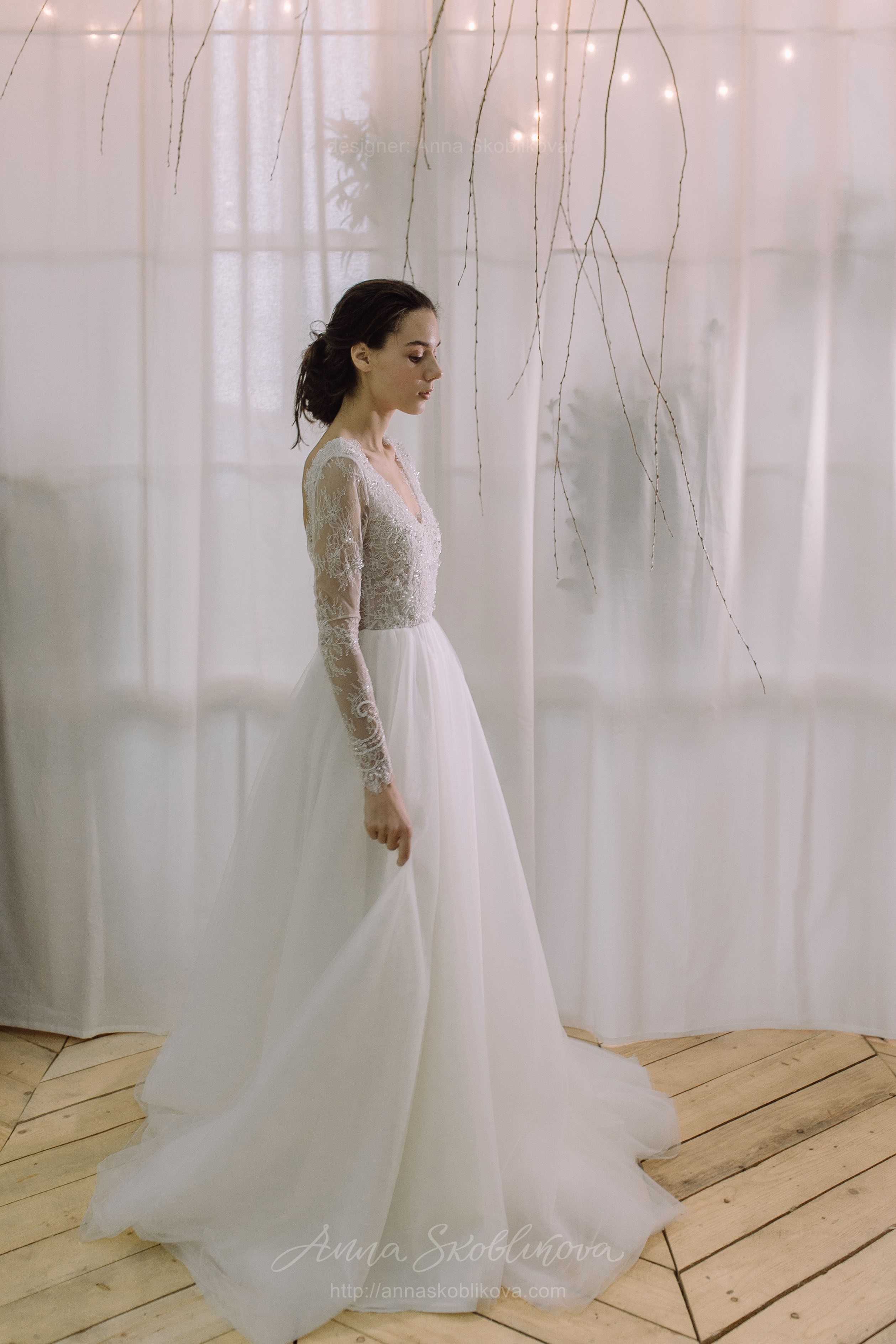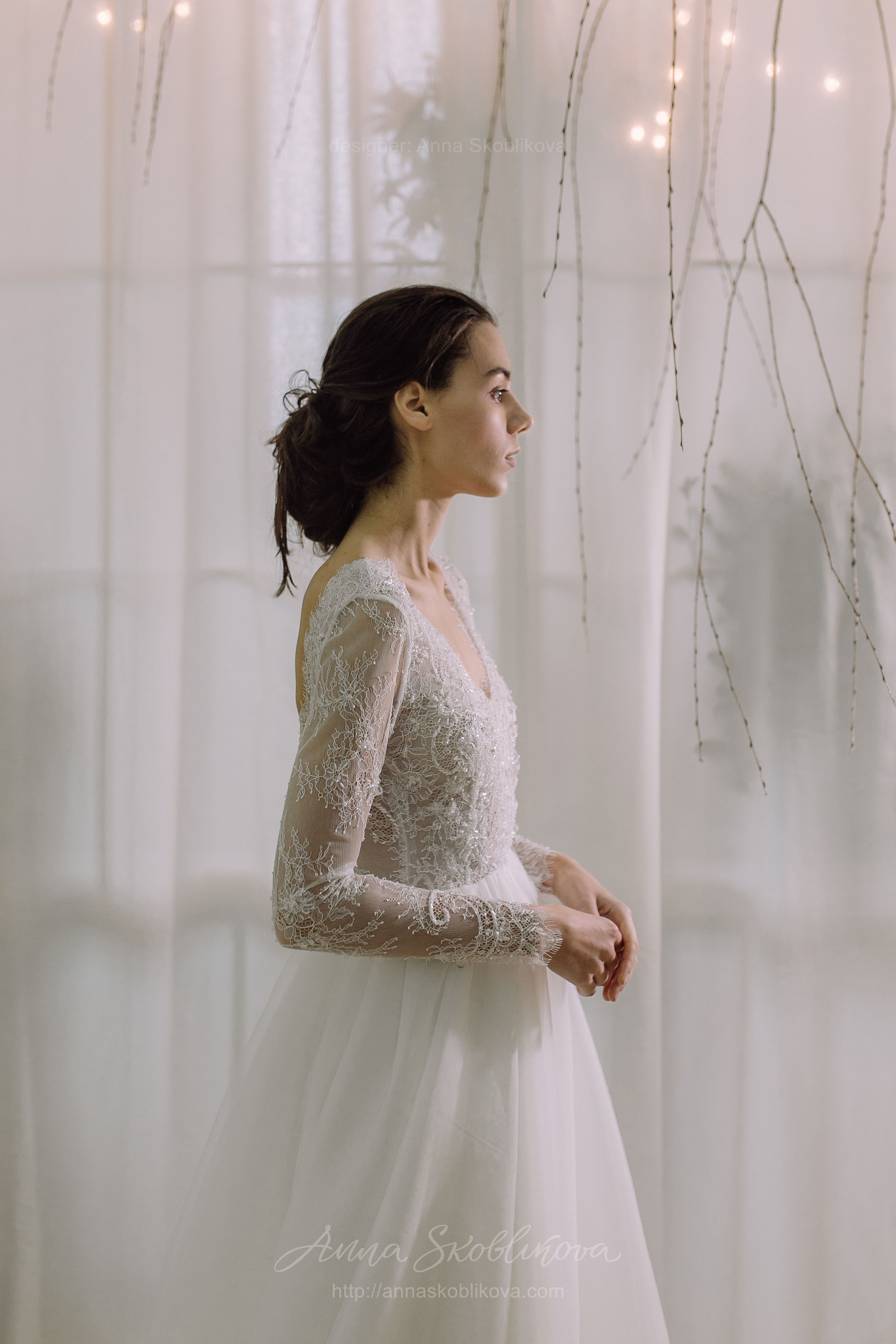 Свадебное платье выполнено из кружева Шантильи и фатина.
