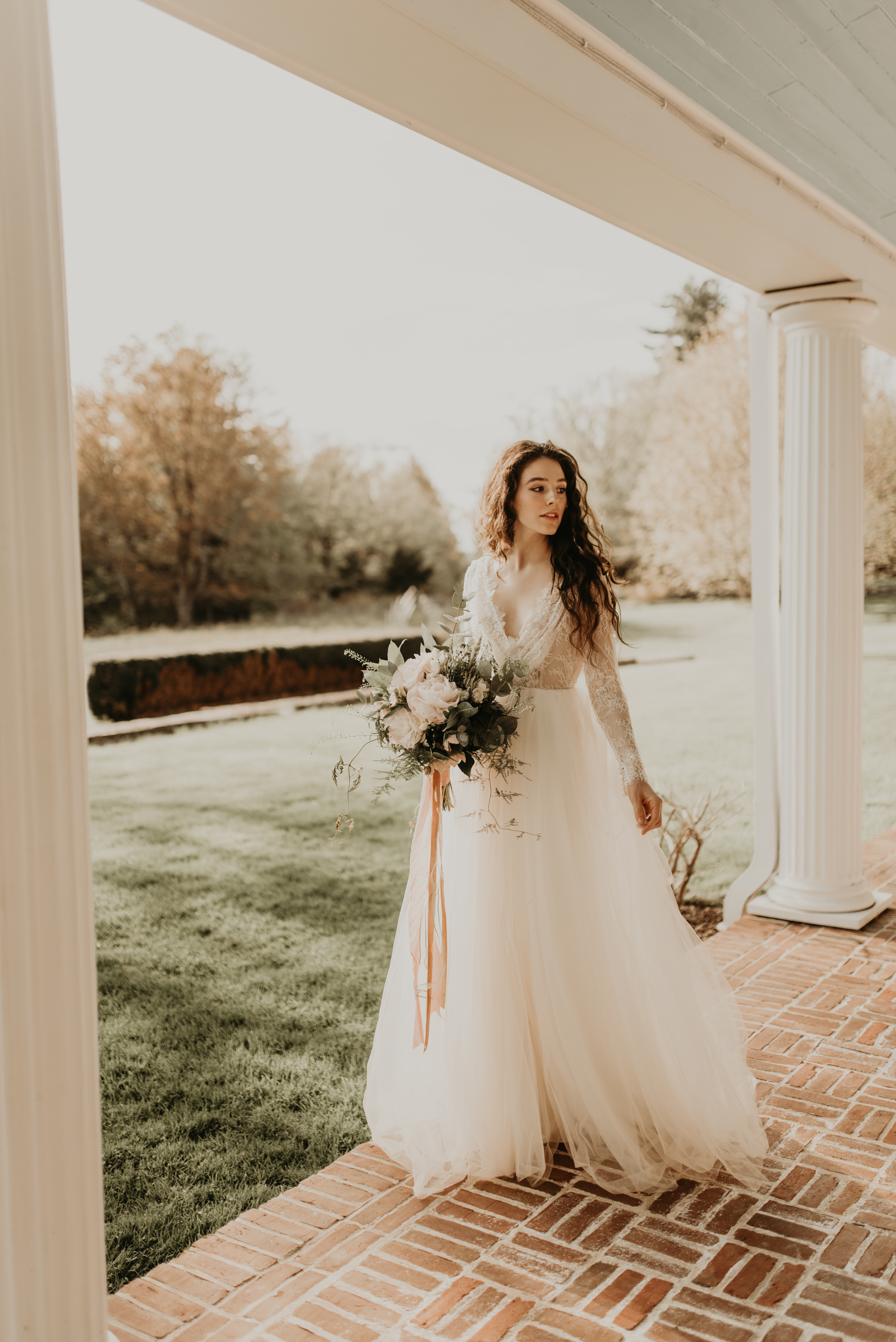 Свадебное платье классического типа с кружевным лифом и юбкой из тюля подойдет как для сдержанной церемонии так и для вечеринки на природе.