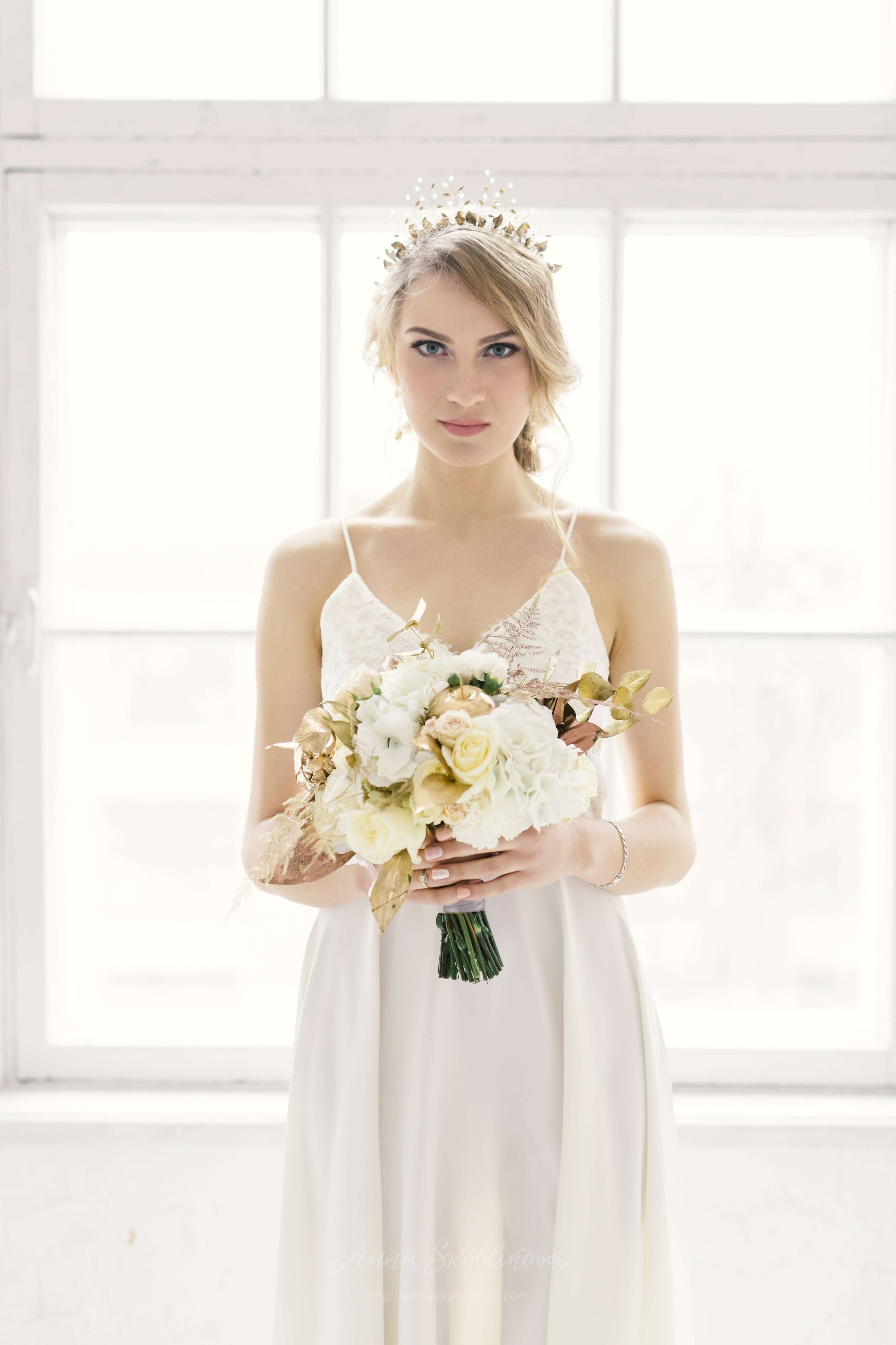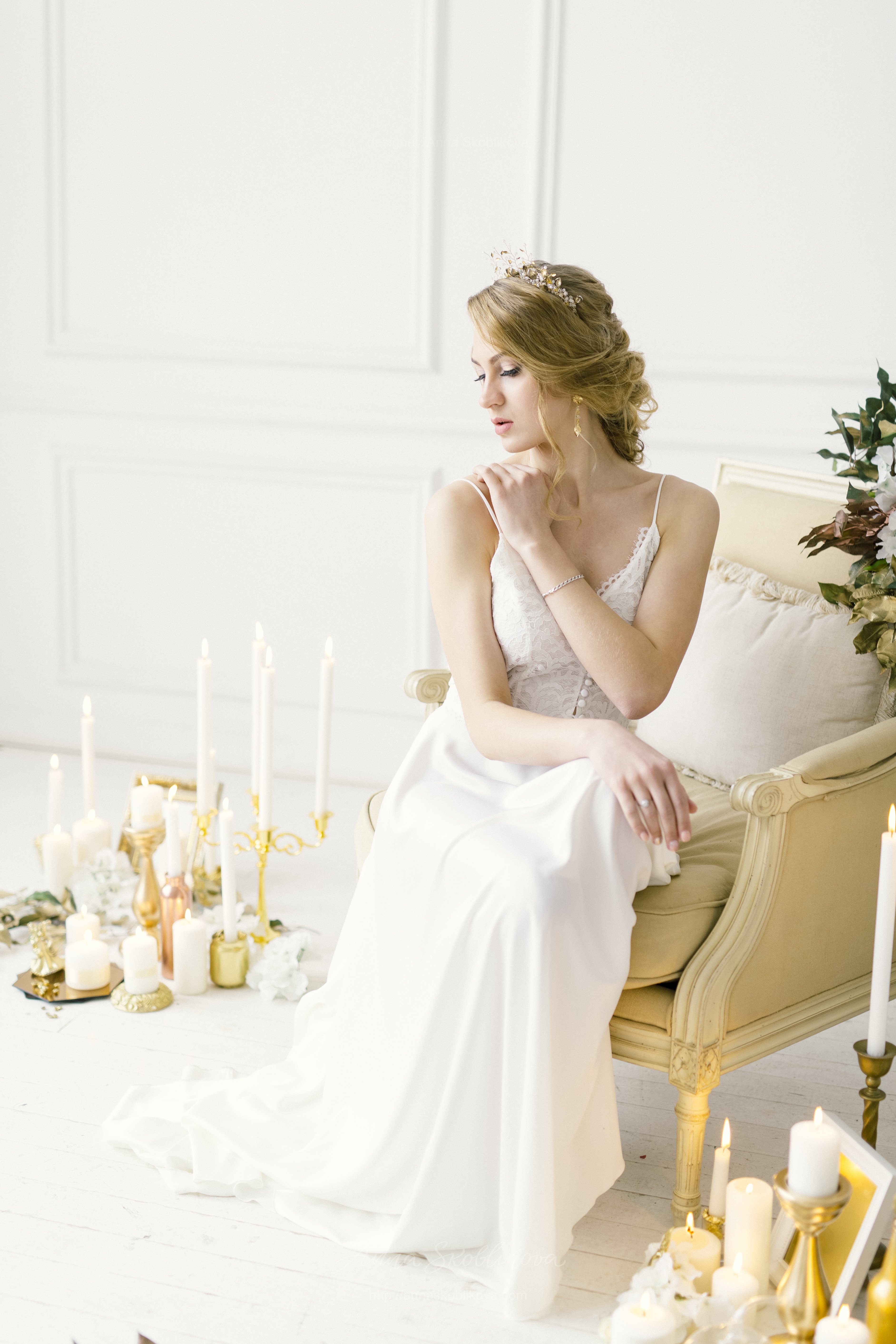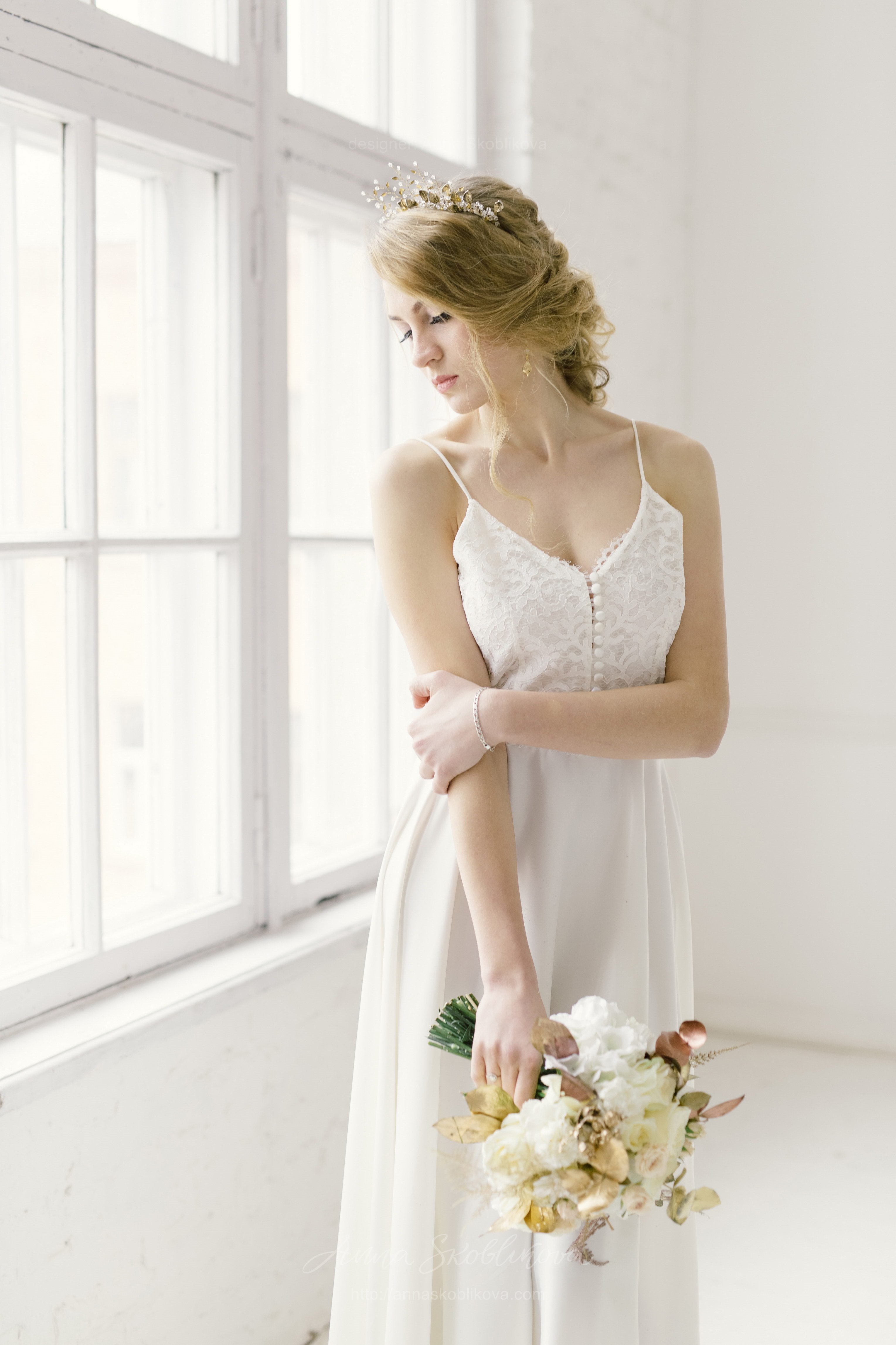 Нежное и женственное свадебное платье на тонких бретелях подчеркивает красивые плечи и спину обладательницы. Платье имеет глубокий вырез на спине и небольшой вырез спереди. Лиф этого платья выполнен из сатина и французского натурального кружева. Юбка из сатина скроена по-косой и имеет небольшой шлейф. Платье спереди на пуговицах обтянутых шелком.