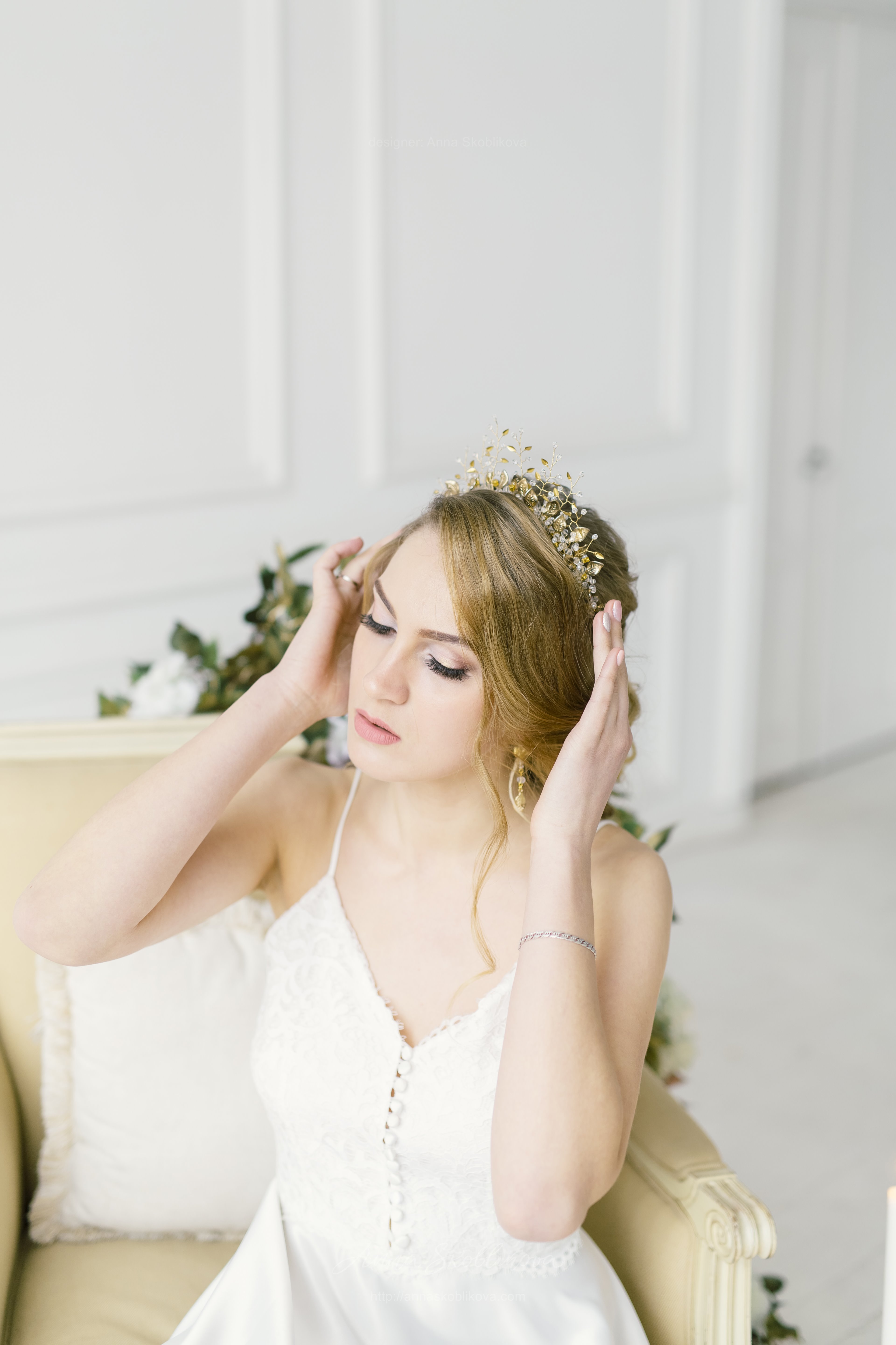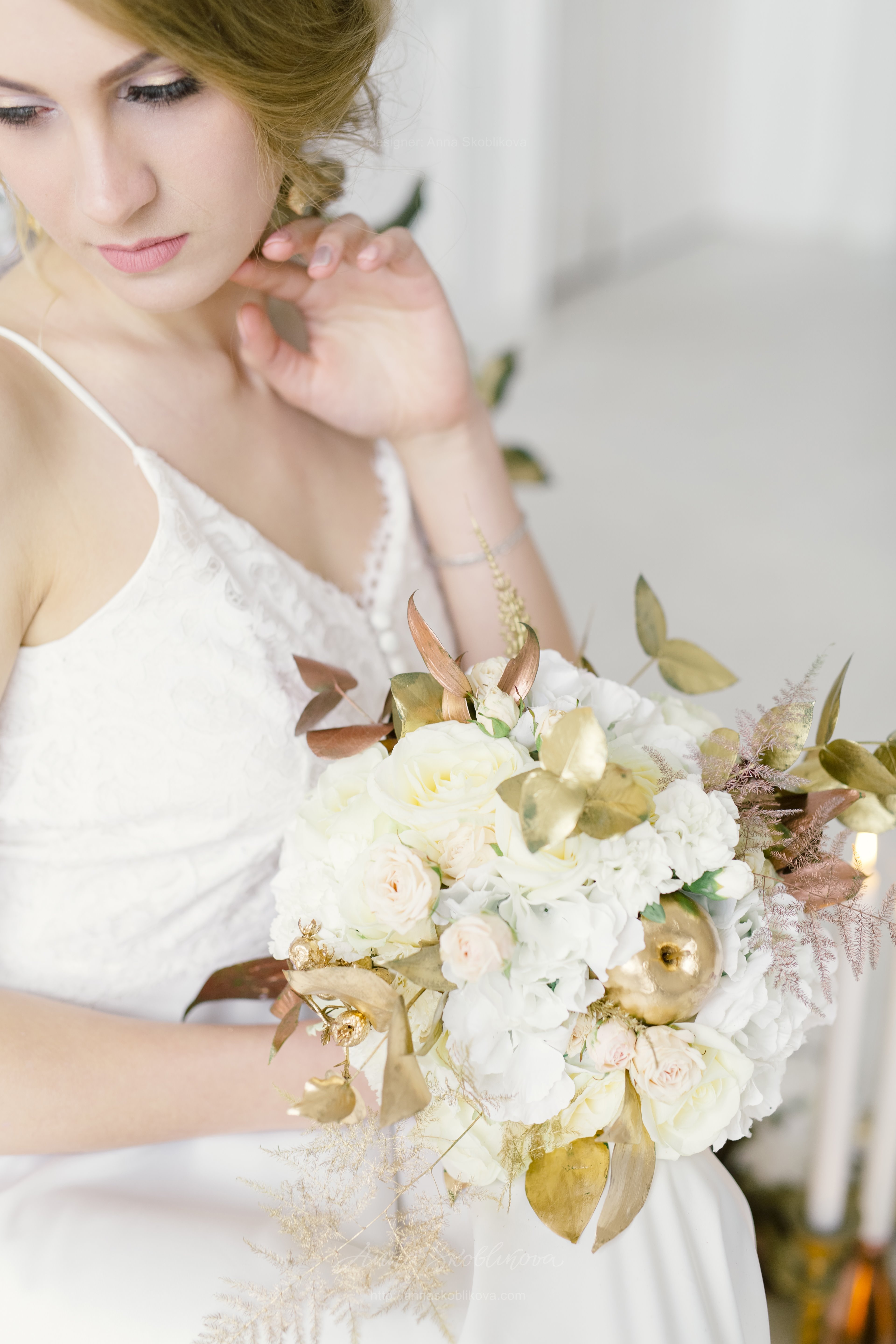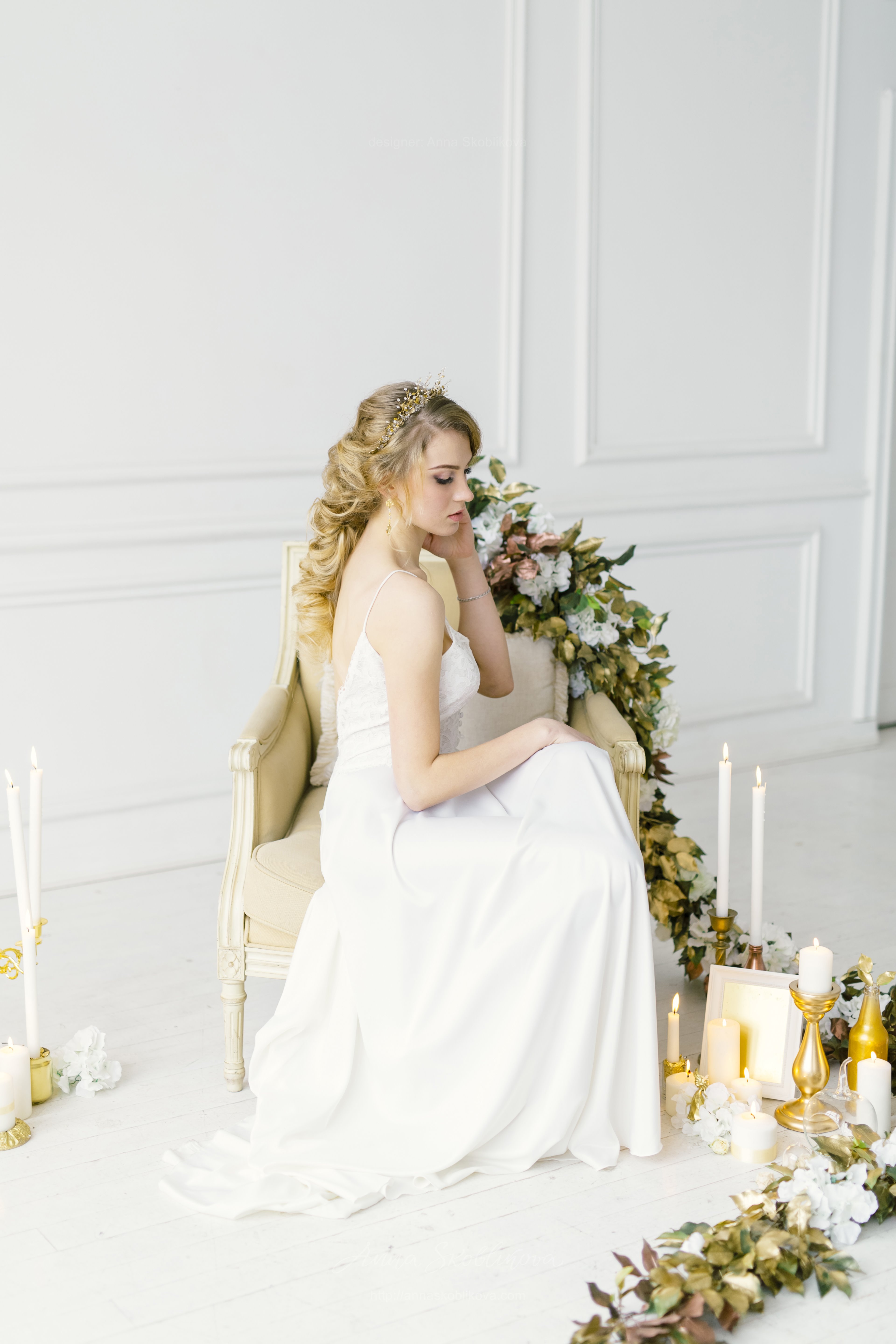 Нежное и женственное свадебное платье на тонких бретелях подчеркивает красивые плечи и спину обладательницы. Платье имеет глубокий вырез на спине и небольшой вырез спереди. Лиф этого платья выполнен из сатина и французского натурального кружева. Юбка из сатина скроена по-косой и имеет небольшой шлейф. Платье спереди на пуговицах обтянутых шелком.