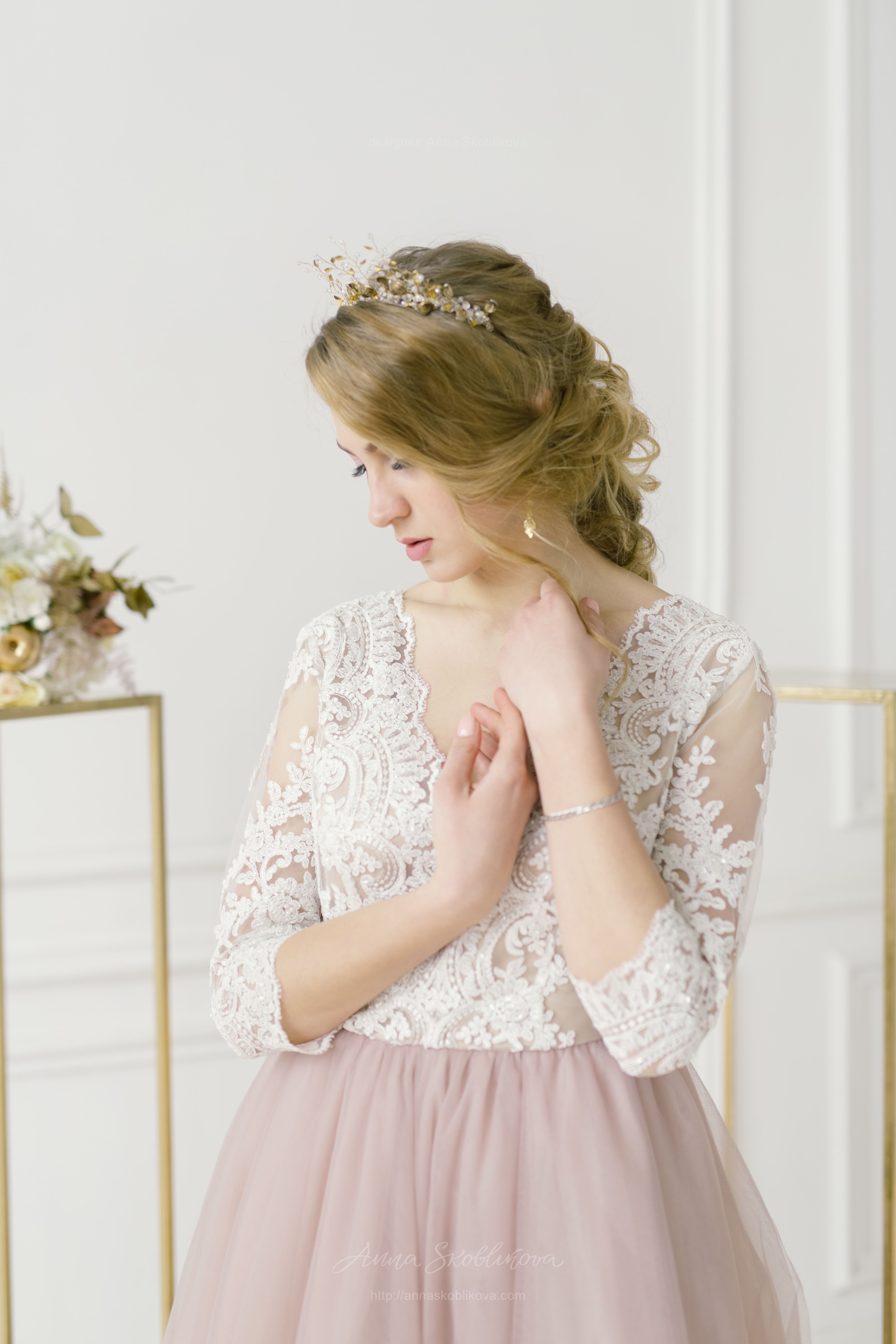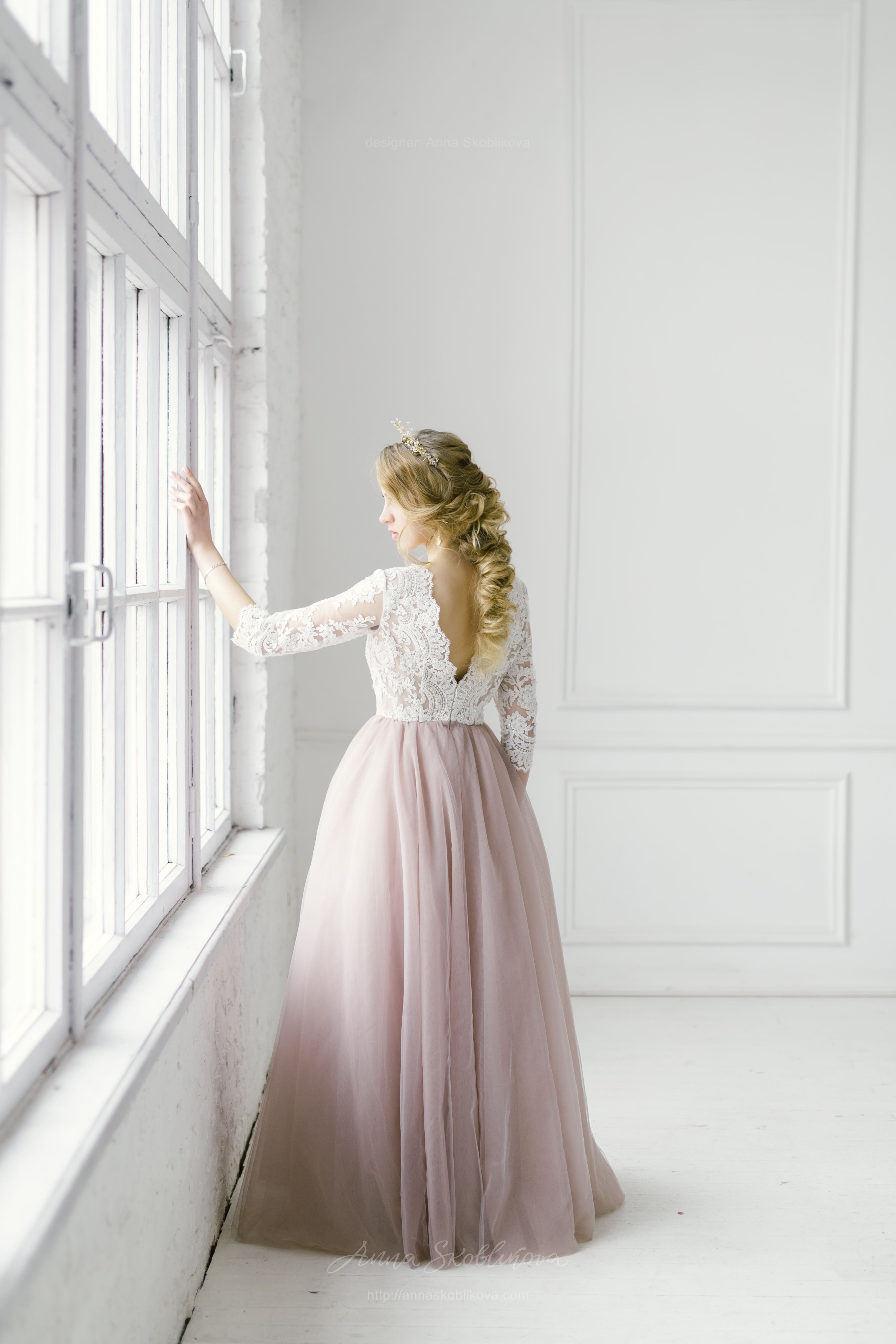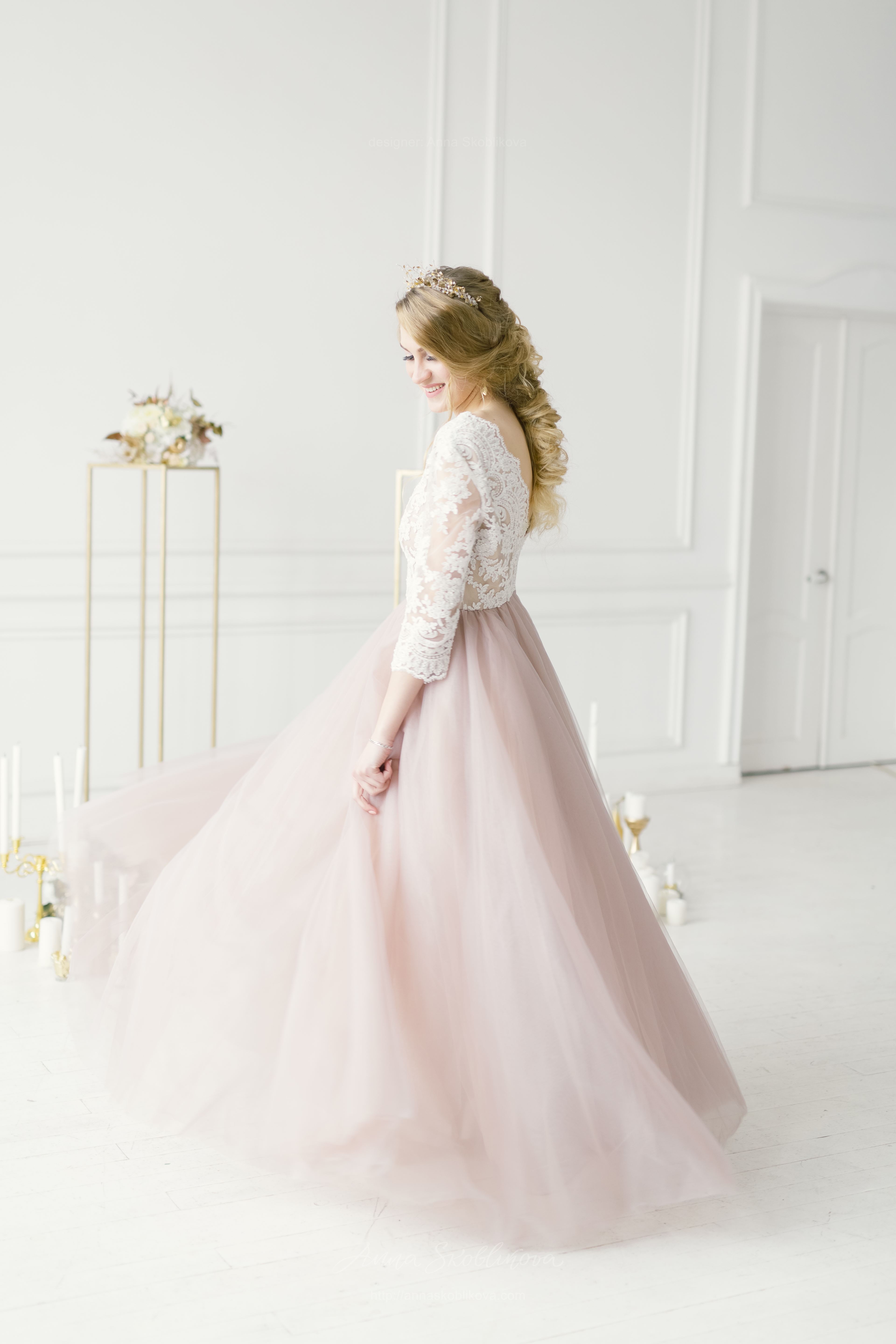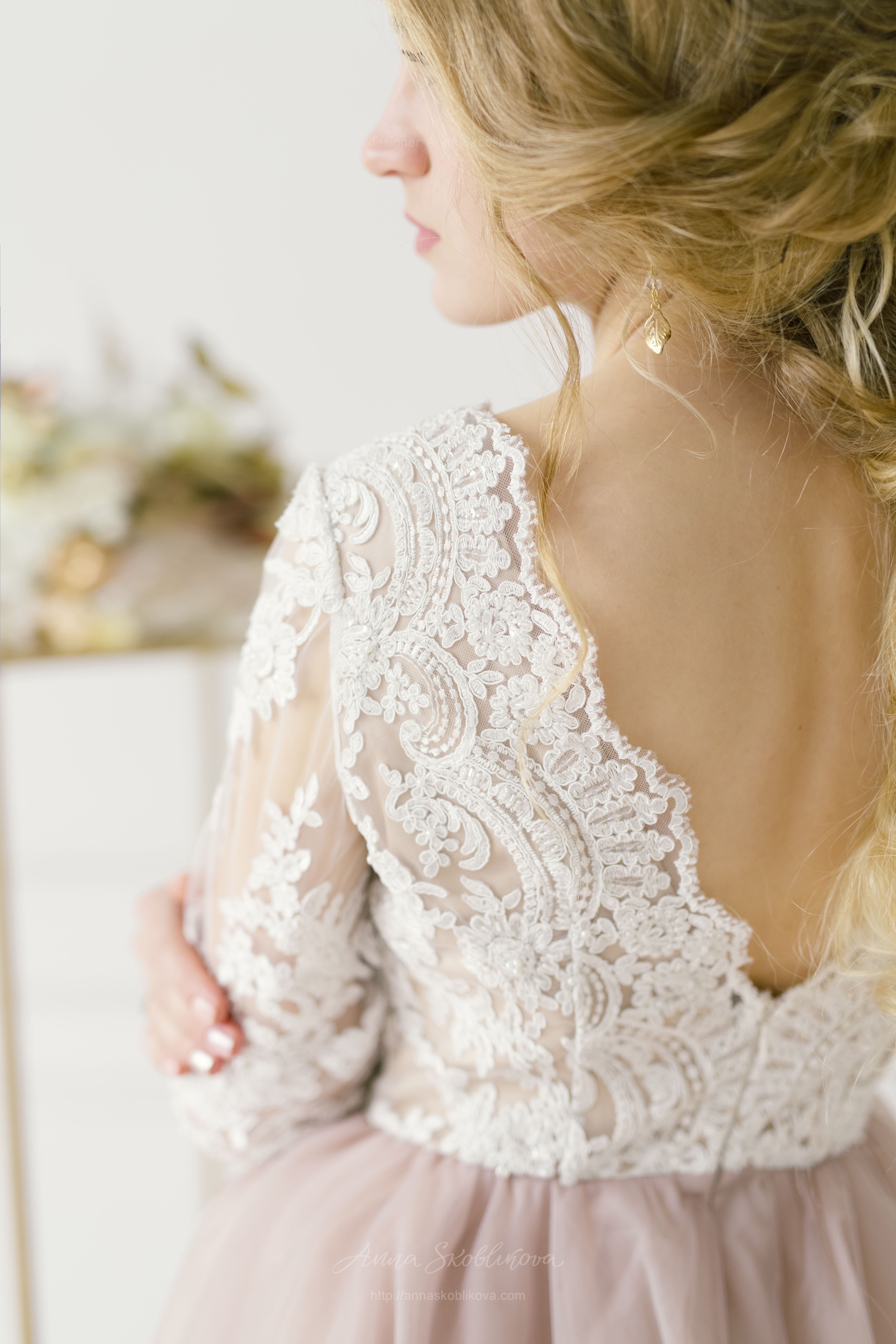 Платье с роскошной юбкой темно-пудрового цвета и расшитым кружевным лифом. Цвет юбки сложный, красивый, за счет сочетания в юбке нескольких оттенков фатина от пудрового до кофейного цвета. Лиф платья скроен по косой по краям с фестоном. Платье имеет в образный вырез спереди и сзади. И рукав 34