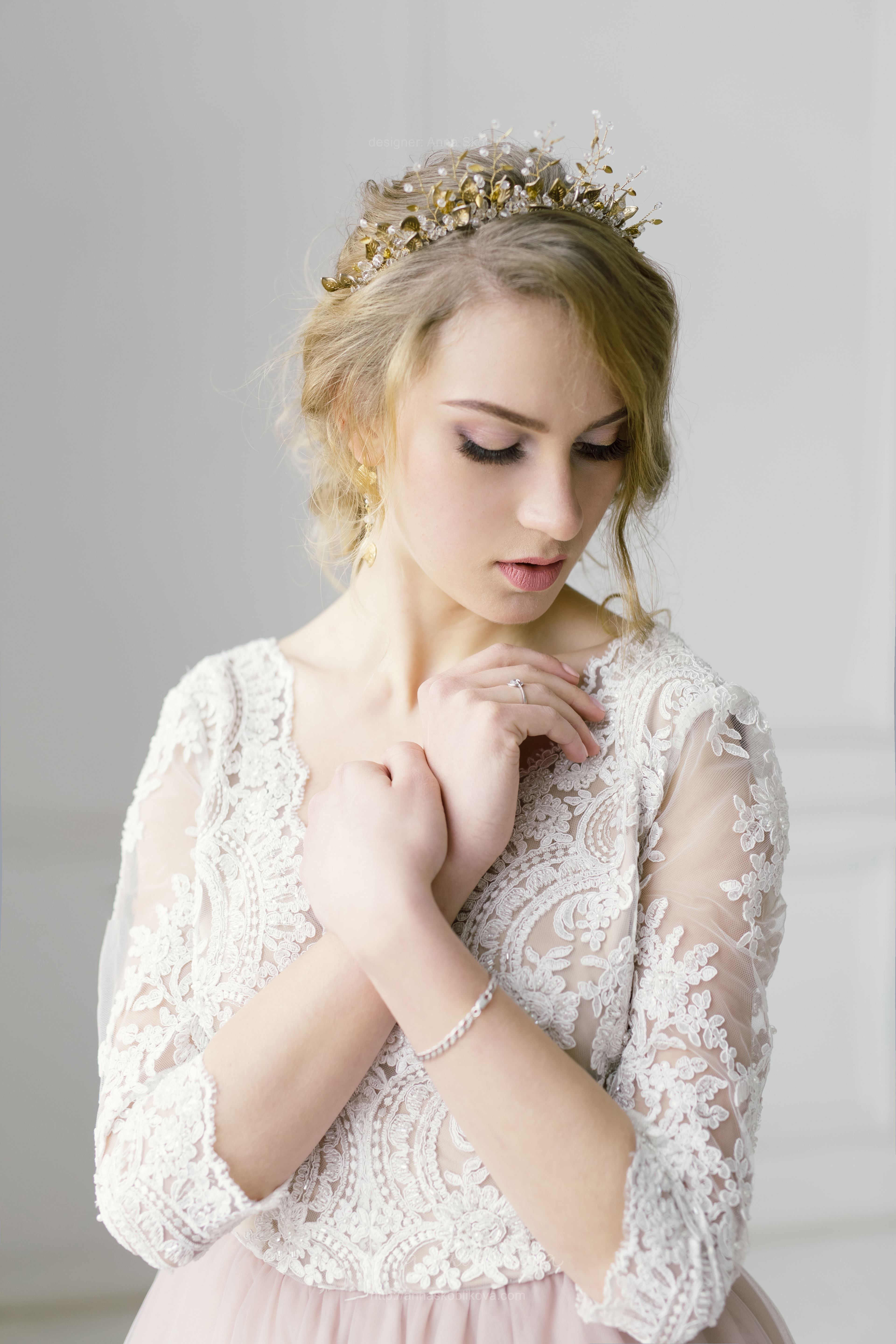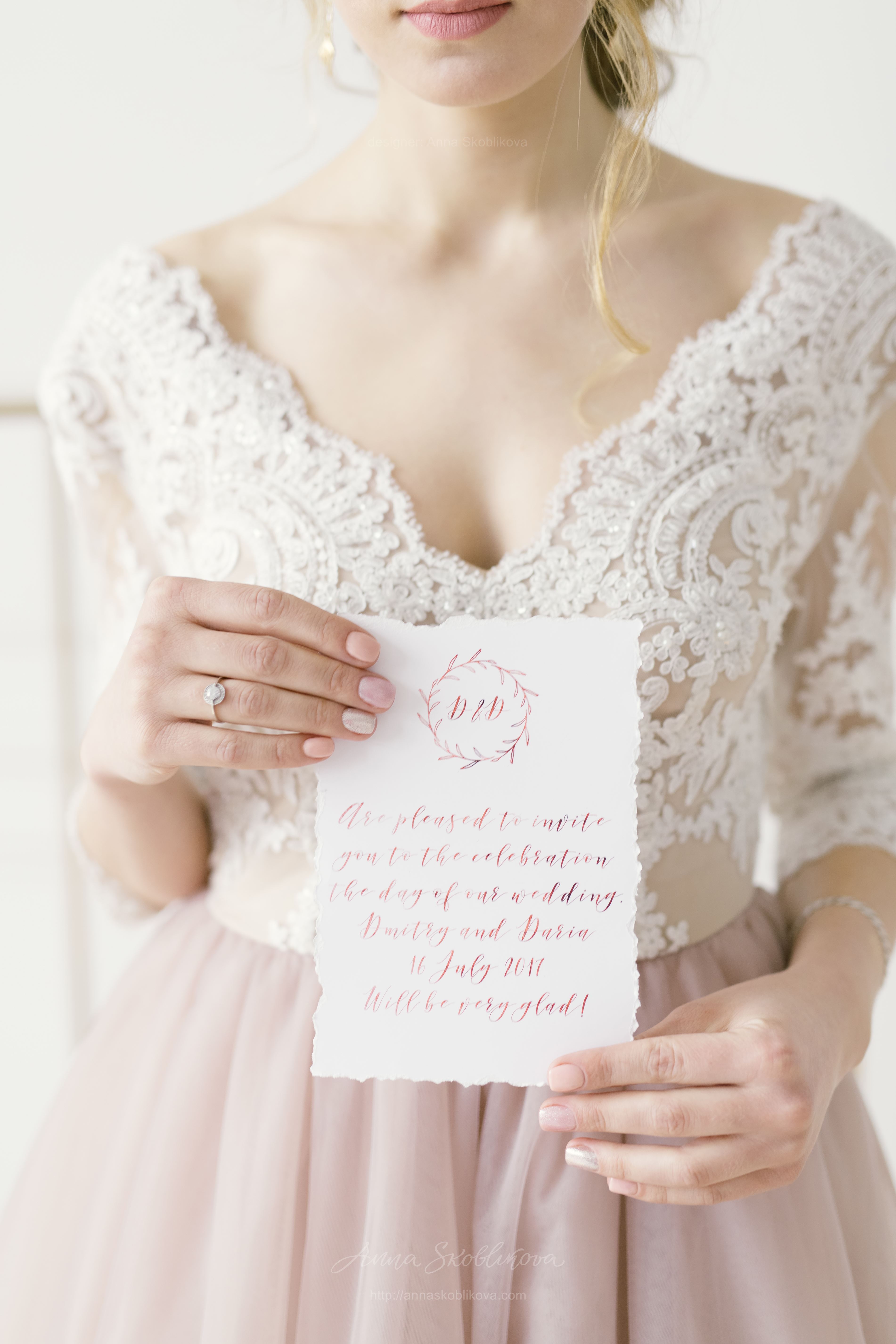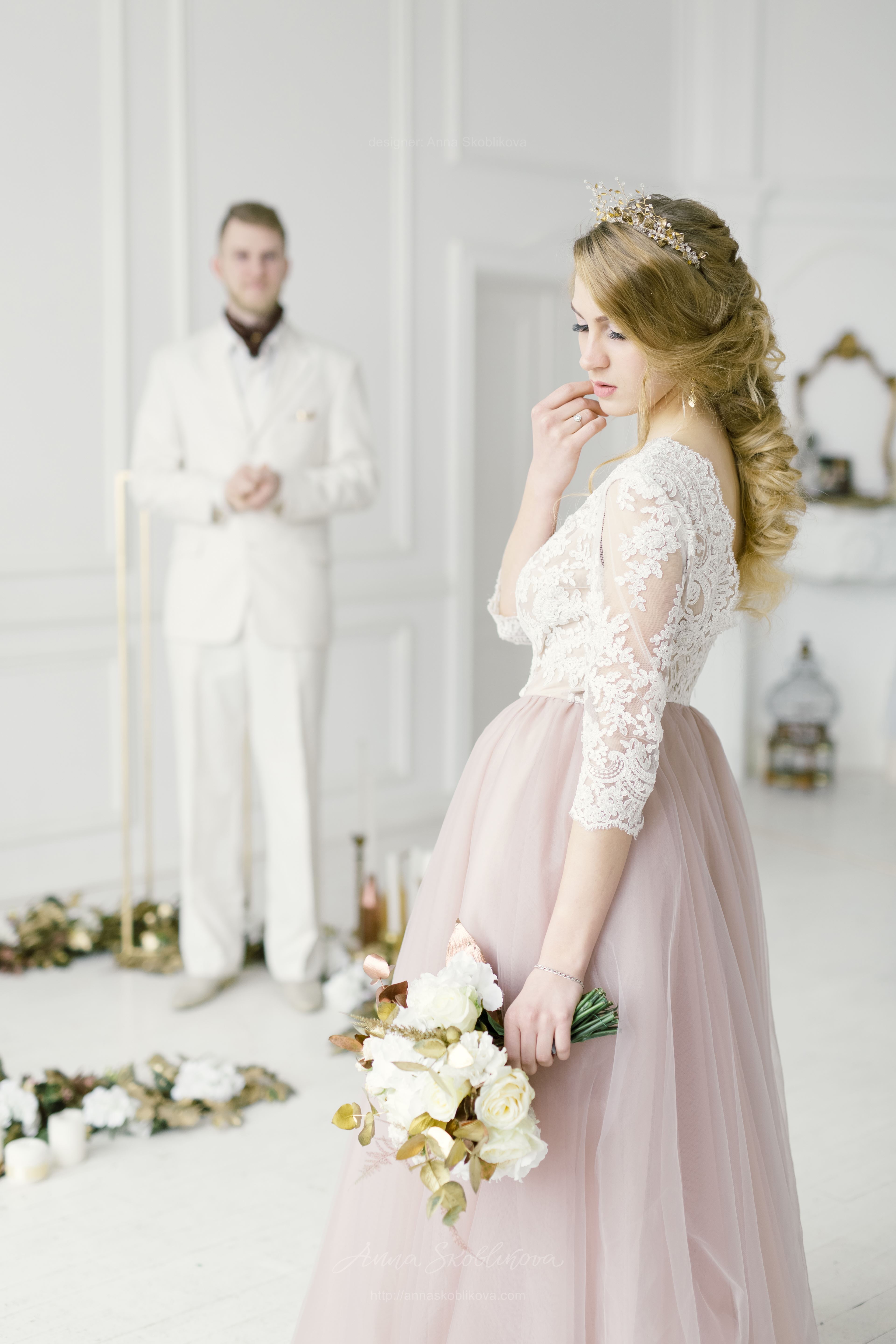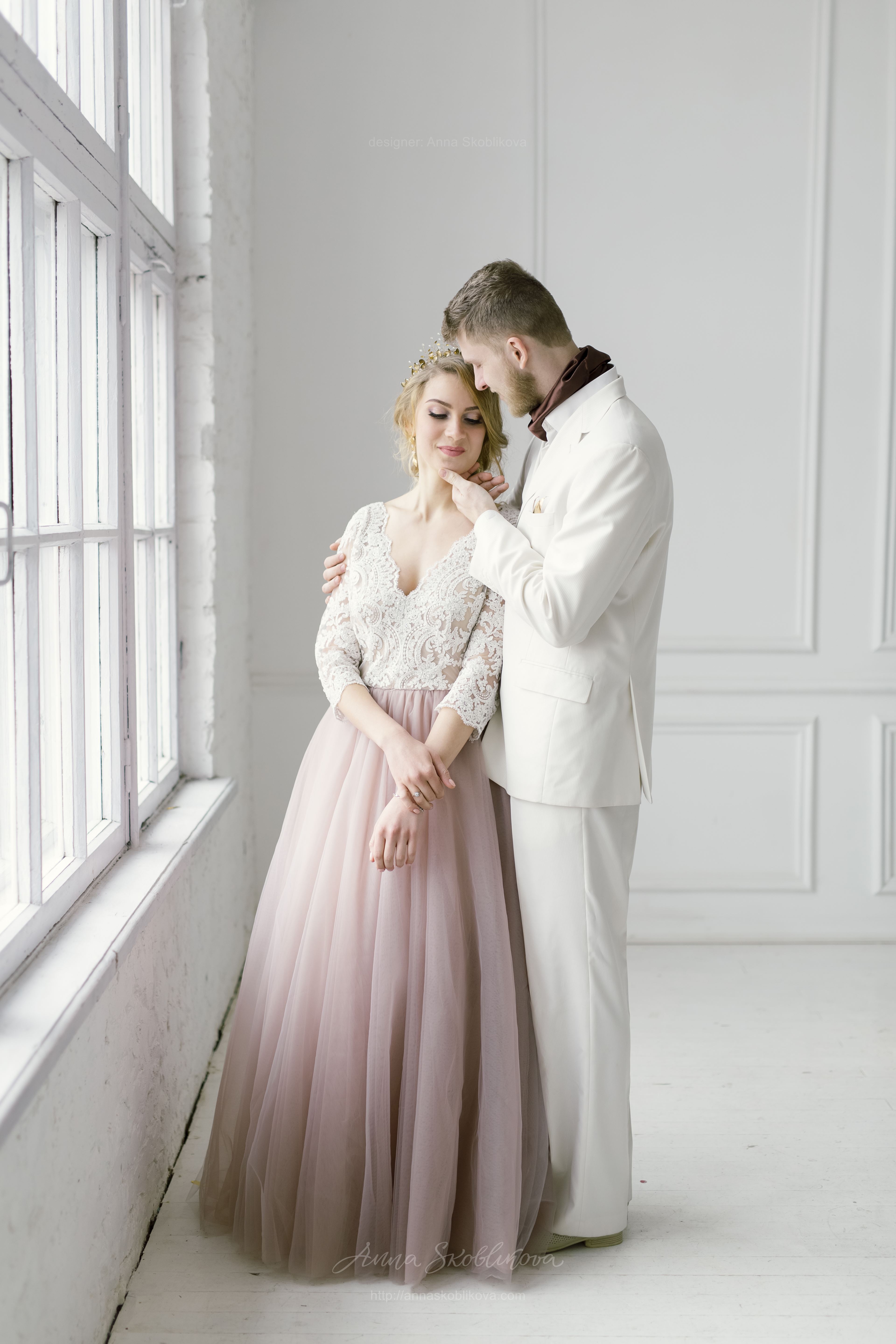 Платье с роскошной юбкой темно-пудрового цвета и расшитым кружевным лифом. Цвет юбки сложный, красивый, за счет сочетания в юбке нескольких оттенков фатина от пудрового до кофейного цвета. Лиф платья скроен по косой по краям с фестоном. Платье имеет в образный вырез спереди и сзади. И рукав 34