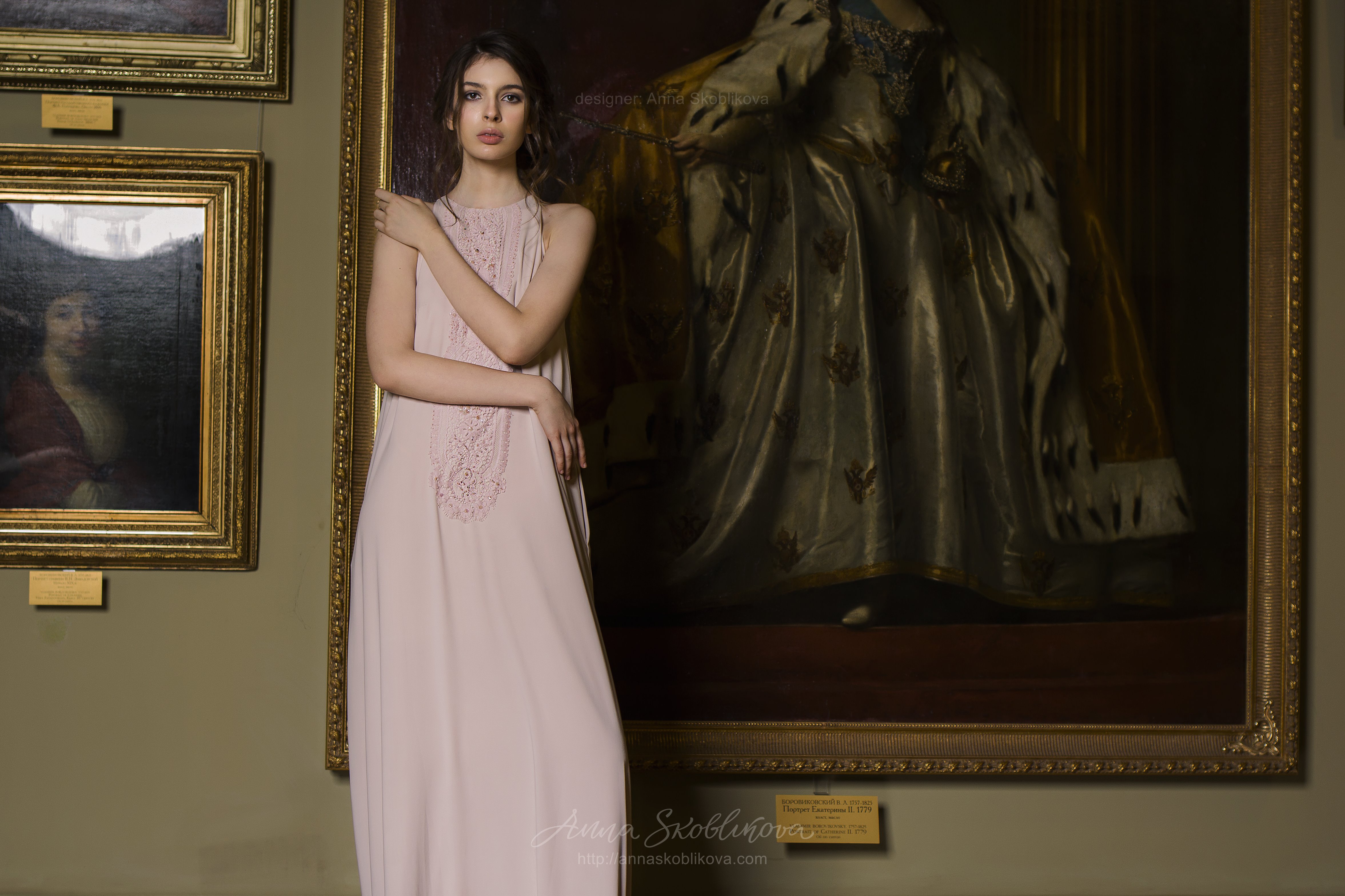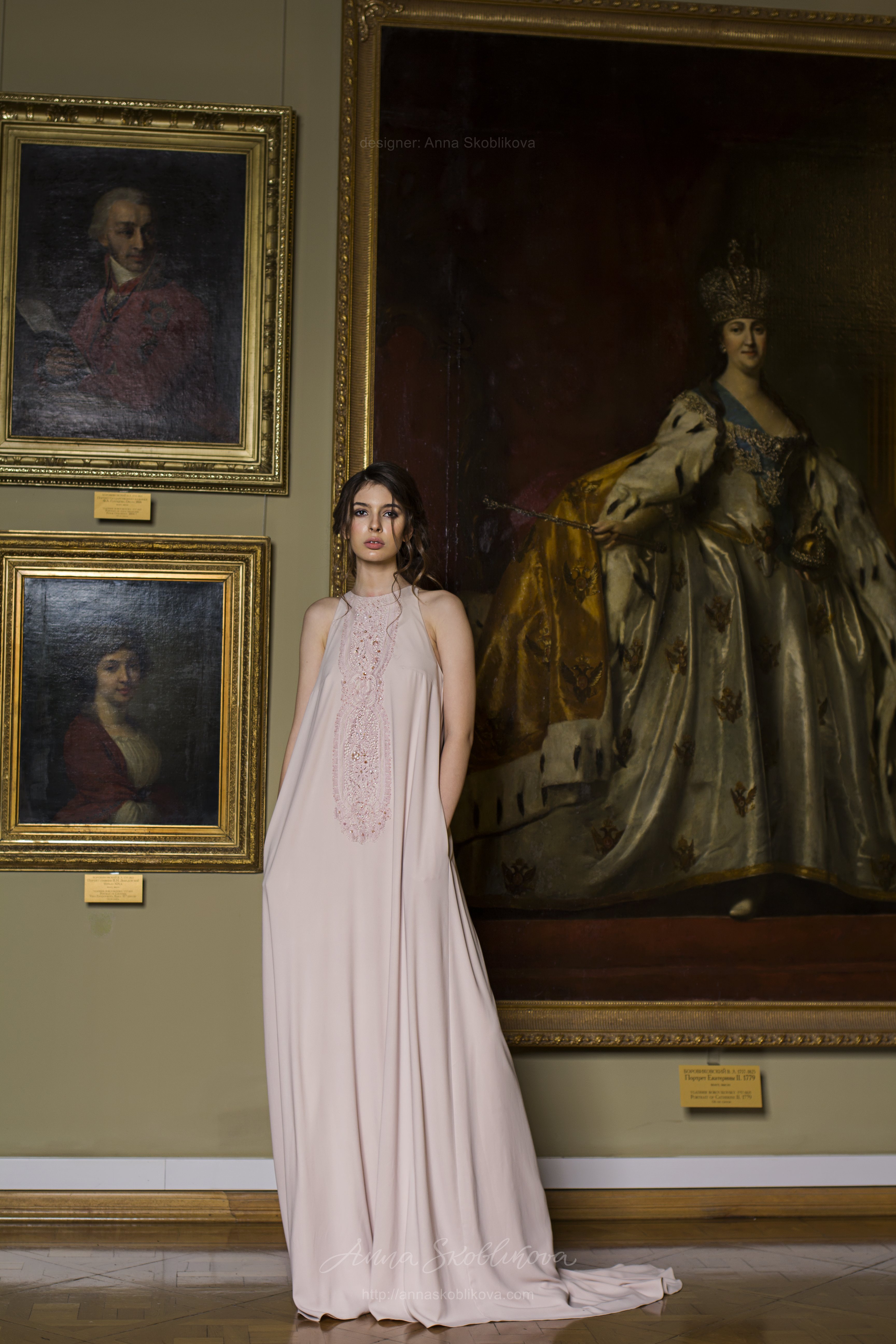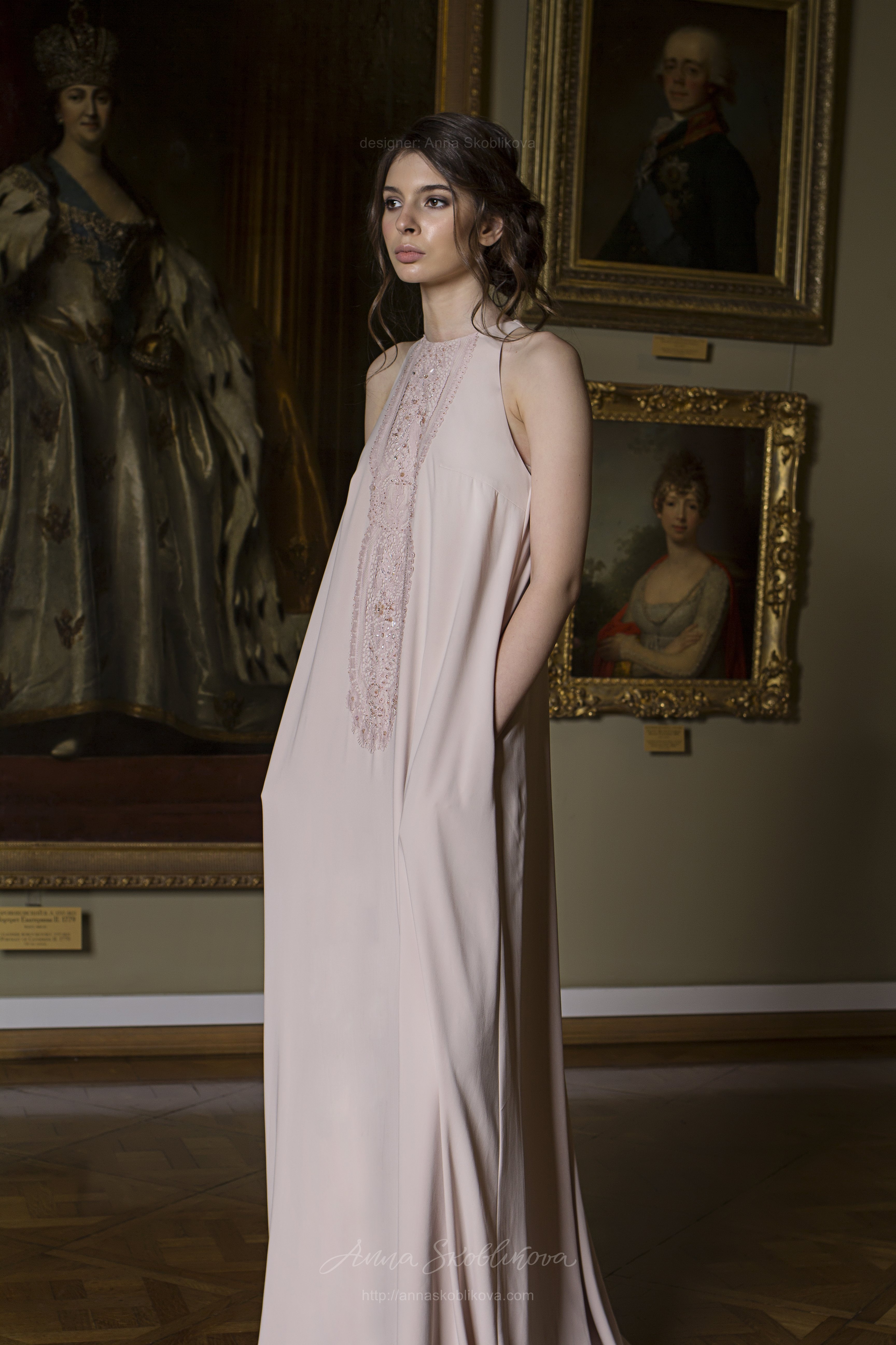Лаконичное свадебное платье пудрово-розового цвета, трапецевидного кроя. Платье декорировано и расшито вручную овальным элементом французского кружева. Несмотря на простоту кроя, платье имеет красивый круглый шлейф. Свадебный наряд красиво фалдит под тяжестью креповой ткани из которой оно создано. Свадебное платье не подчеркивает талию, но при этом выглядит женственно и романтично. Горловина платья круглая и облегает шею, американская пройма (halter) оголяет плечевую зону и руки, делая визуально верхнюю часть платья не «тяжелой». Плечи кокетливо открыты, создается образ невинности и романтичности. Главный акцент платья – вертикальная вышивка бисером и кристаллами.
