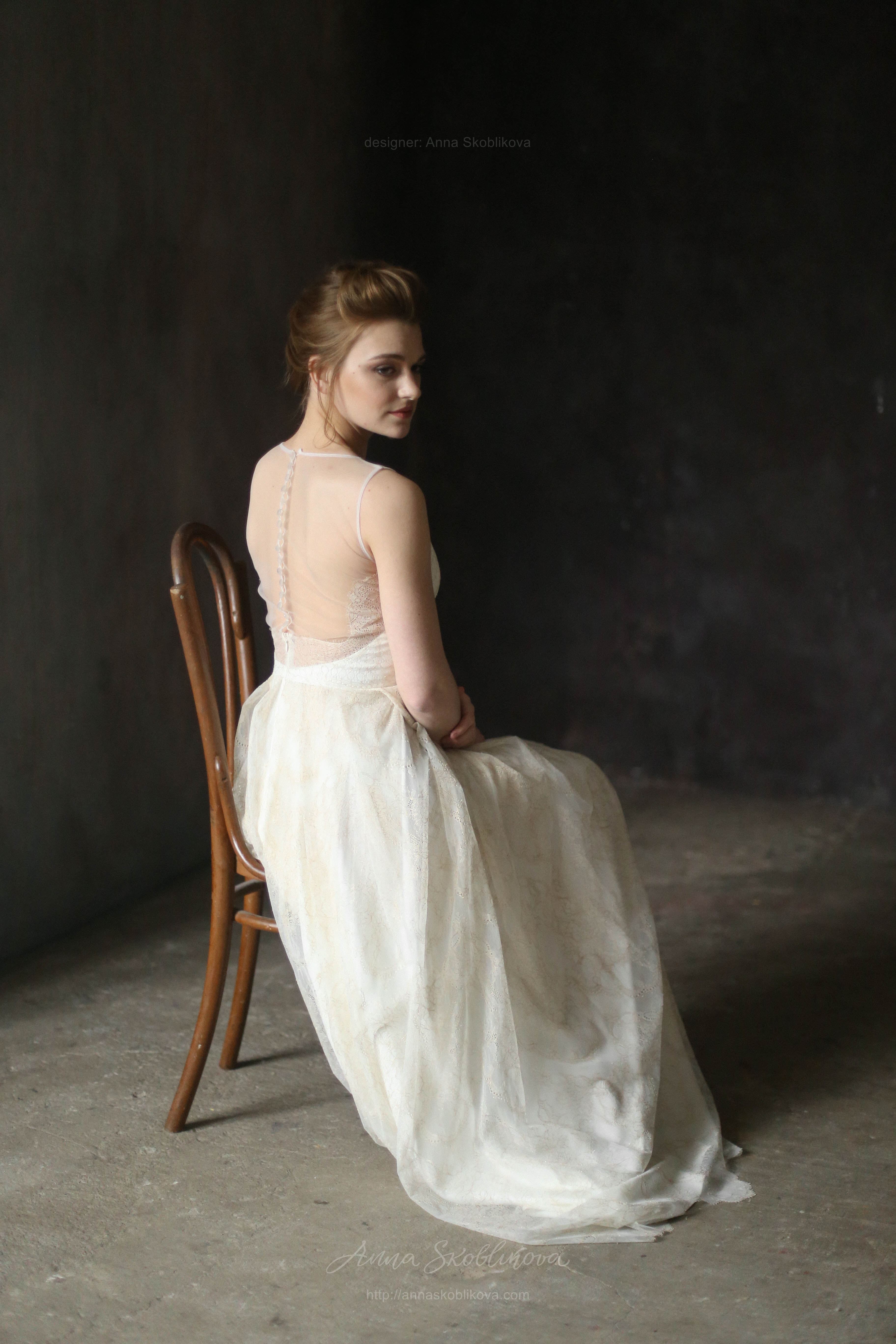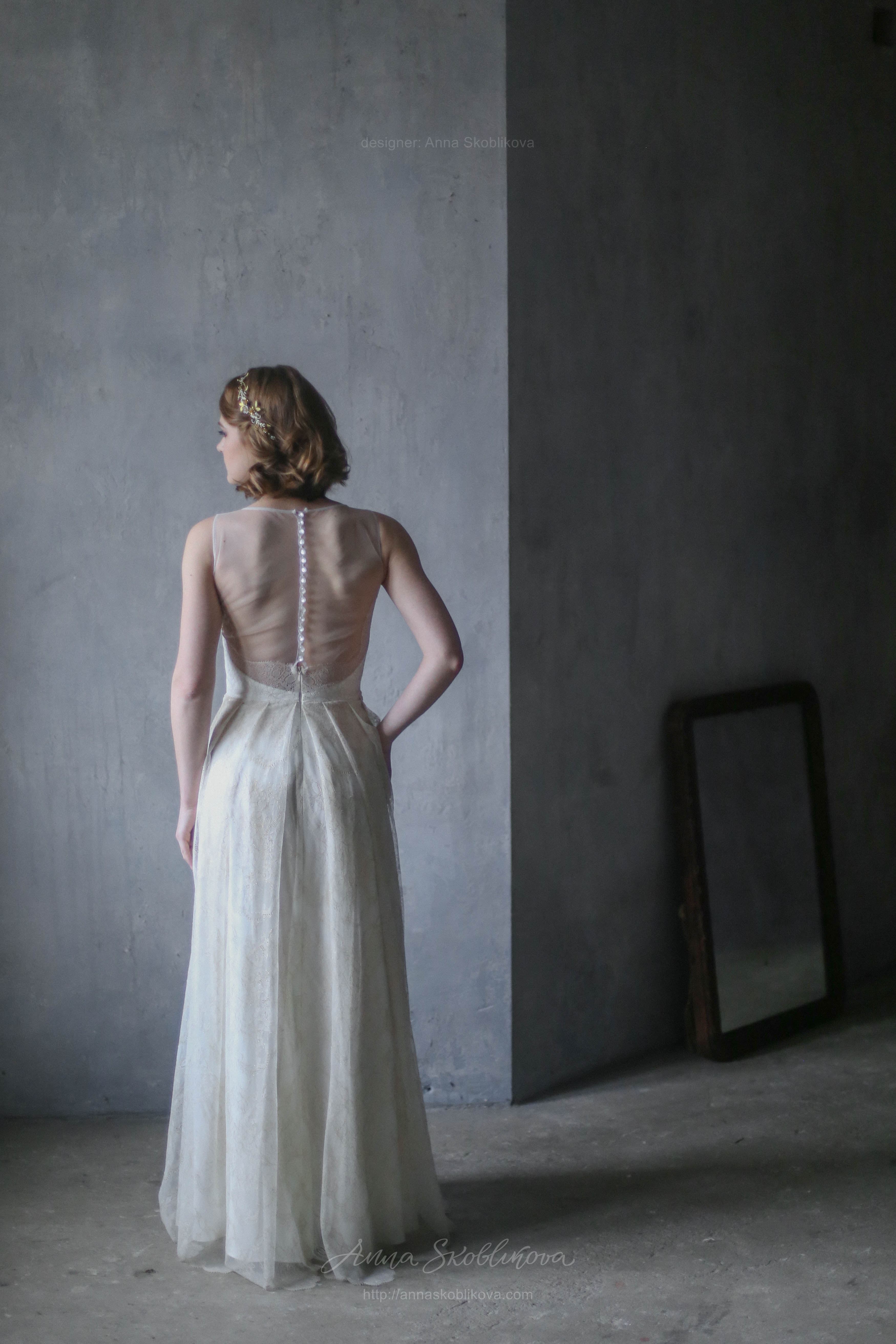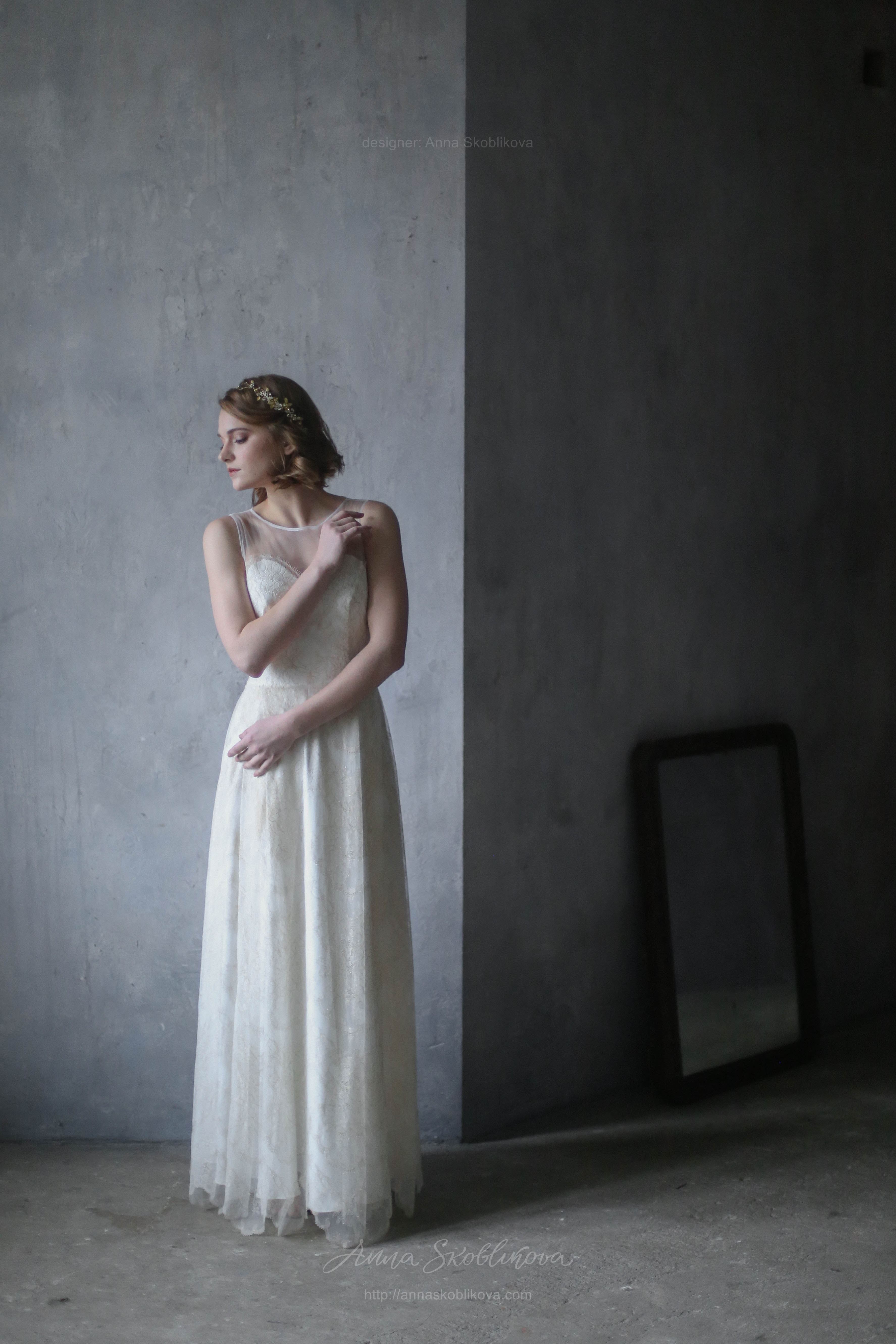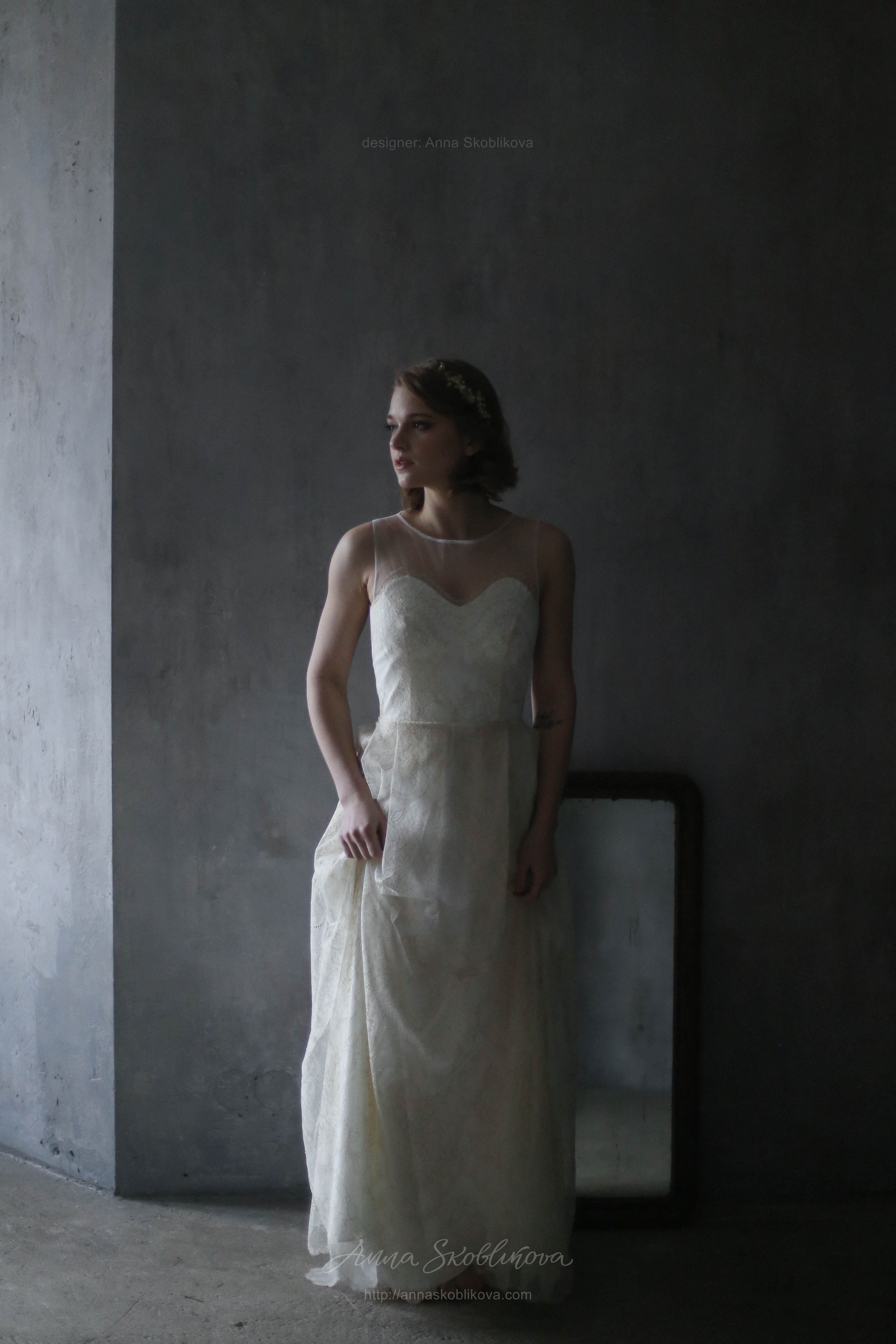 Свадебное платье из молочного кружева с золотой нитью. Лиф платья соединен с сеткой, спинка на пуговичках. Нижняя часть заложена в складки от талии и низ платья завершается золотым фестоном.