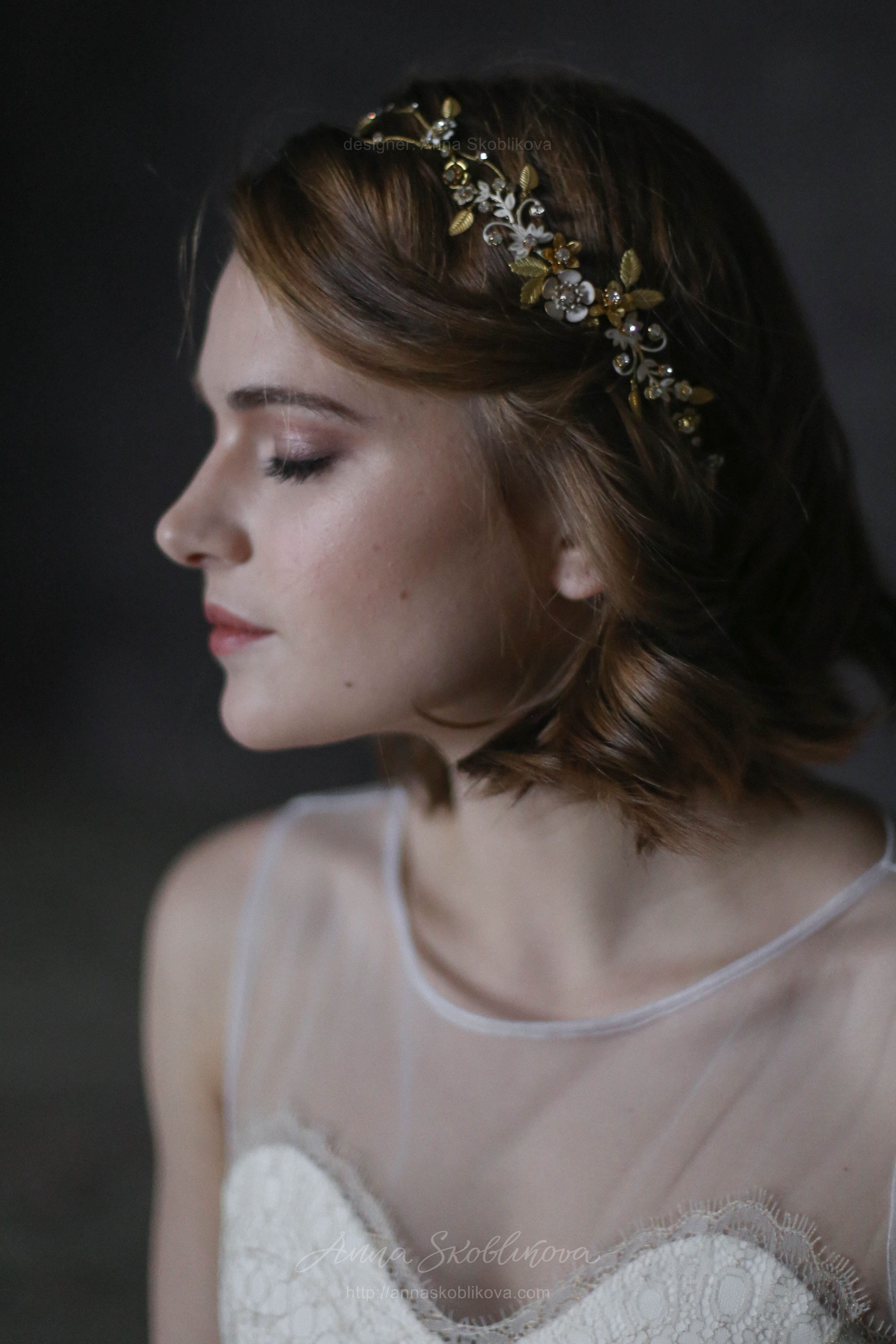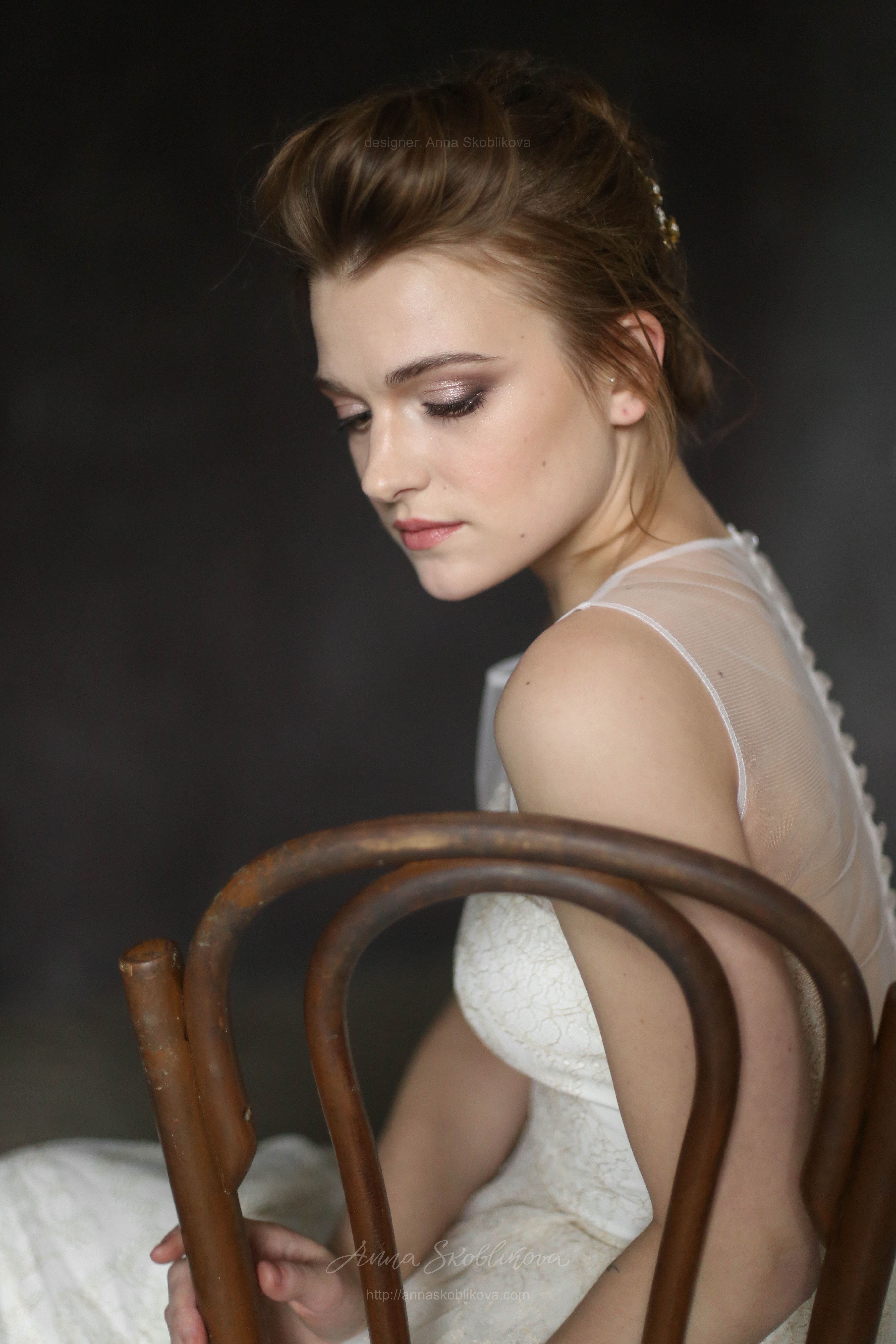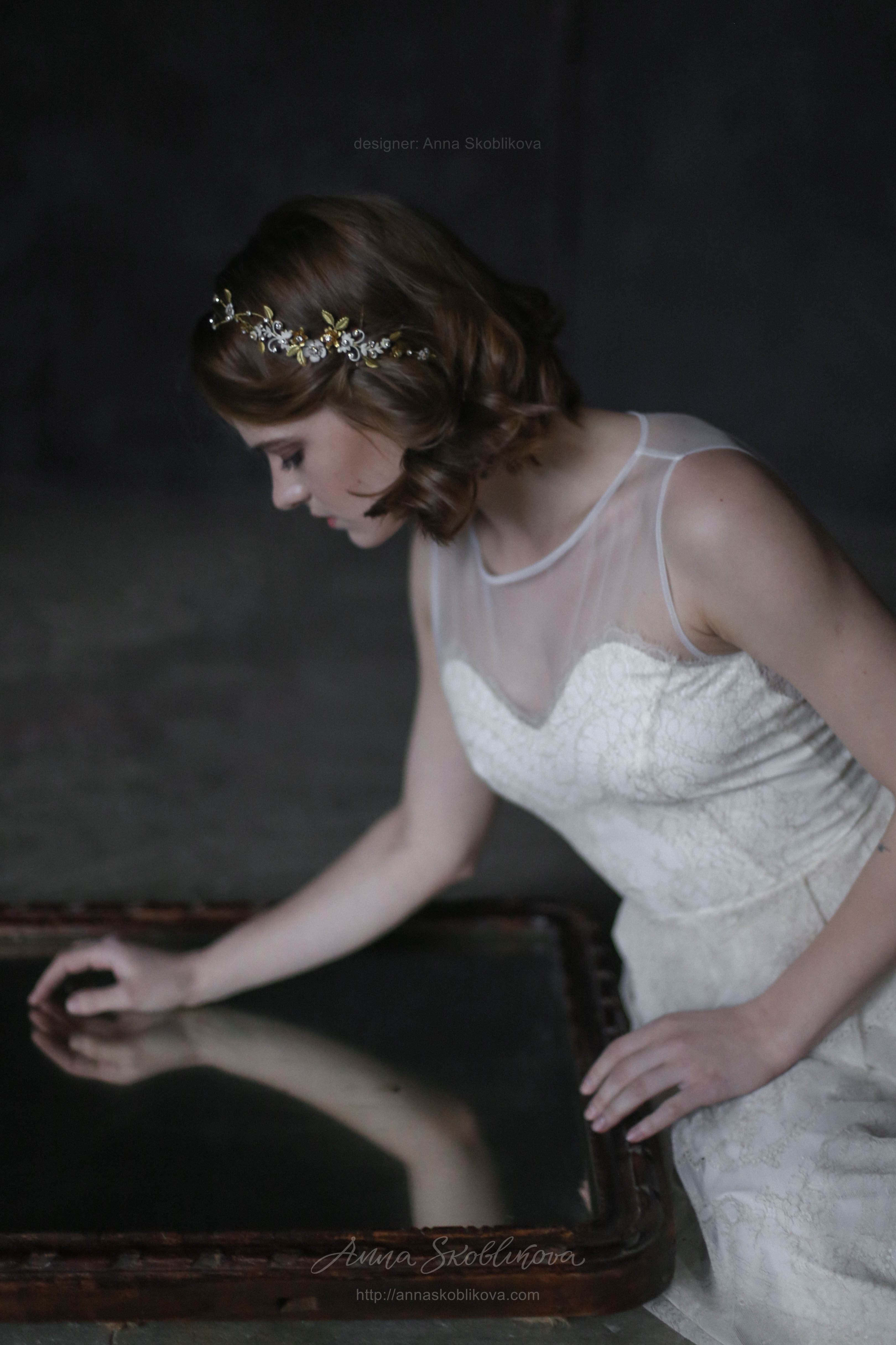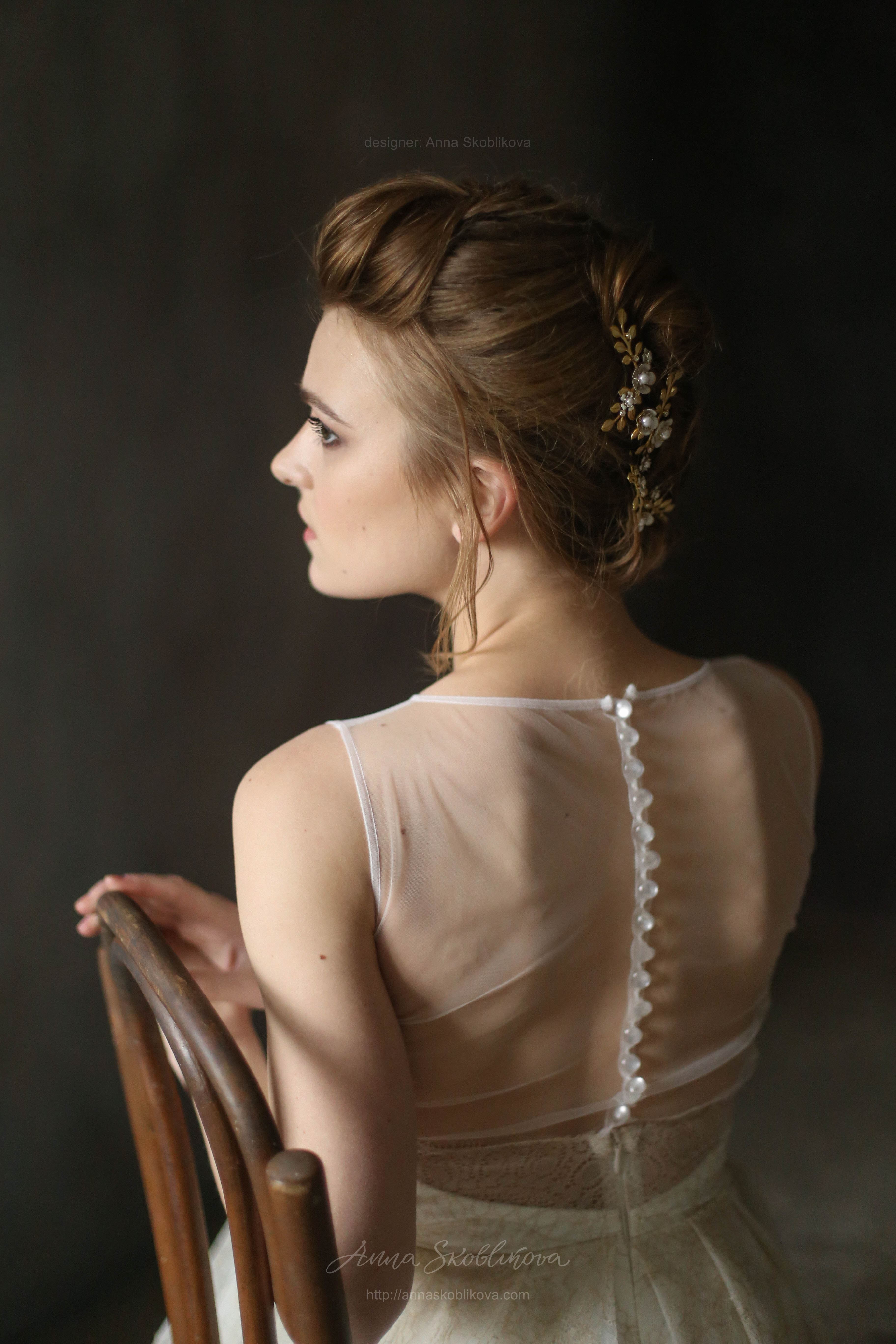 Свадебное платье из молочного кружева с золотой нитью. Лиф платья соединен с сеткой, спинка на пуговичках. Нижняя часть заложена в складки от талии и низ платья завершается золотым фестоном.