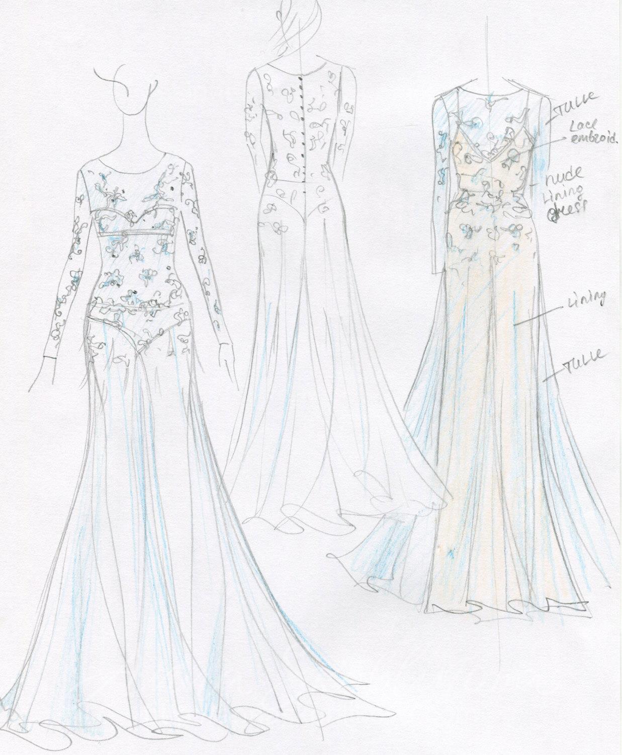 Свадебное платье имеет круглый вырез спереди и сзади, а так-же длинный рукав, до линии ног платье вышито кристаллами и элементами кружева, так-же вышиты рукава.