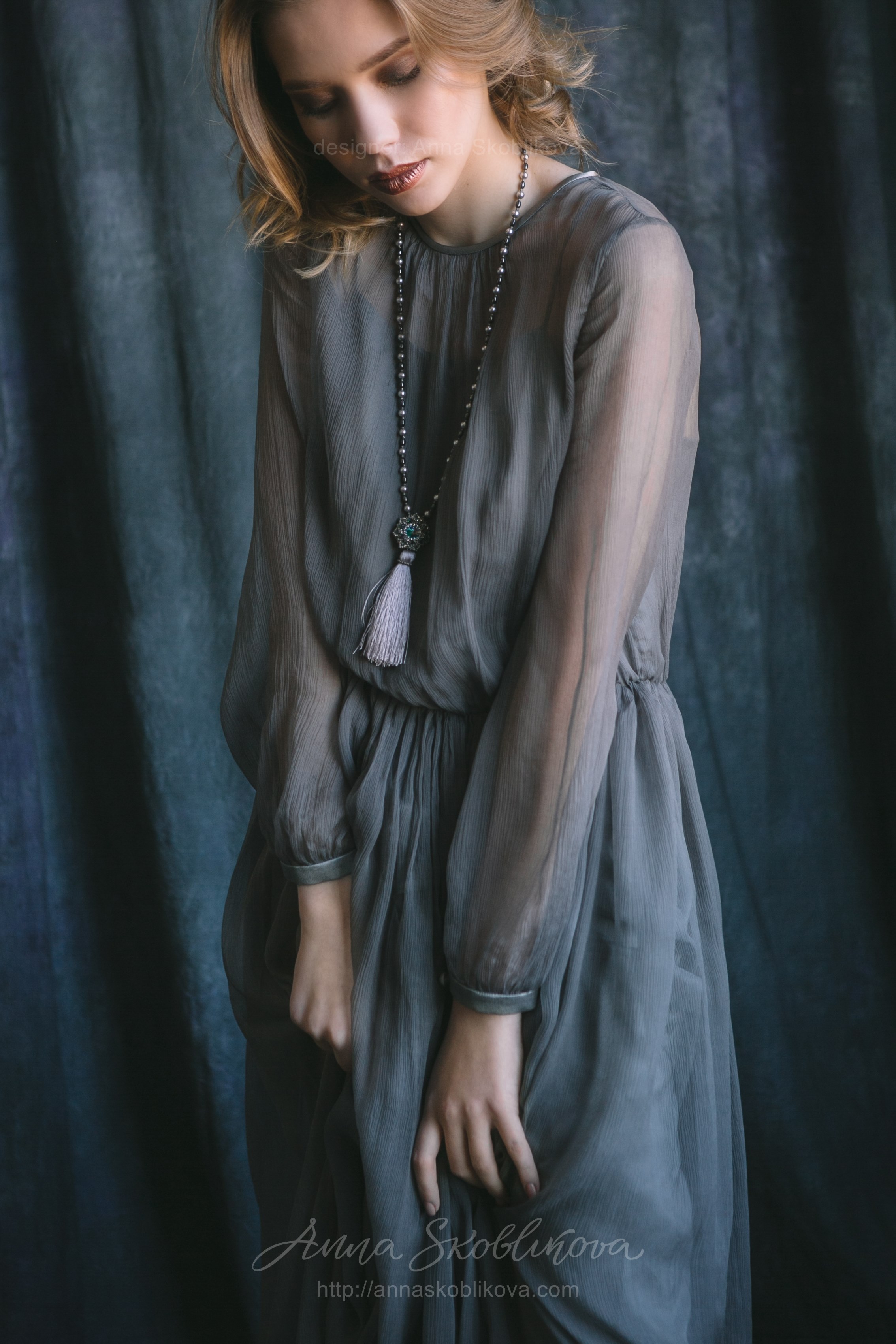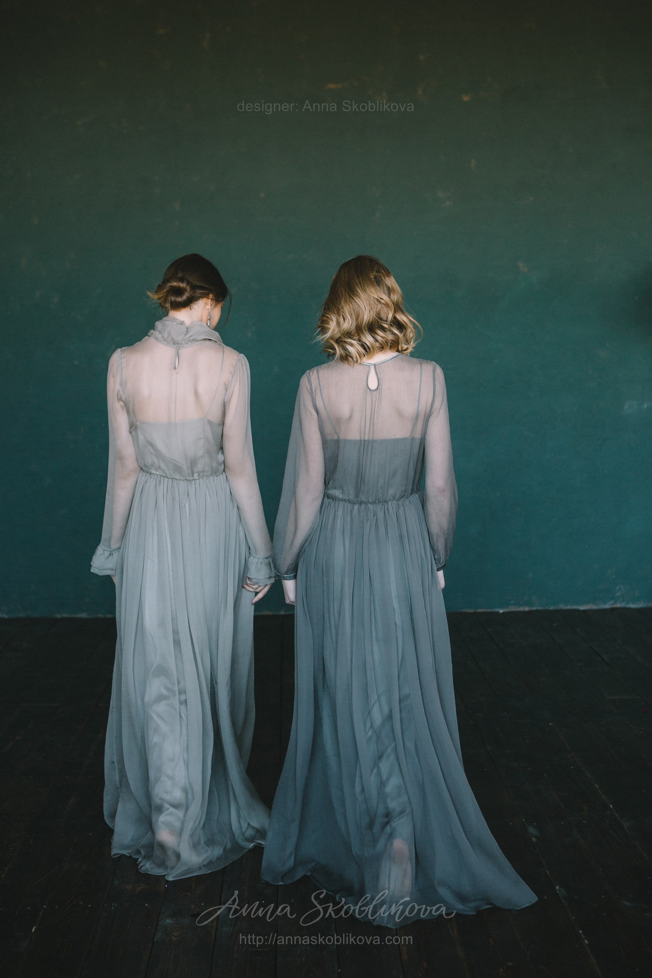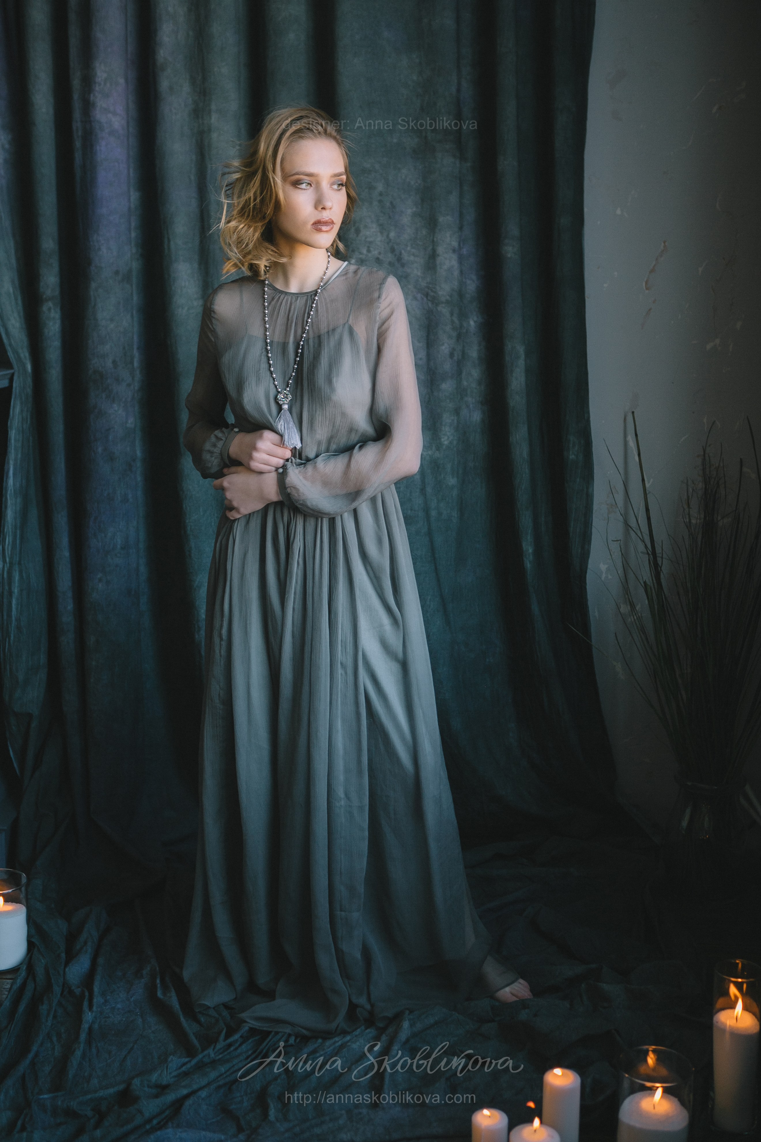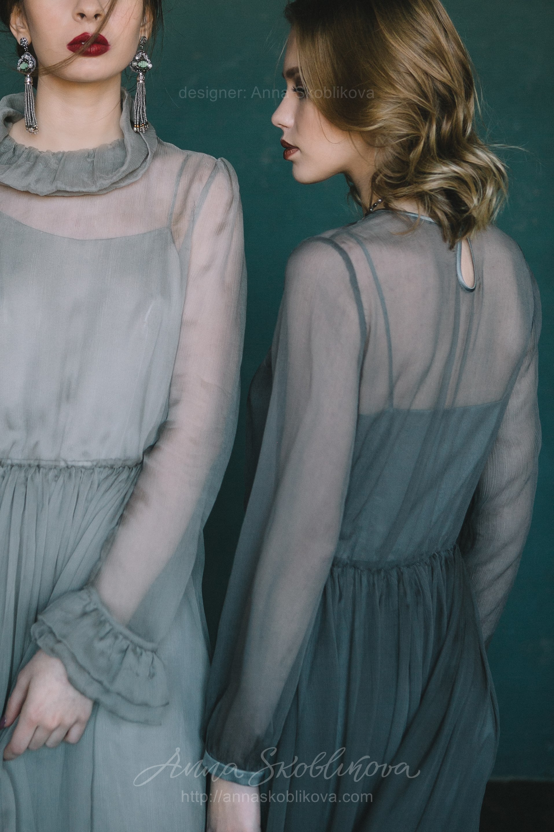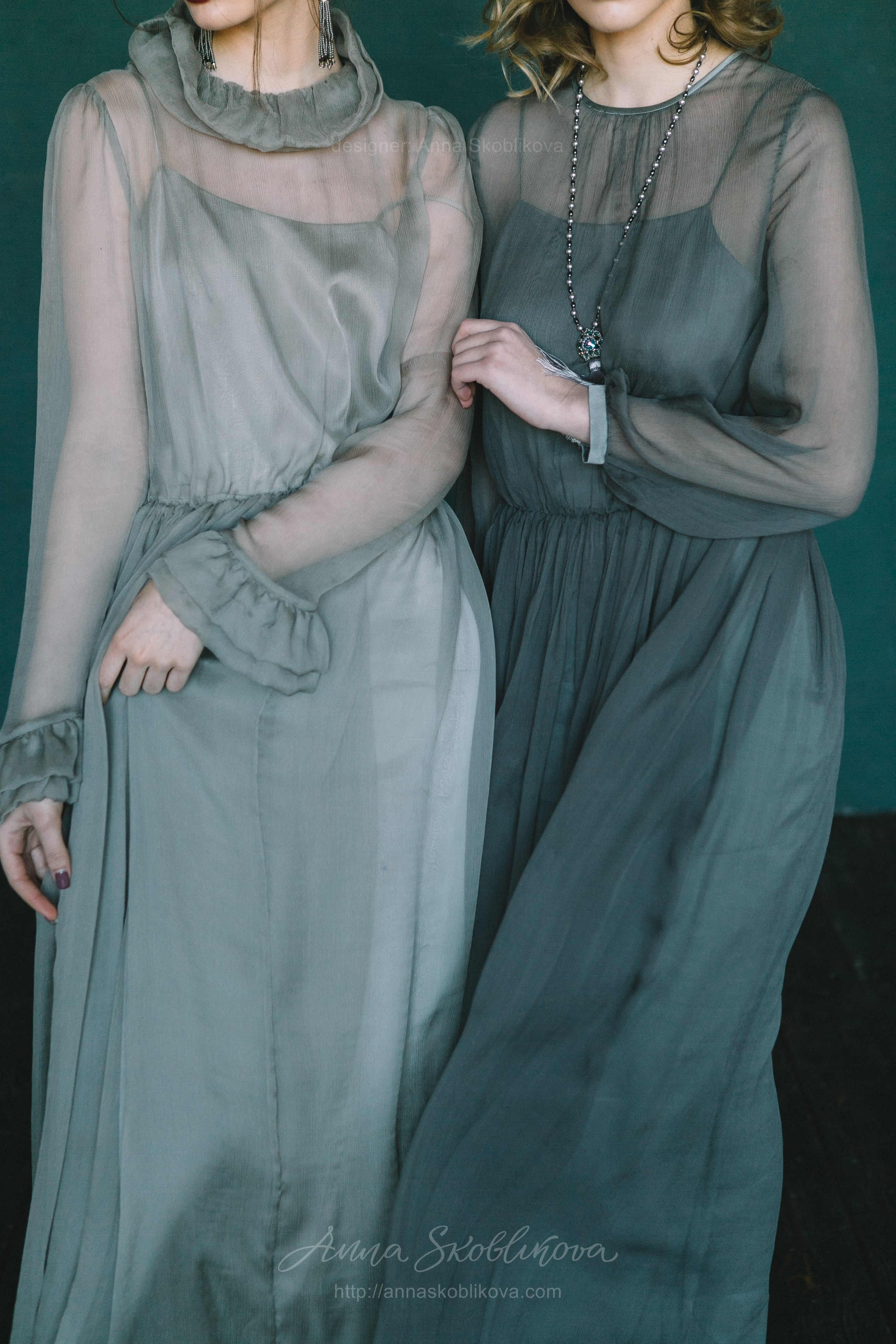 Роскошное свадебное платье из натурального шелка сложного темно-болотного цвета. Лаконичное свадебное платье, с шелковой отделкой на горловине и манжетах, легкое струящееся и летящее.
