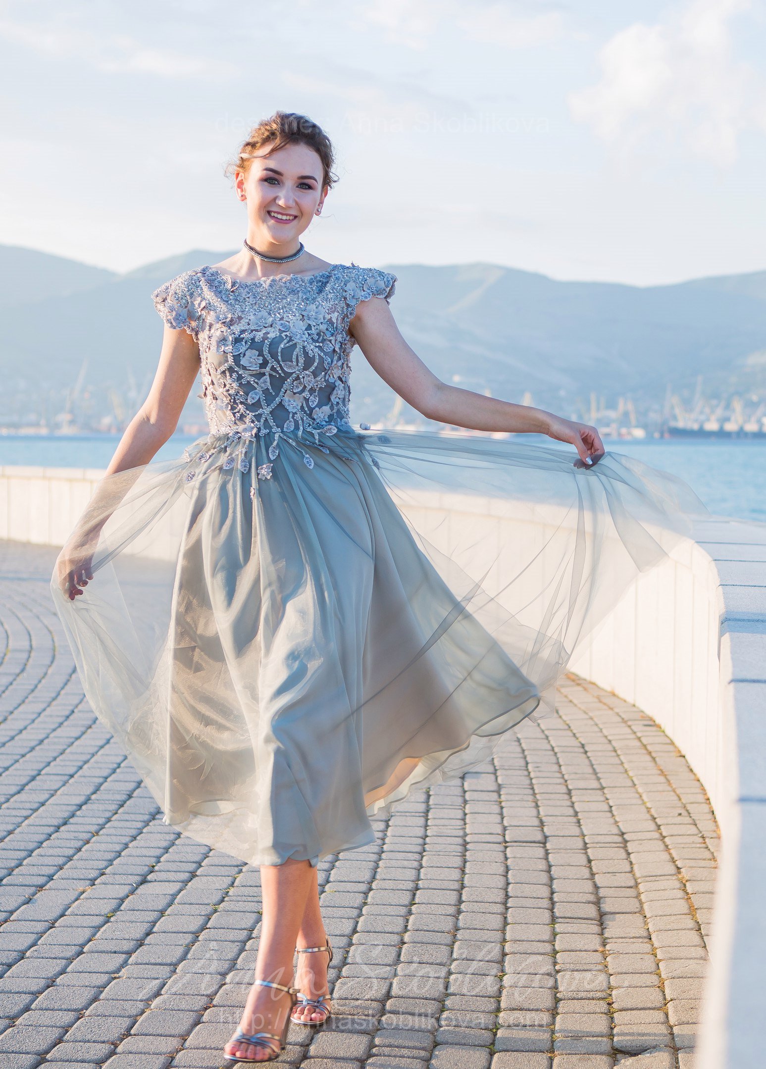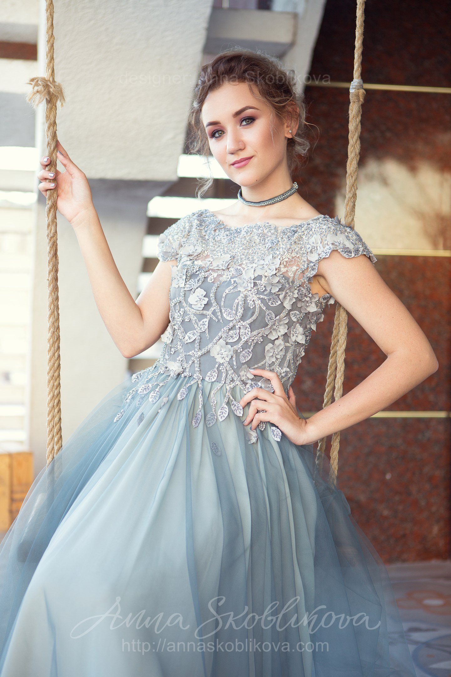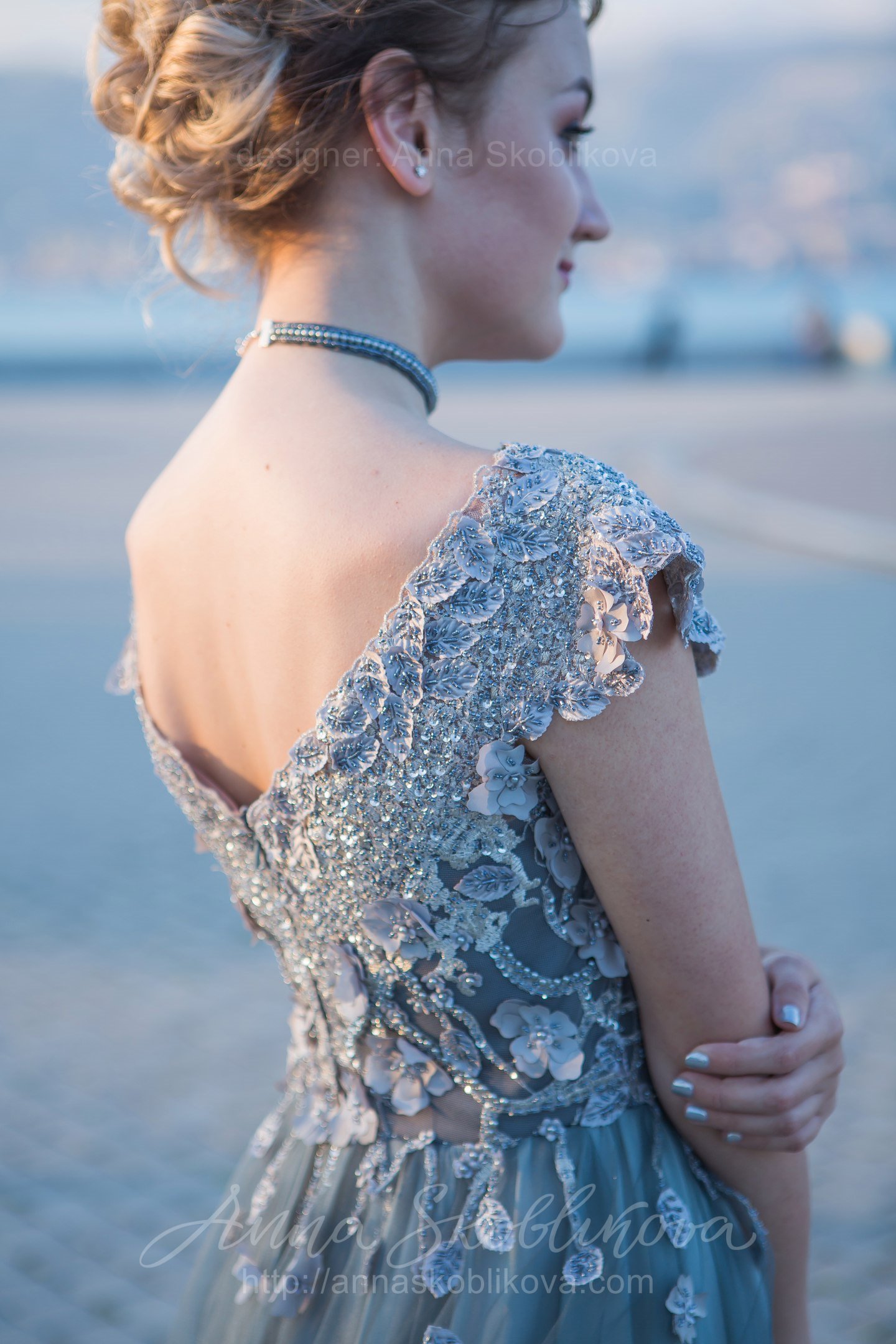 Роскошное вечернее платье серо-зеленого цвета с вышивкой ручной работы. Необычный сложный цвет платья делает его неповторимым и запоминающимся. Ручная вышивка из цветов, лепестков и бусин покрывает лиф платья и переходит на юбку. Рукав имеет форму маленького крылышка для удобства движения, на спине имеется не глубокий, в-образный вырез.