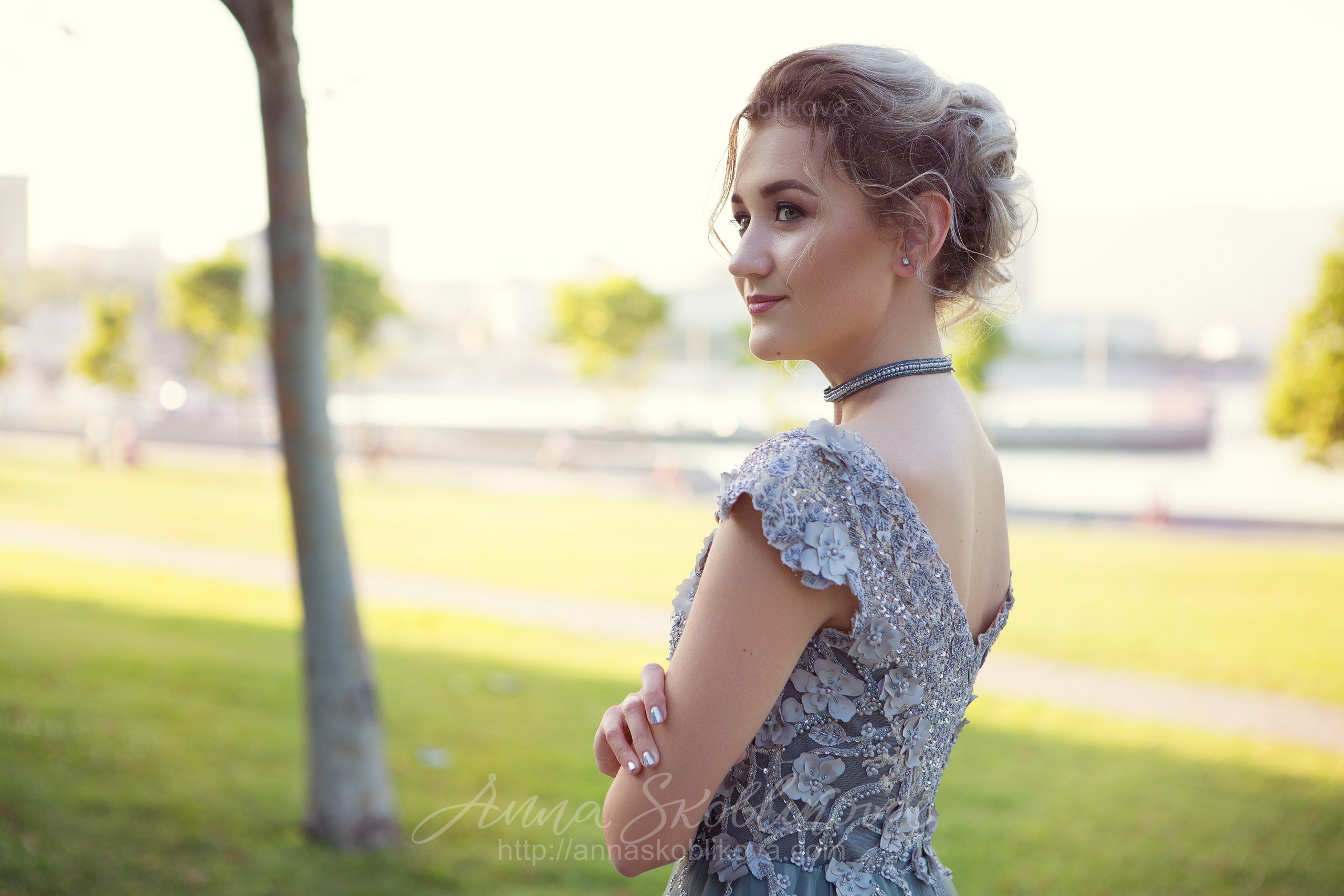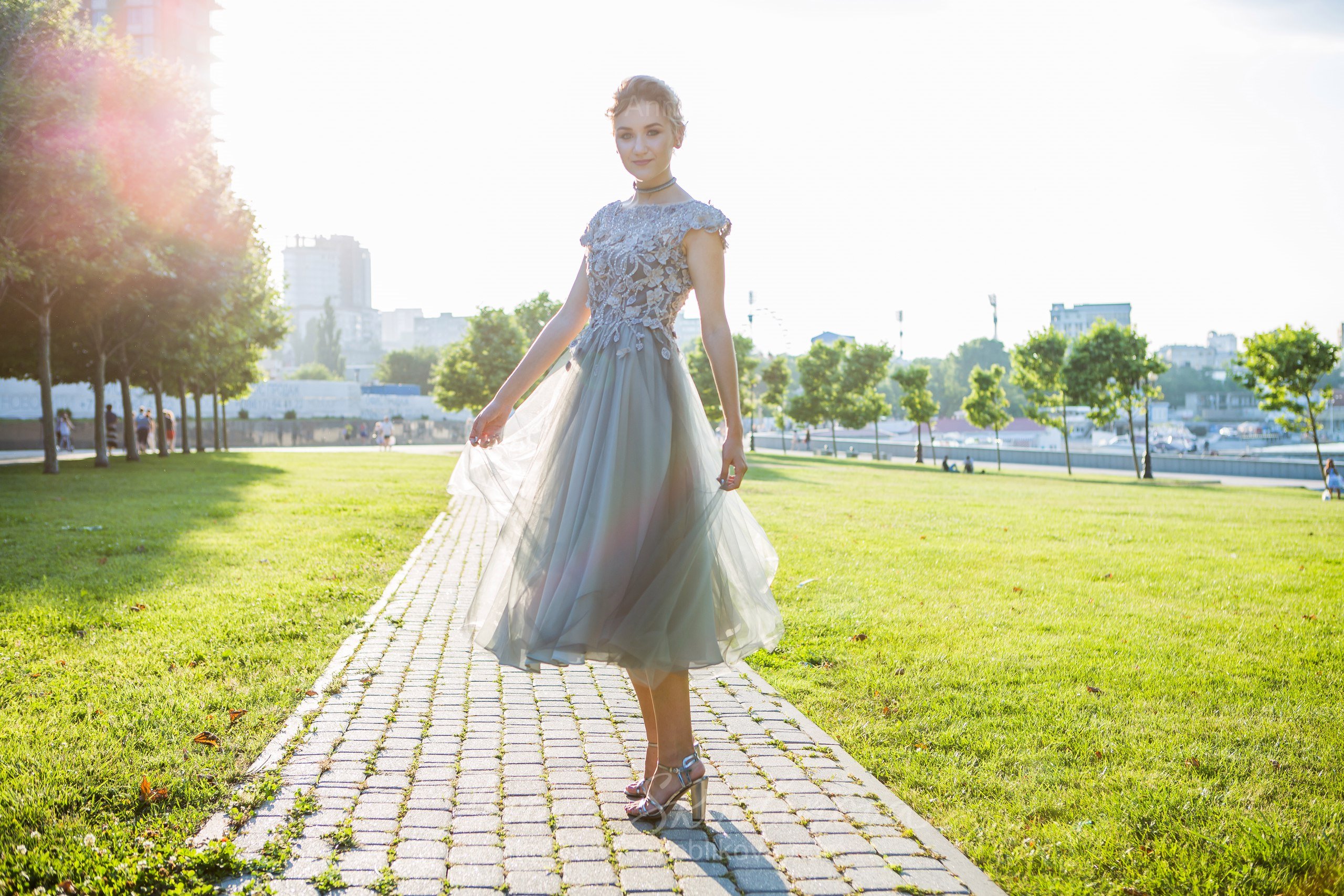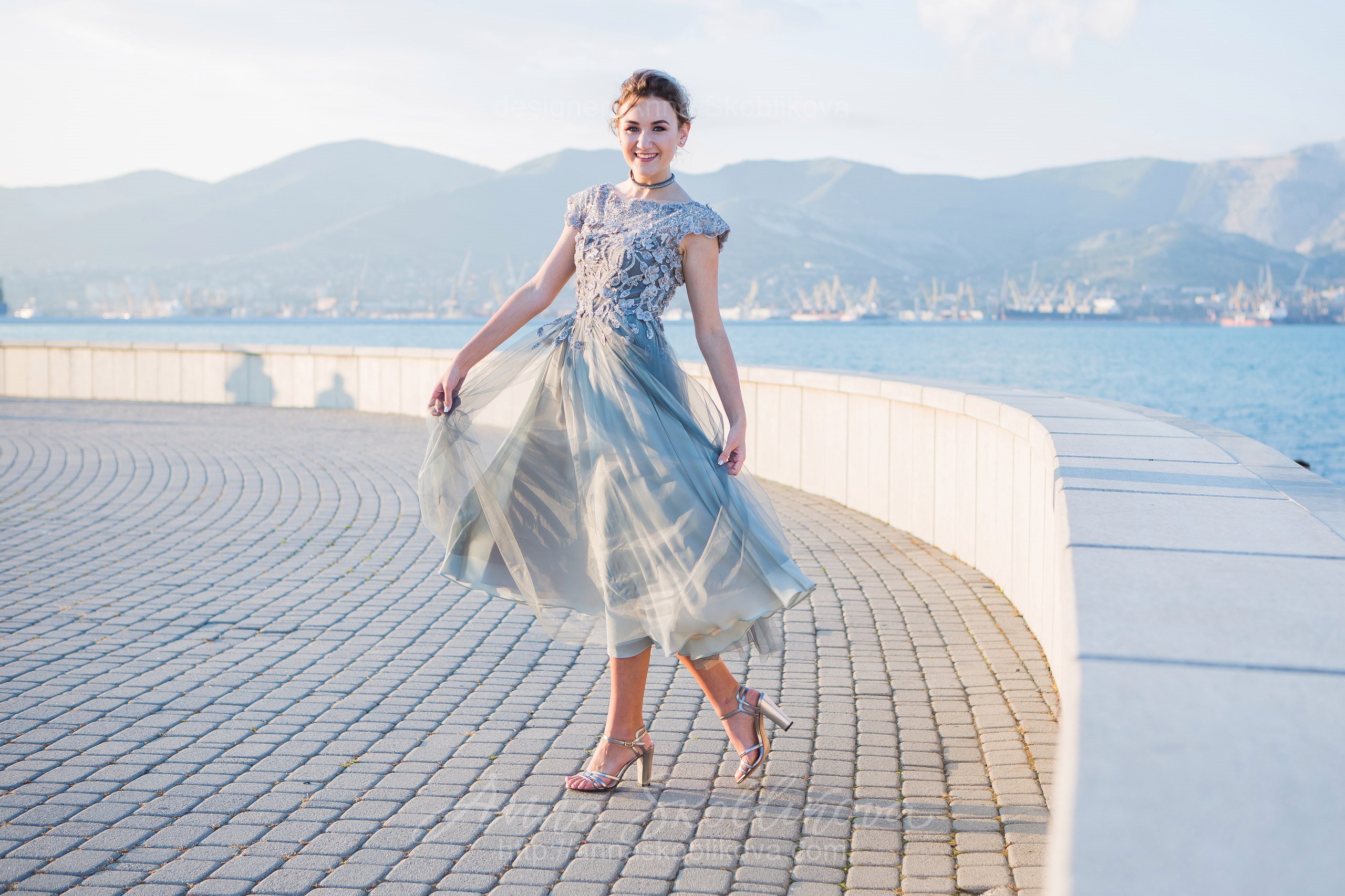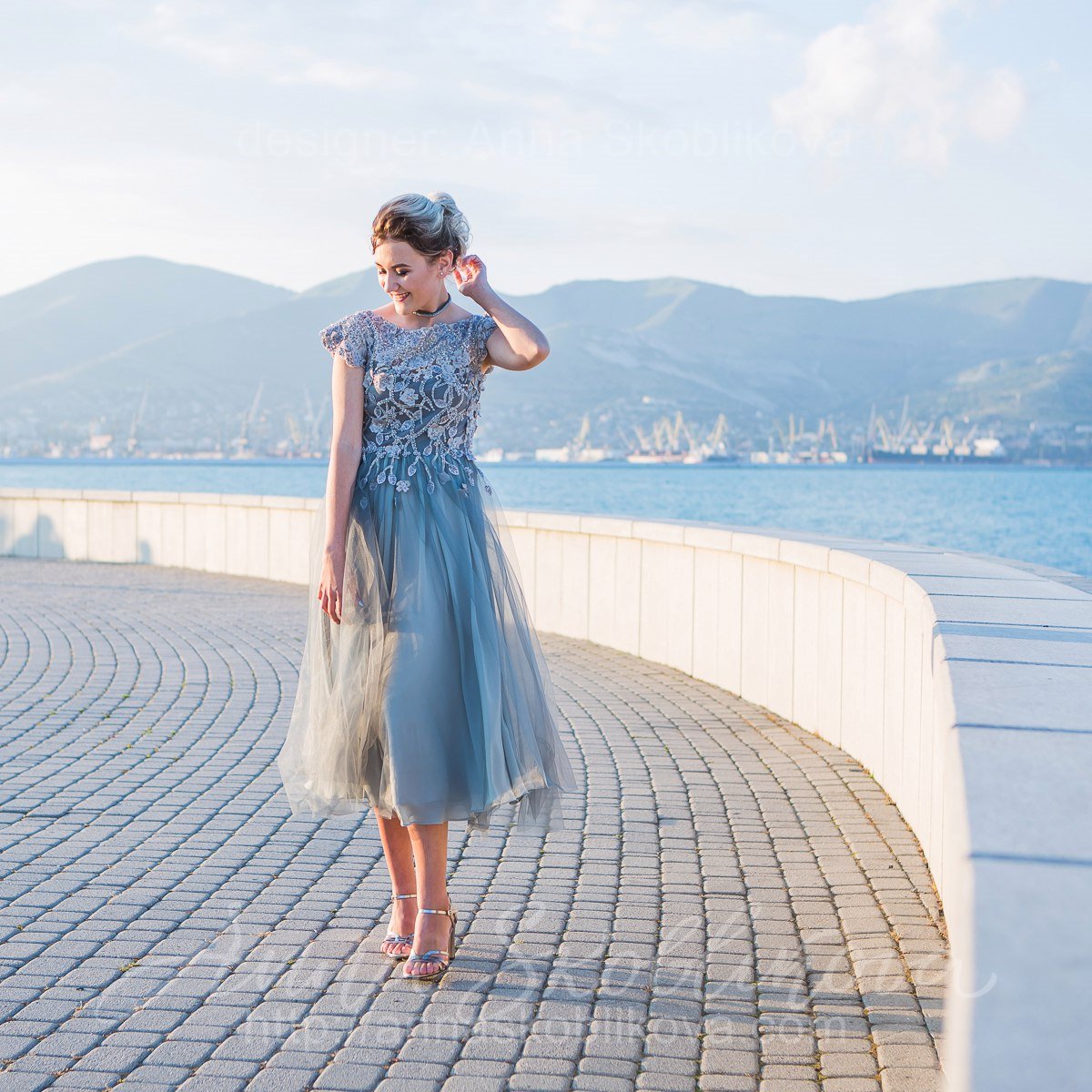 Роскошное вечернее платье серо-зеленого цвета с вышивкой ручной работы. Необычный сложный цвет платья делает его неповторимым и запоминающимся. Ручная вышивка из цветов, лепестков и бусин покрывает лиф платья и переходит на юбку. Рукав имеет форму маленького крылышка для удобства движения, на спине имеется не глубокий, в-образный вырез.