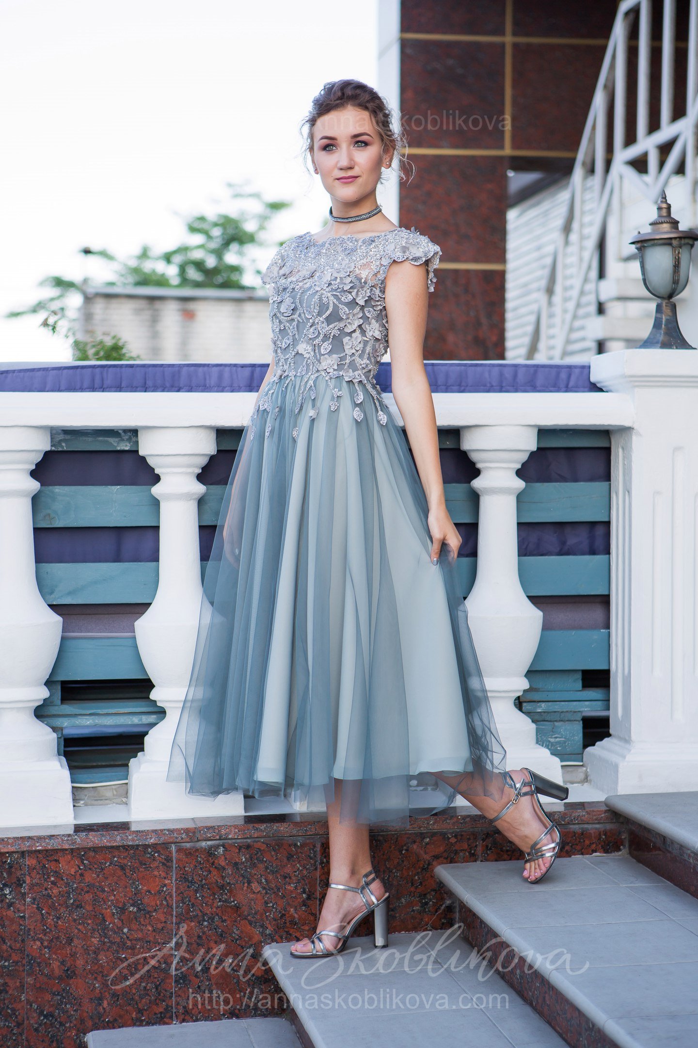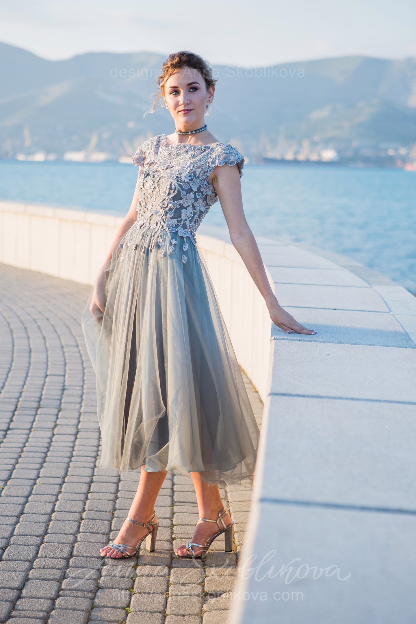Вечернее платье серо-зеленого цвета с вышивкой ручной работы