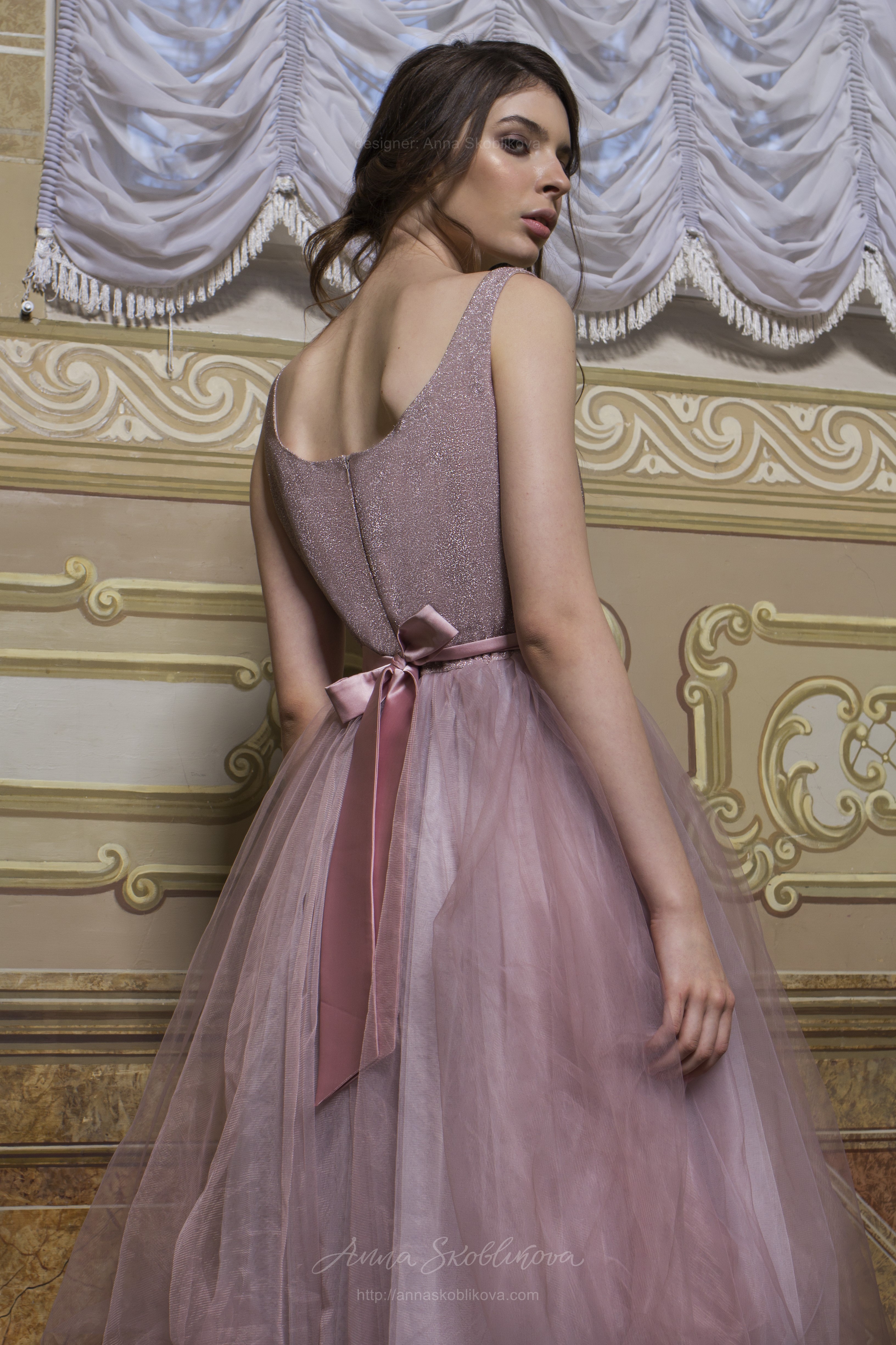 Розовое платье с топом на бретелях имеет воздушную юбку в которой сочетаются несколько оттенков тюля.