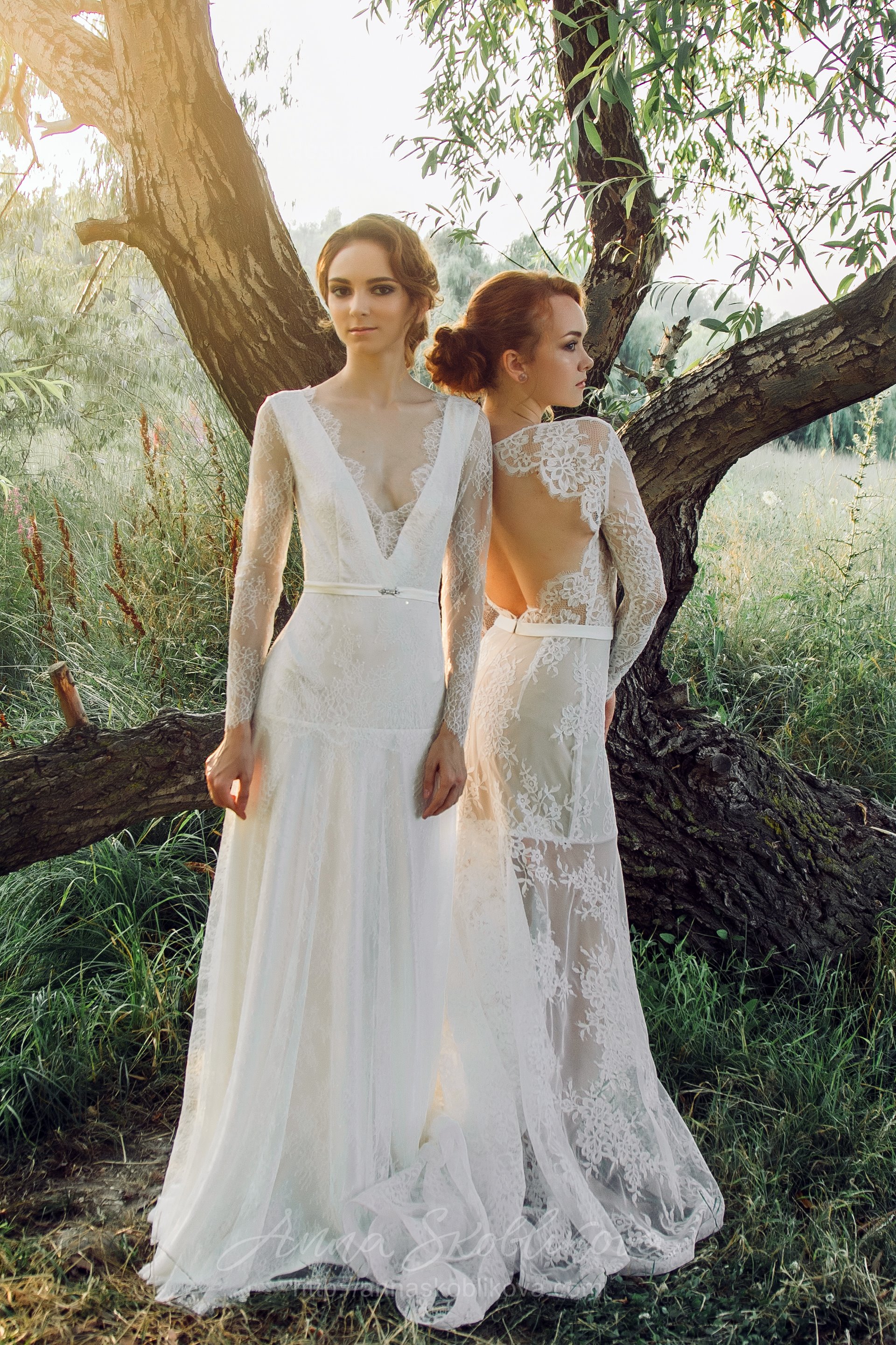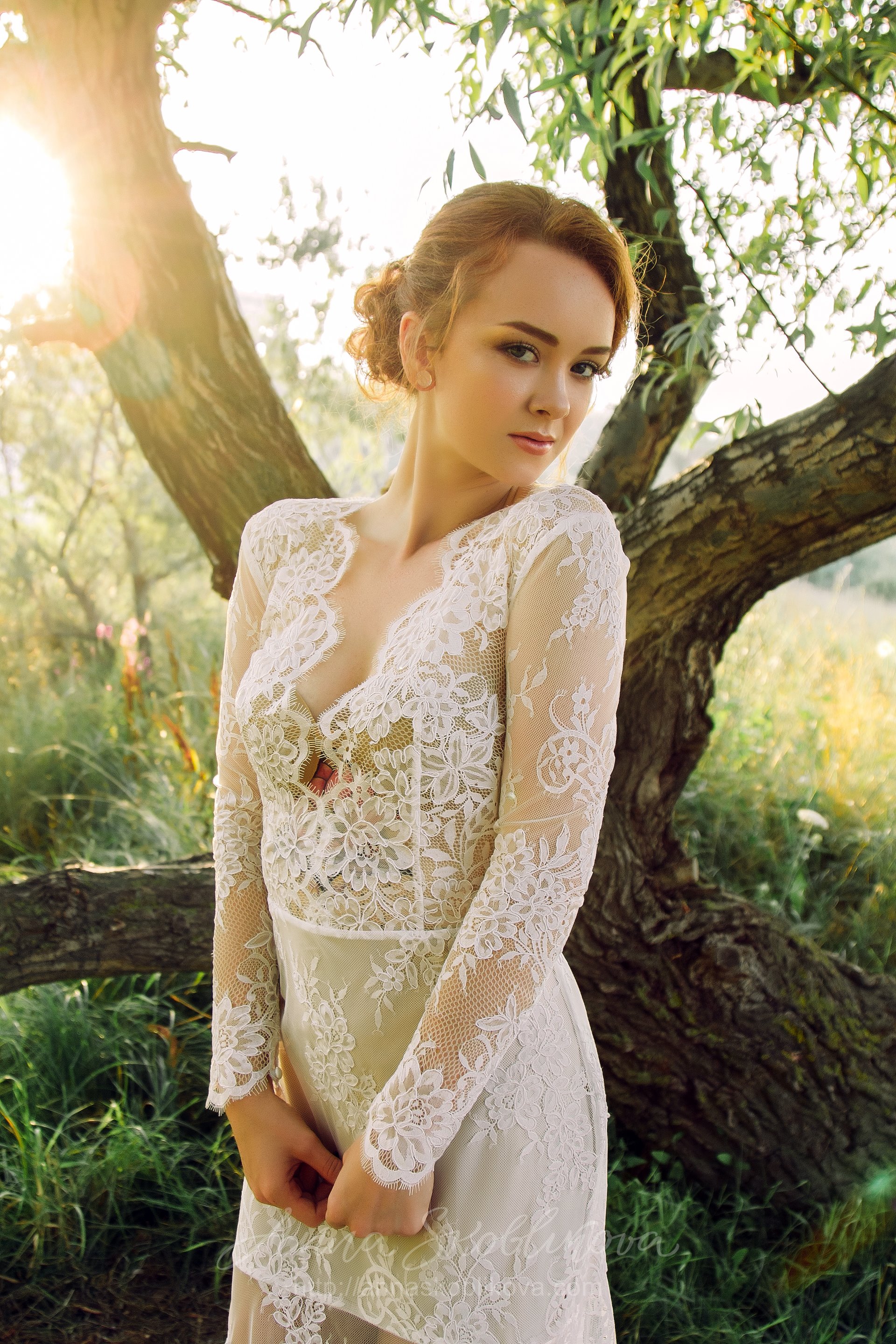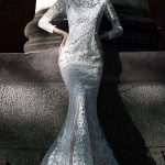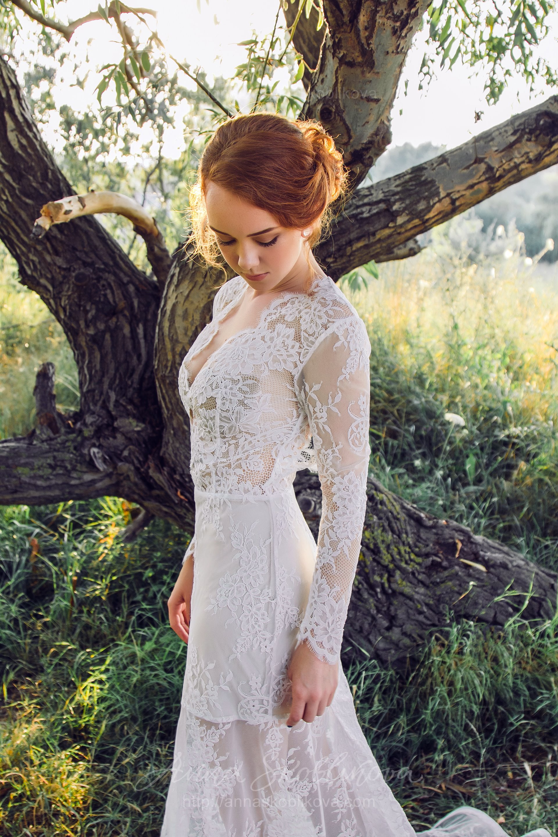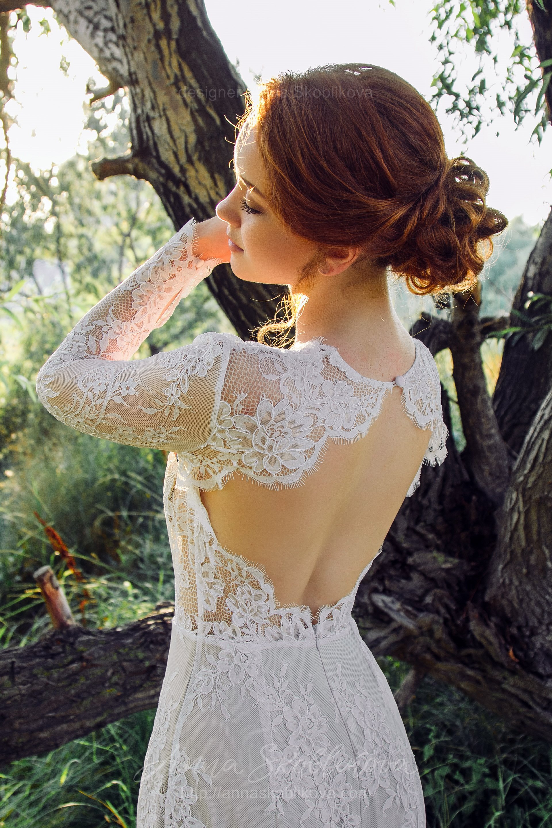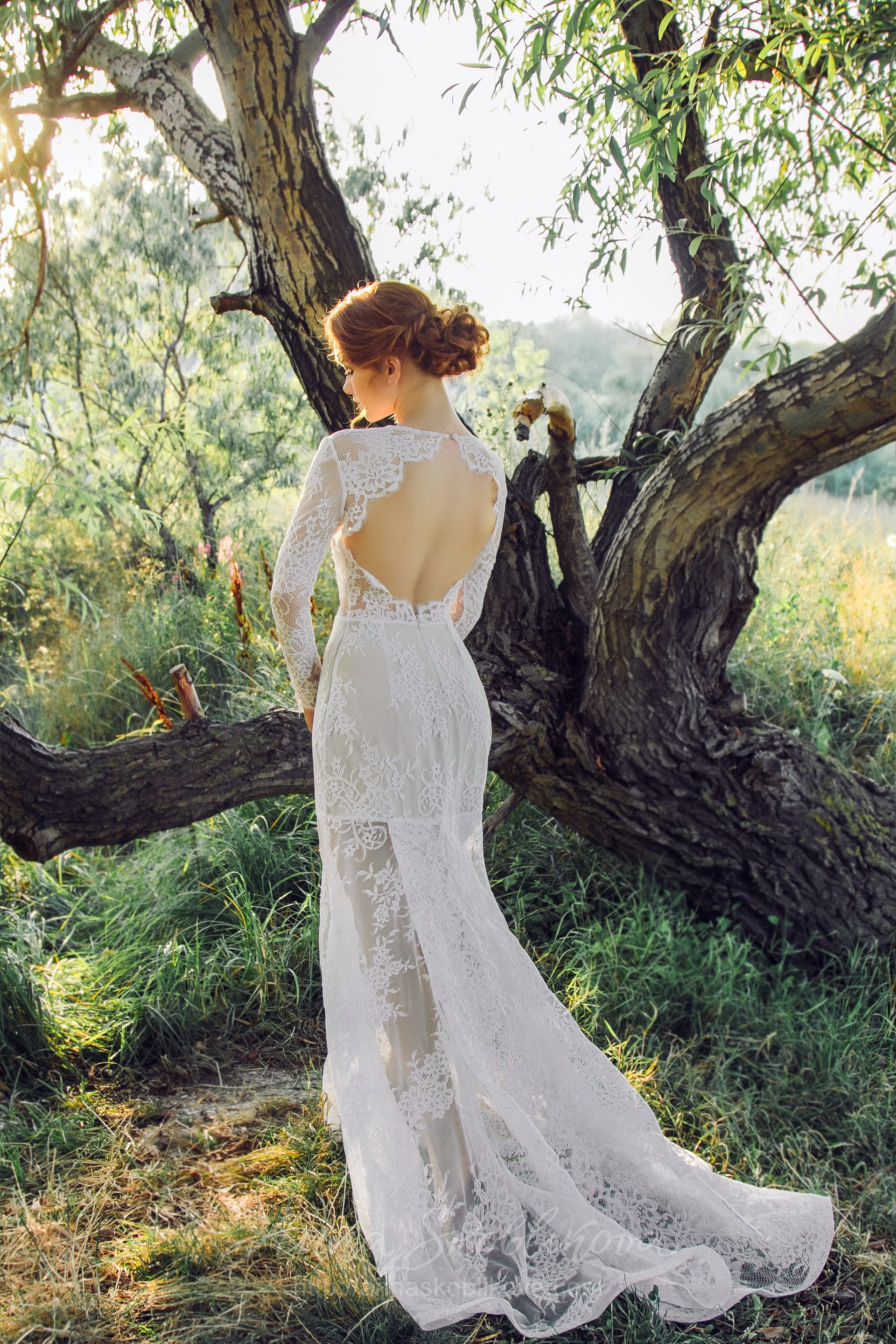 Нижняя часть свадебного платья облегает бедра, а далее расклепается полу-солнцем, образовывая силуэт русалка.