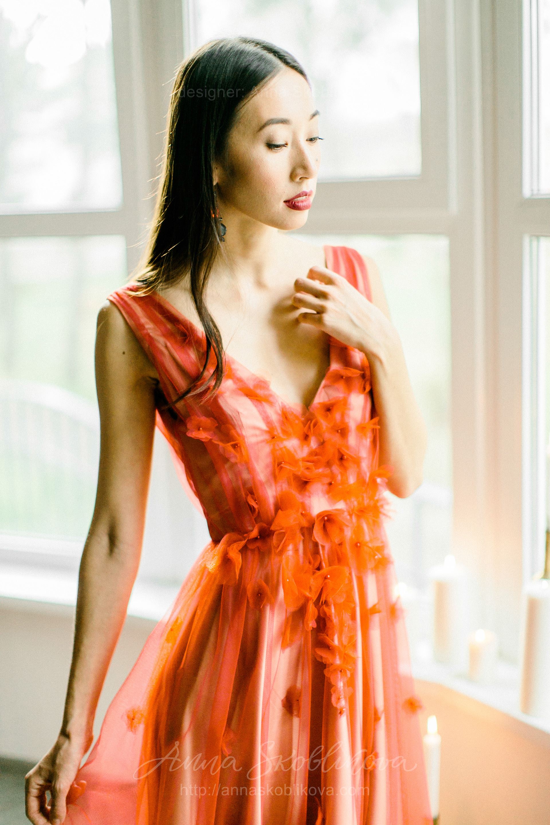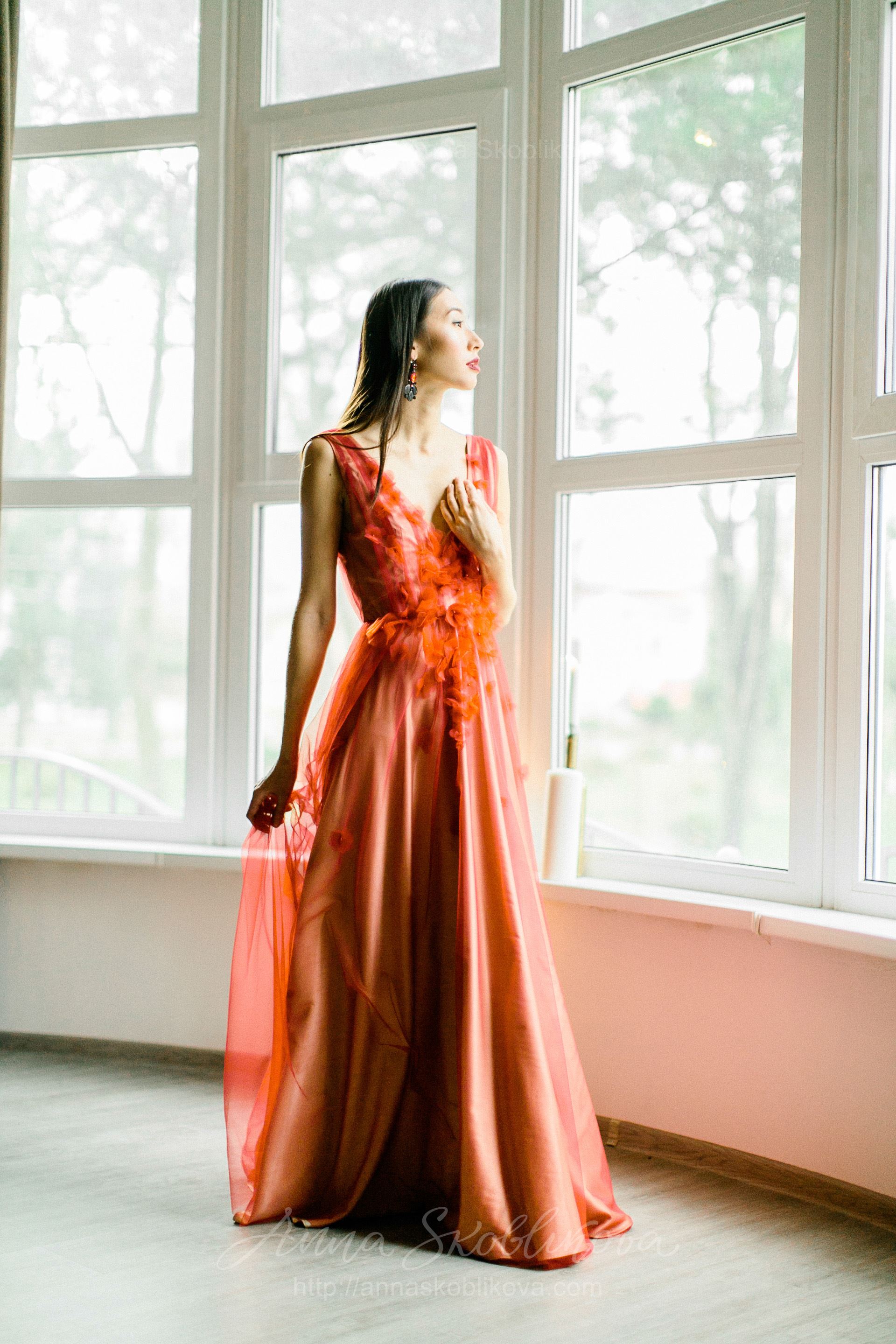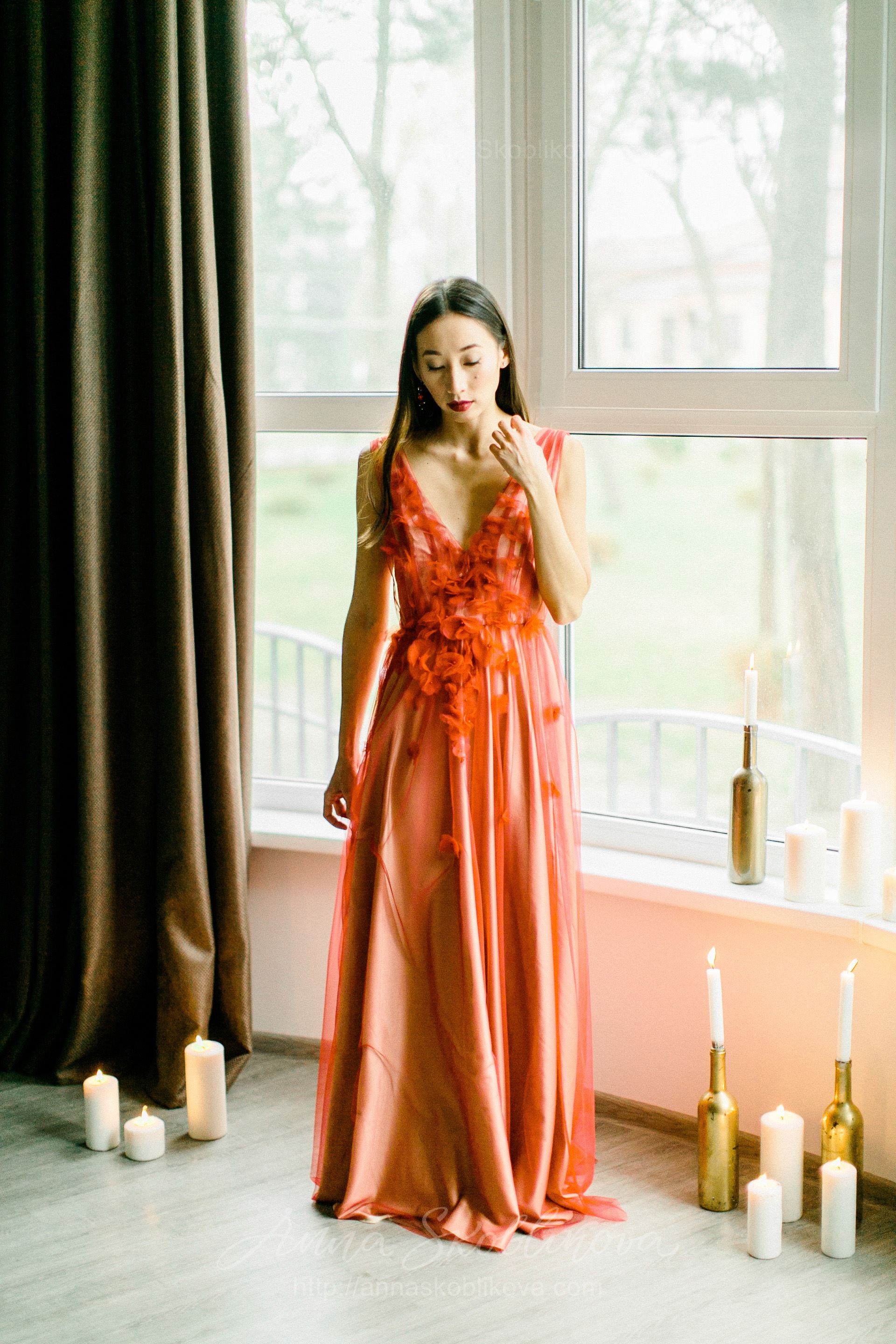 Необычное Вечернее и Свадебное платье красного цвета из итальянской сеточки красного цвета и цветами ручной работы. Яркий цвет, ручная фактура и контраст телесной подкладки и красной сетки создают необычный эффект, если вы хотите остаться замеченной – это платье для Вас.