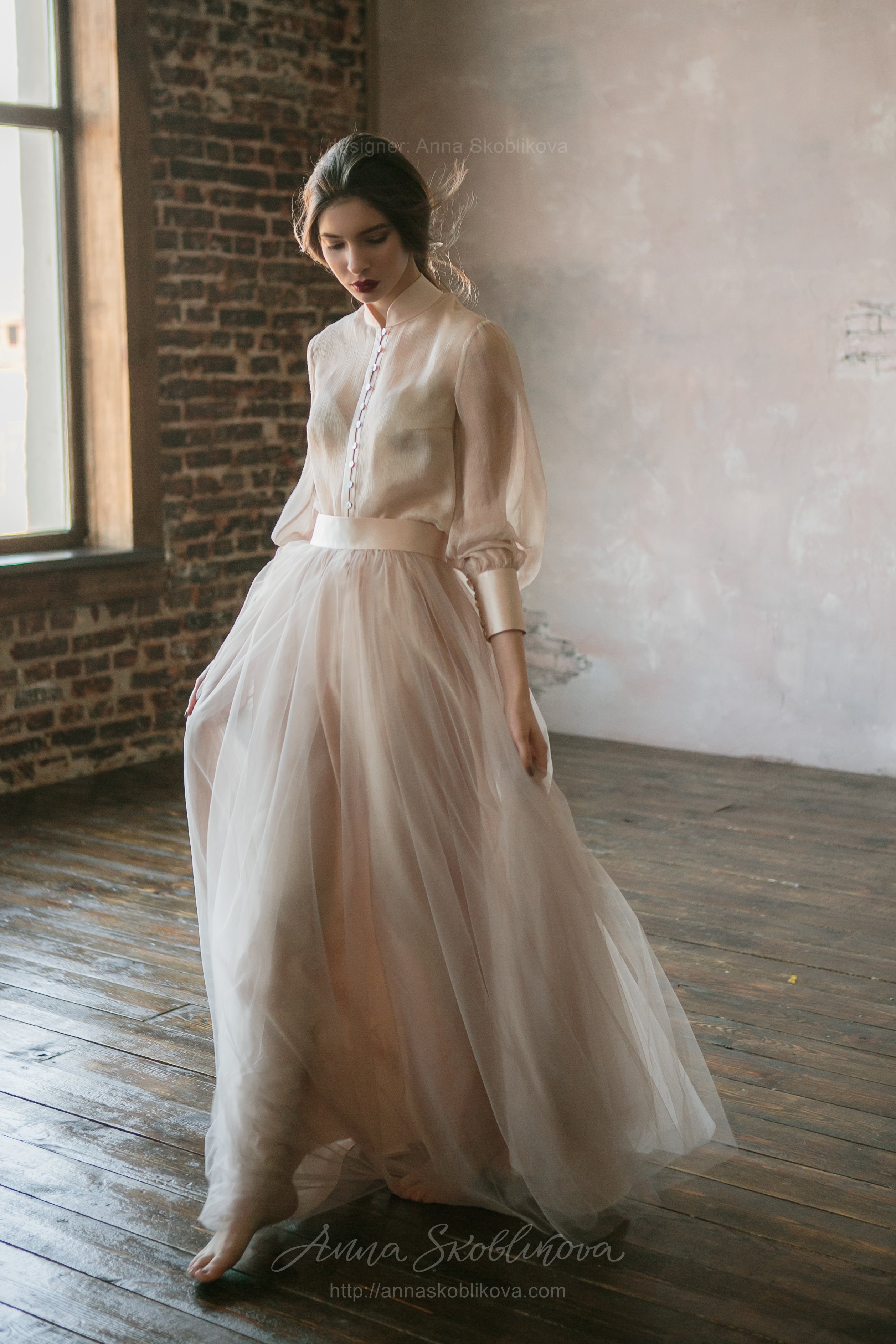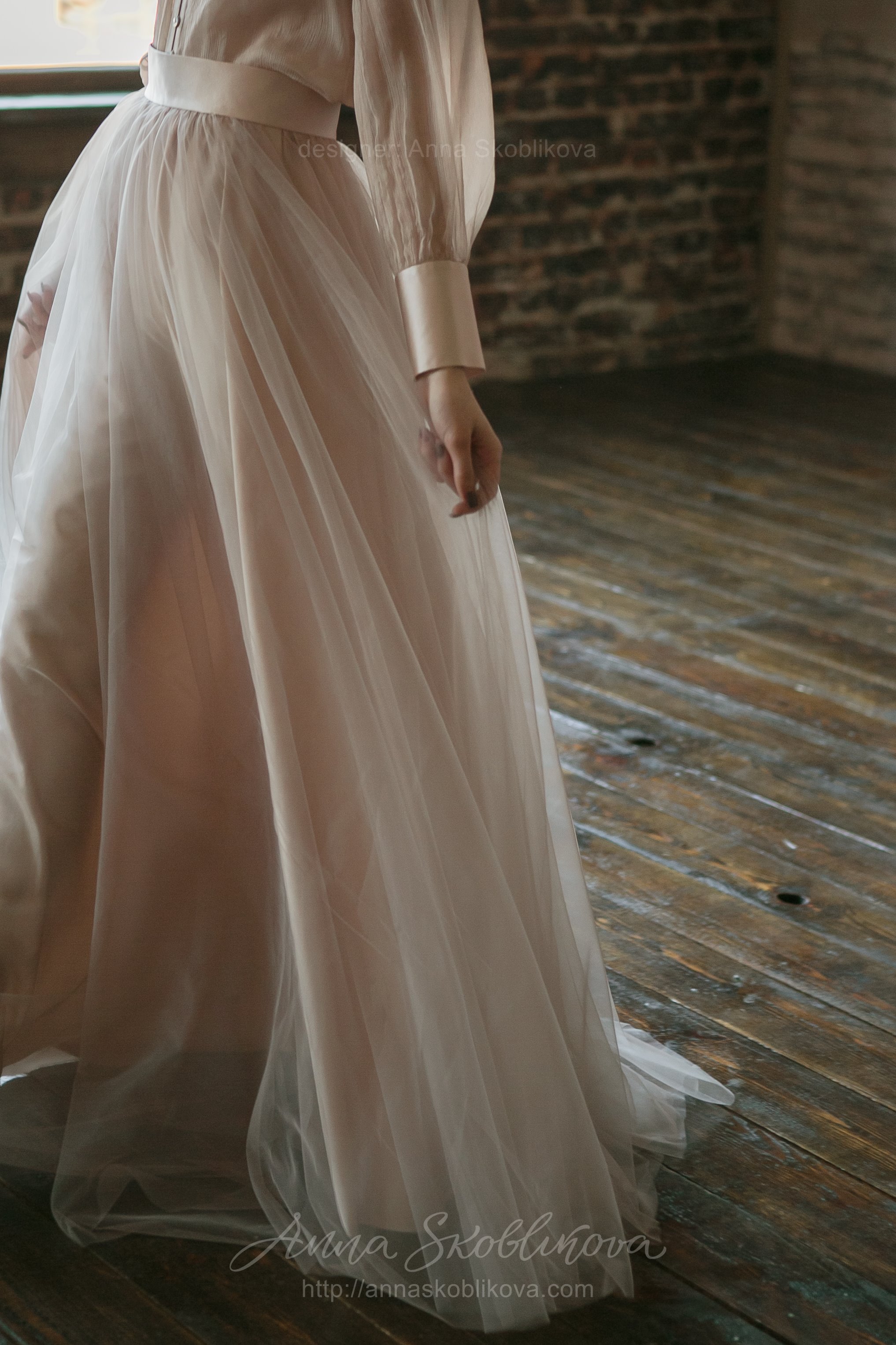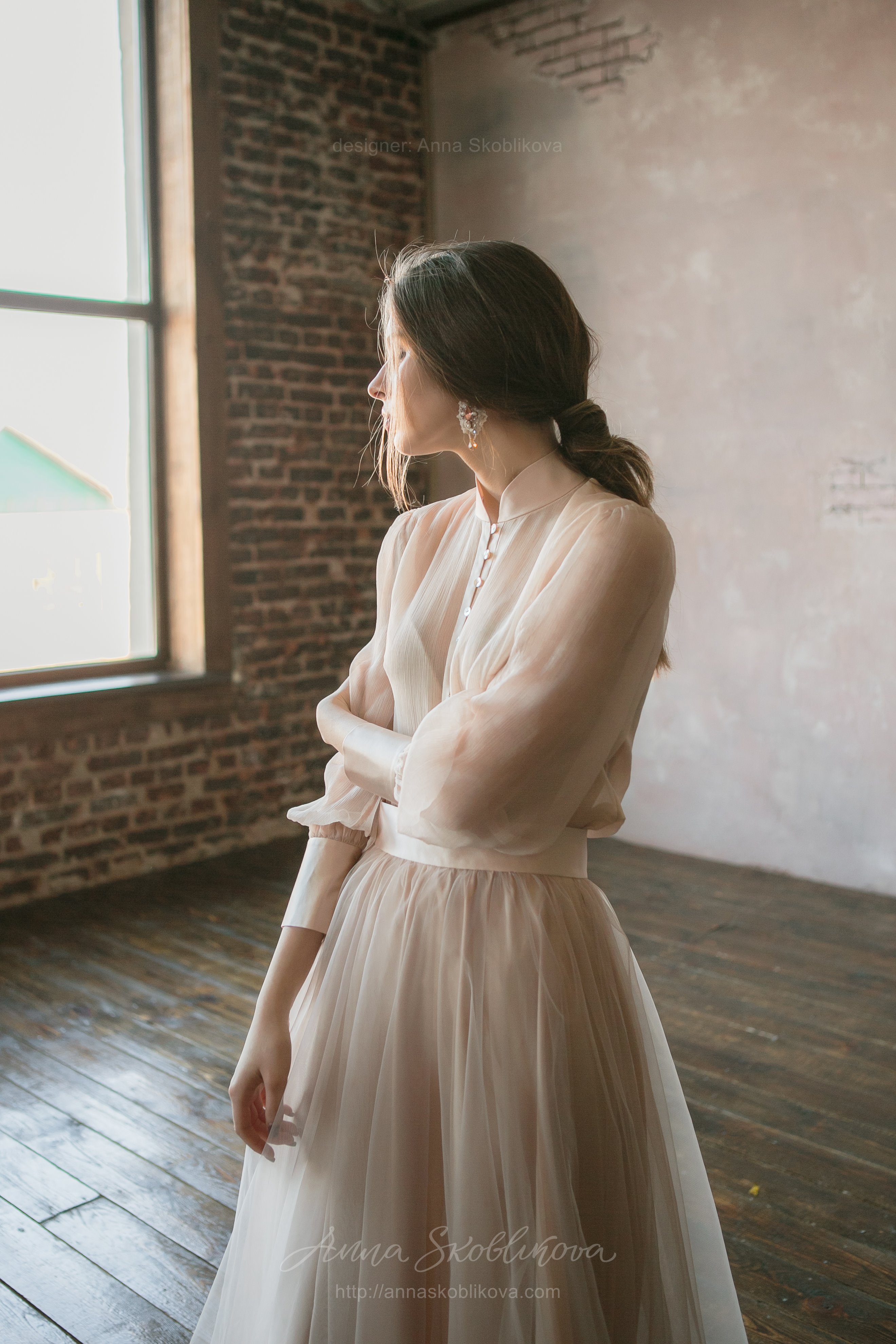 Роскошный пудровый комплект в винтажном духе. Блуза сшита в два слоя из натурального креп-шелка. (жатый шелк, шифон жатый, шелк шифоновый). Манжеты и планка выполнены из атласного шелка – пуговицы из натурального перламутра. Юбка сшита из фатина в несколько слоев, пояс – атласный шелк.