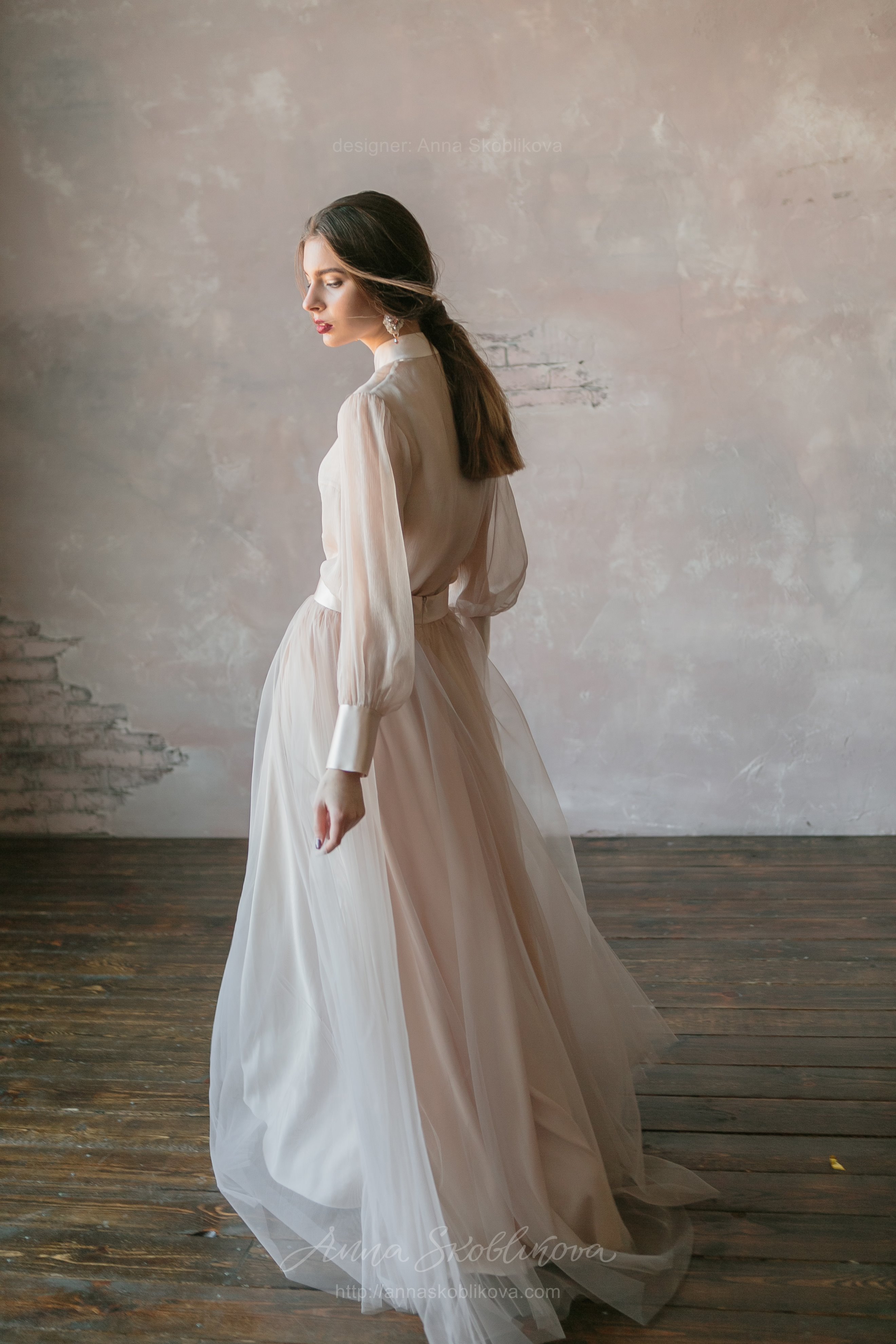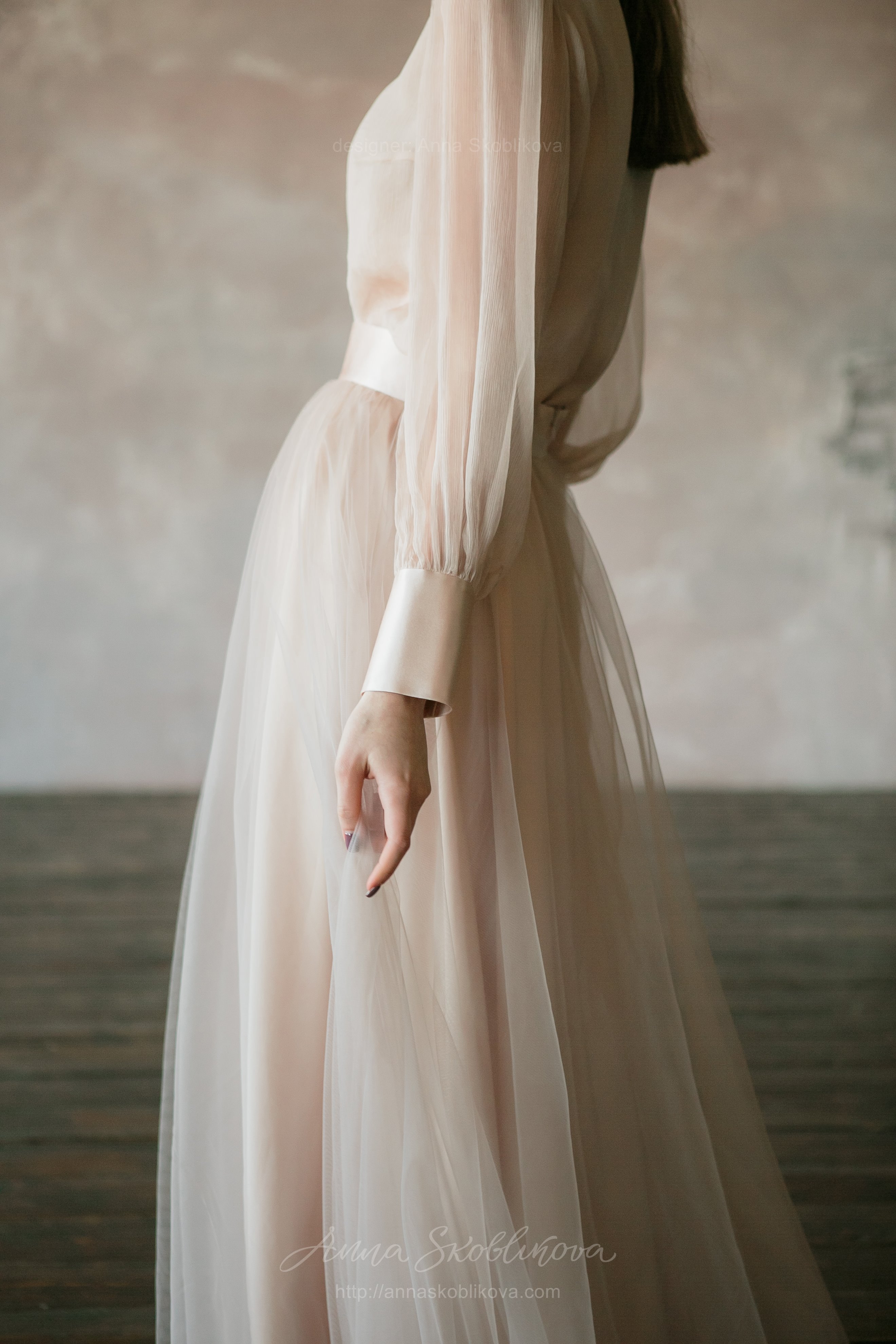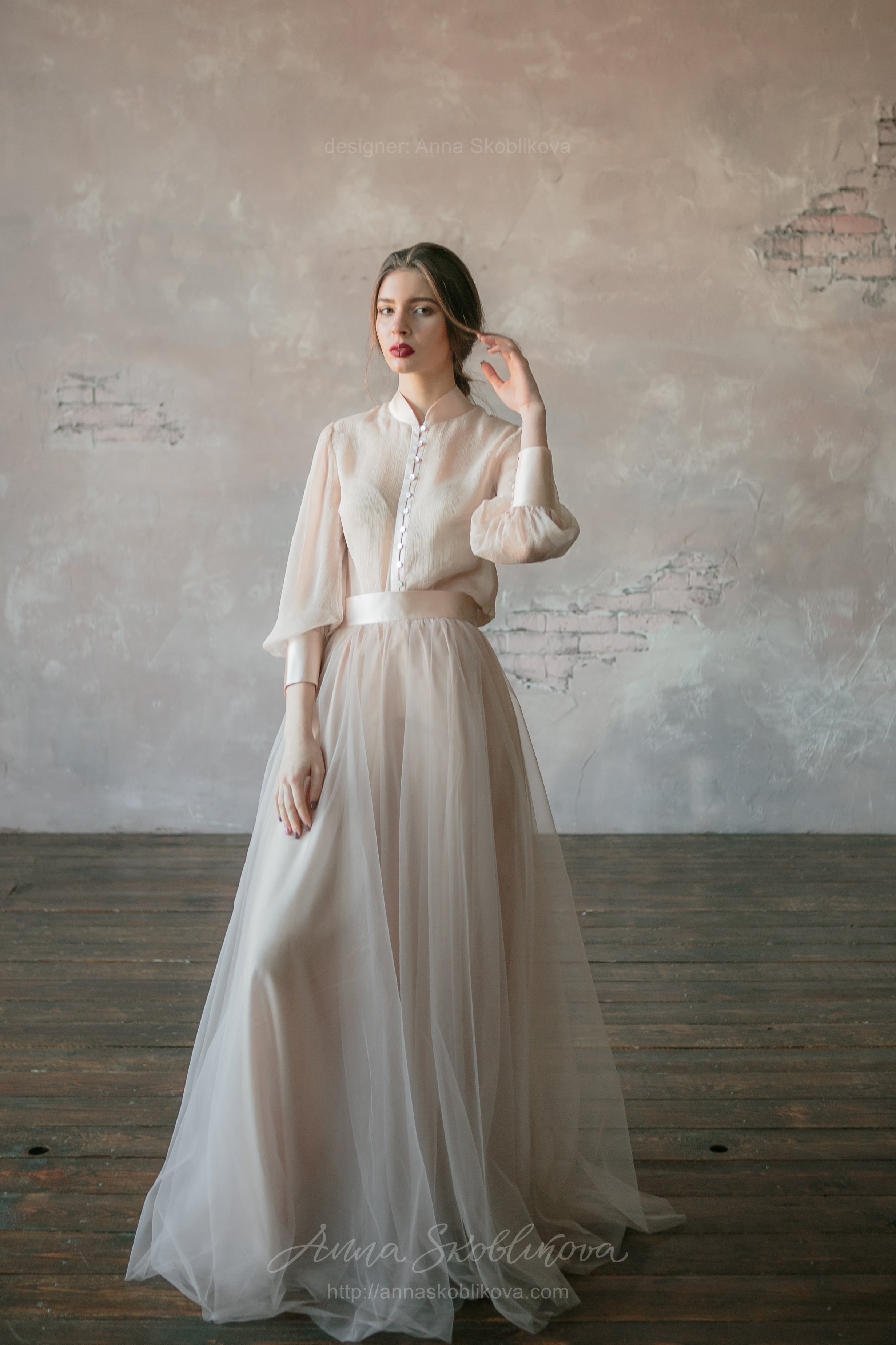 Роскошный пудровый комплект в винтажном духе. Блуза сшита в два слоя из натурального креп-шелка. (жатый шелк, шифон жатый, шелк шифоновый). Манжеты и планка выполнены из атласного шелка – пуговицы из натурального перламутра. Юбка сшита из фатина в несколько слоев, пояс – атласный шелк.