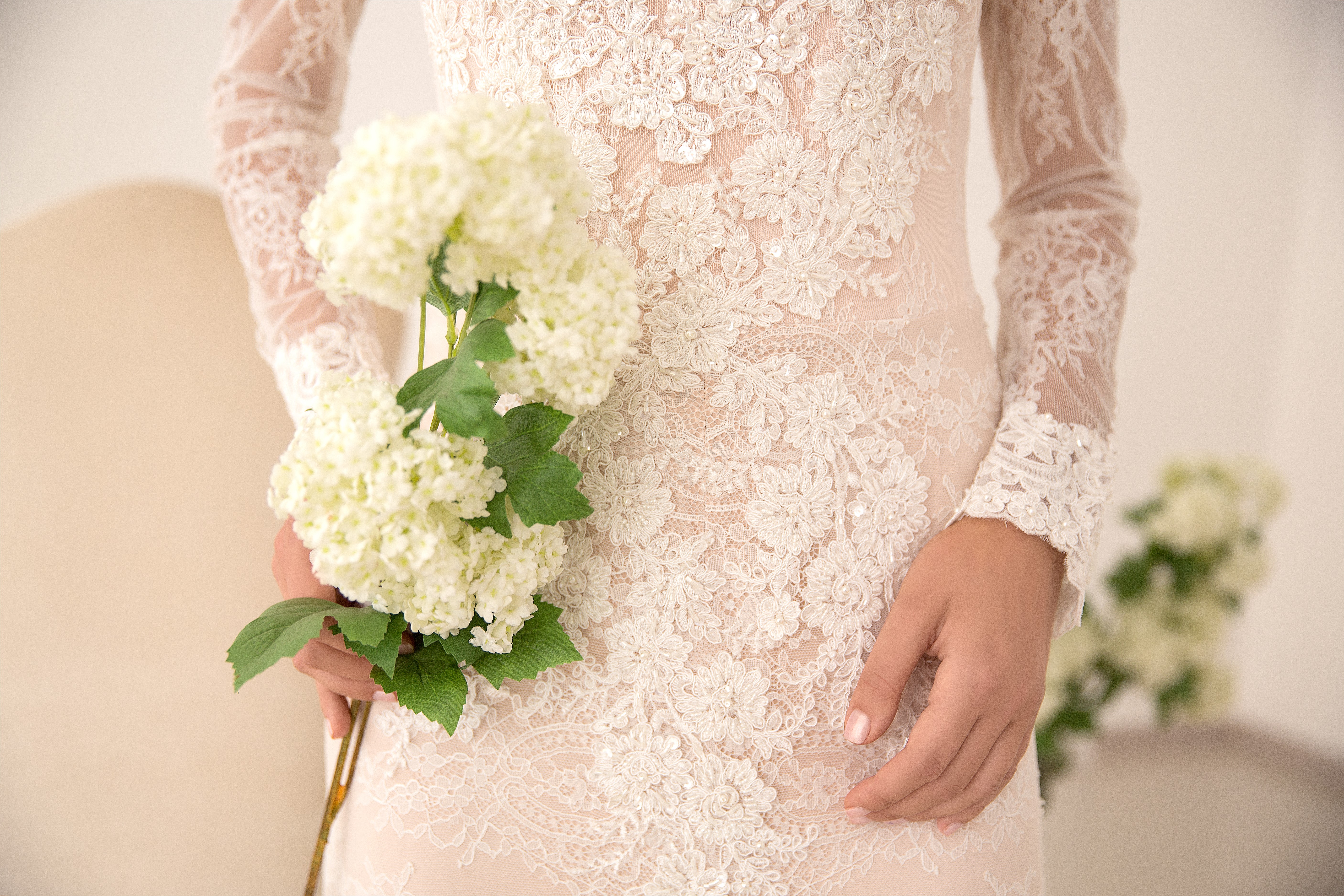 Свадебное платье из кружева шантильи имеет встроенный корсет из натурального хлопка и шелка и шелковую подкладку на юбке цвета пудры.